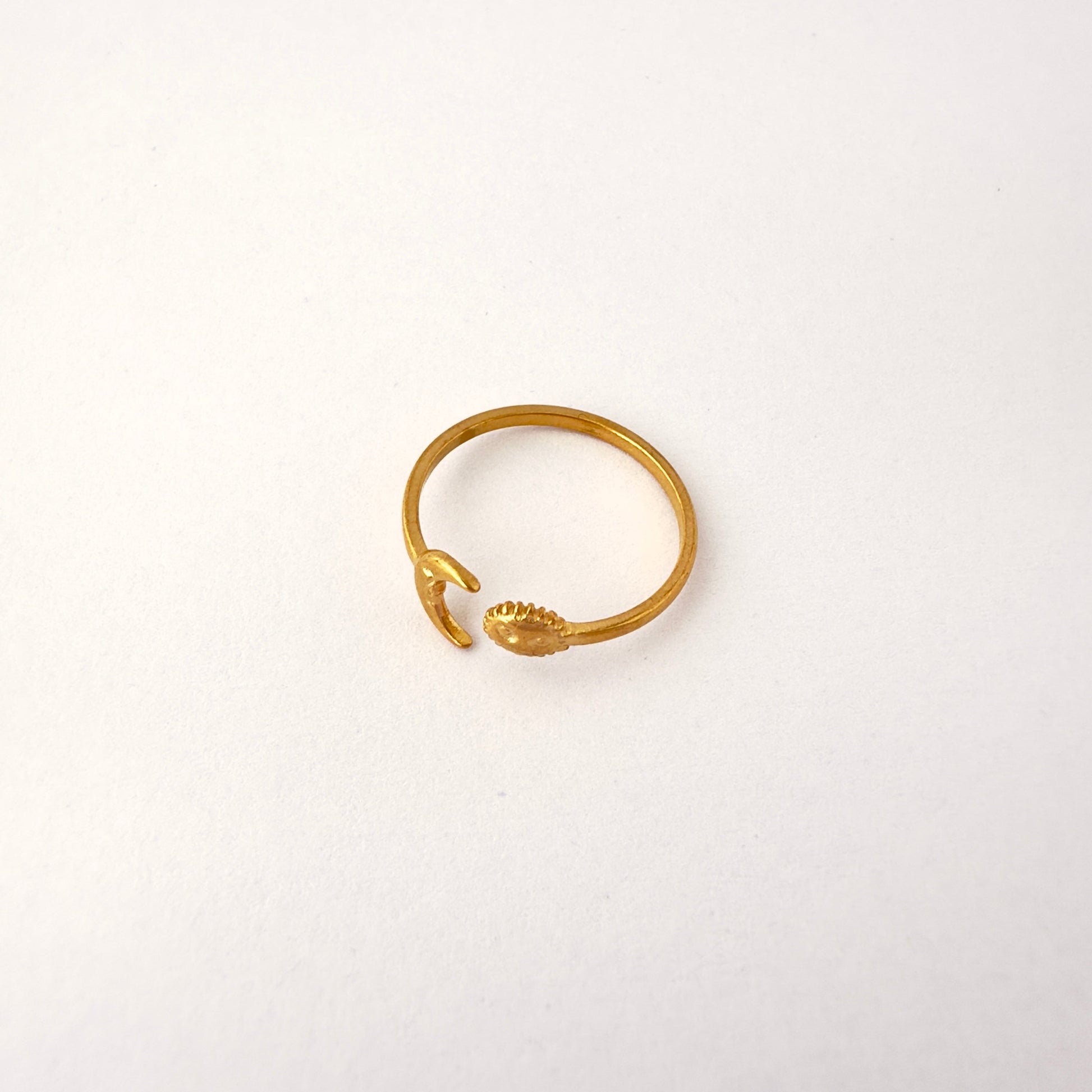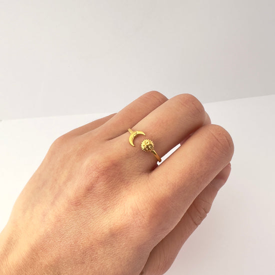 Anillo ajustable con diseño en relieve del sol y la luna, dos símbolos opuestos que se complementan. Su estructura abierta permite adaptarse cómodamente a distintos tamaños de dedo. Ideal para quienes buscan un accesorio con significado y estilo.