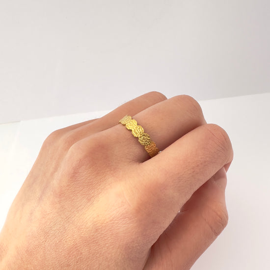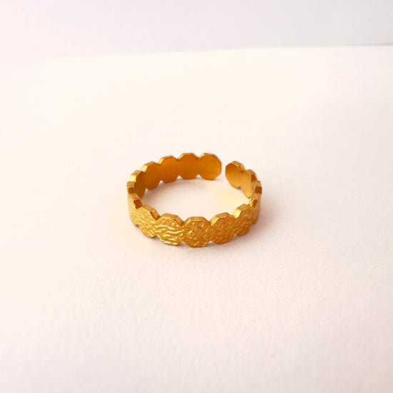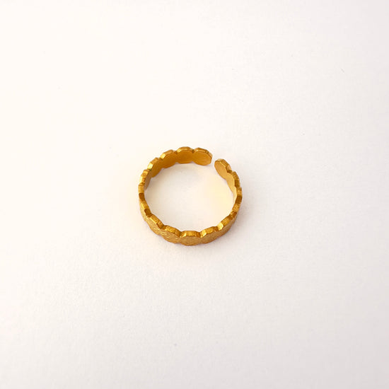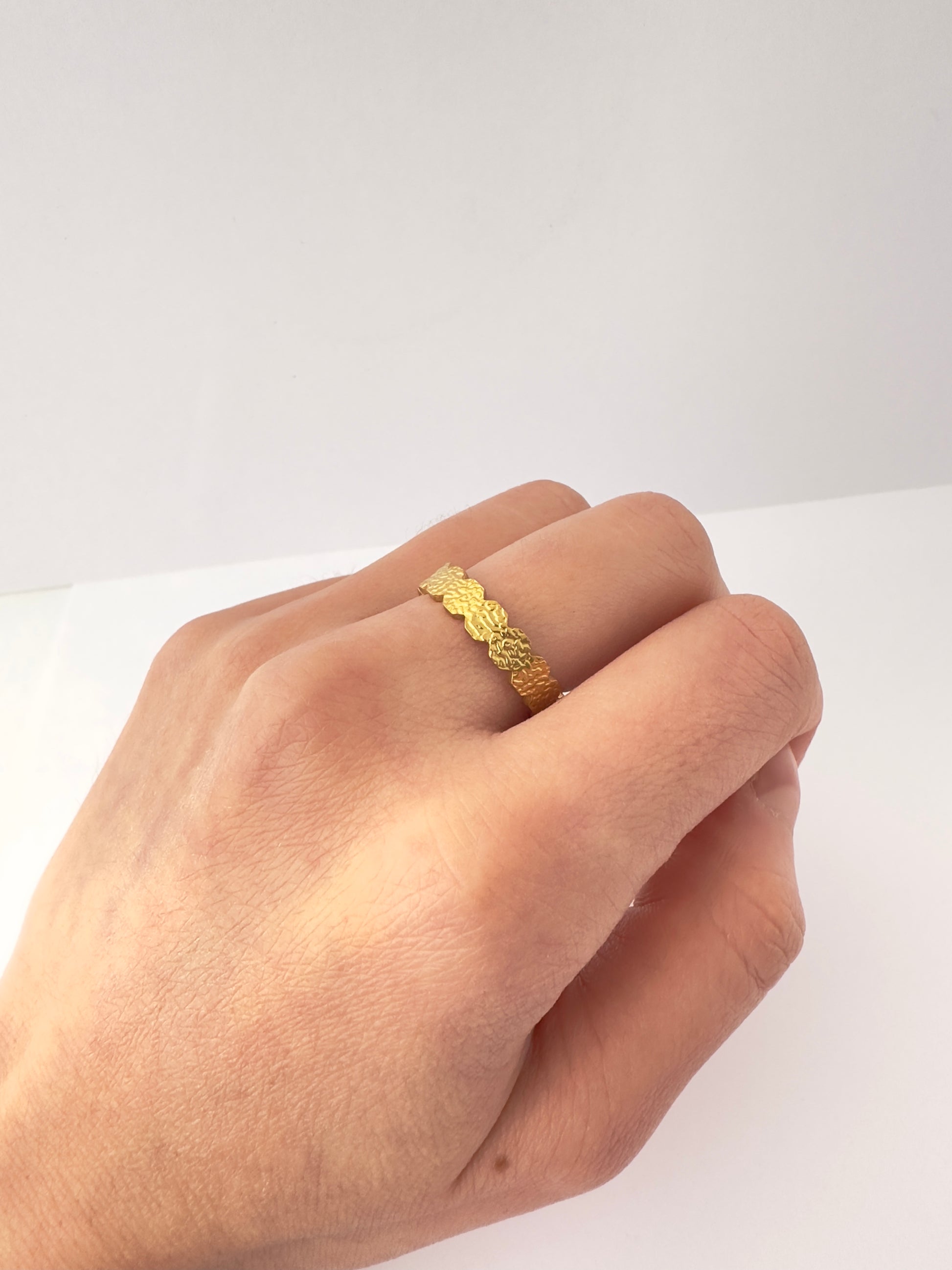 Sutil y con carácter, este anillo destaca por su diseño dentado y su acabado martillado que capta la luz de forma elegante. Su estética moderna y artesanal lo convierte en una pieza versátil, ideal para usar sola o combinar con otros anillos.