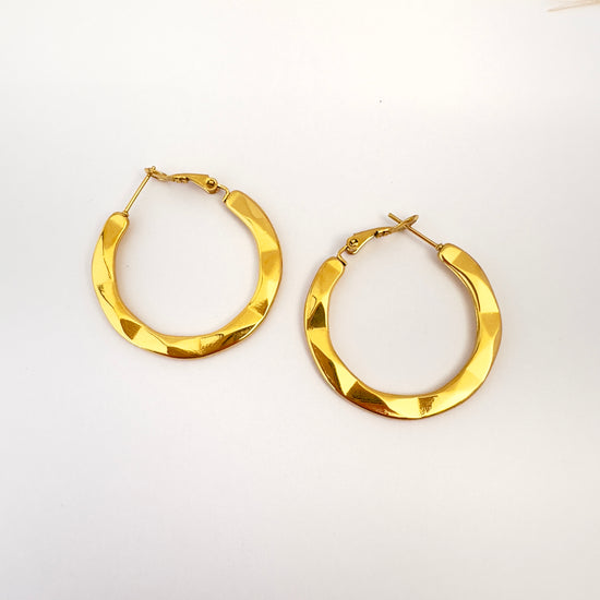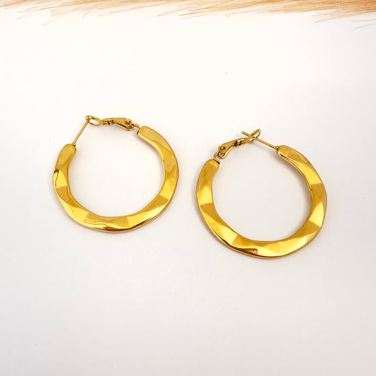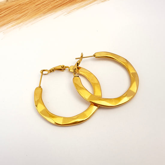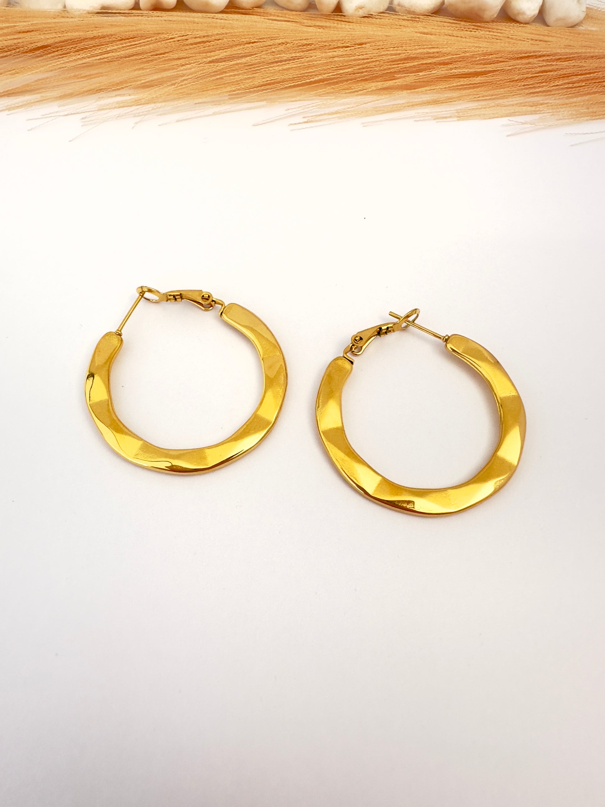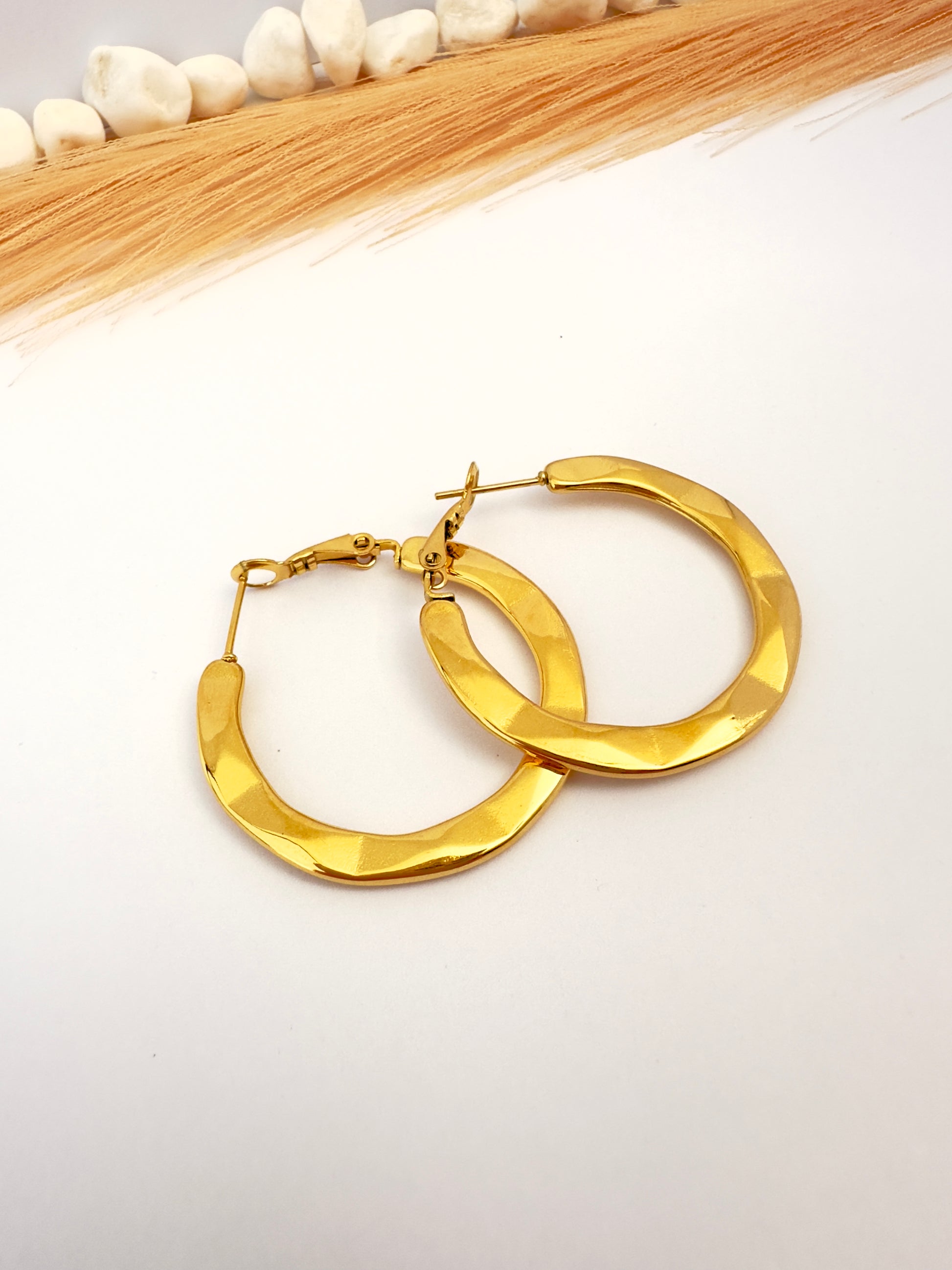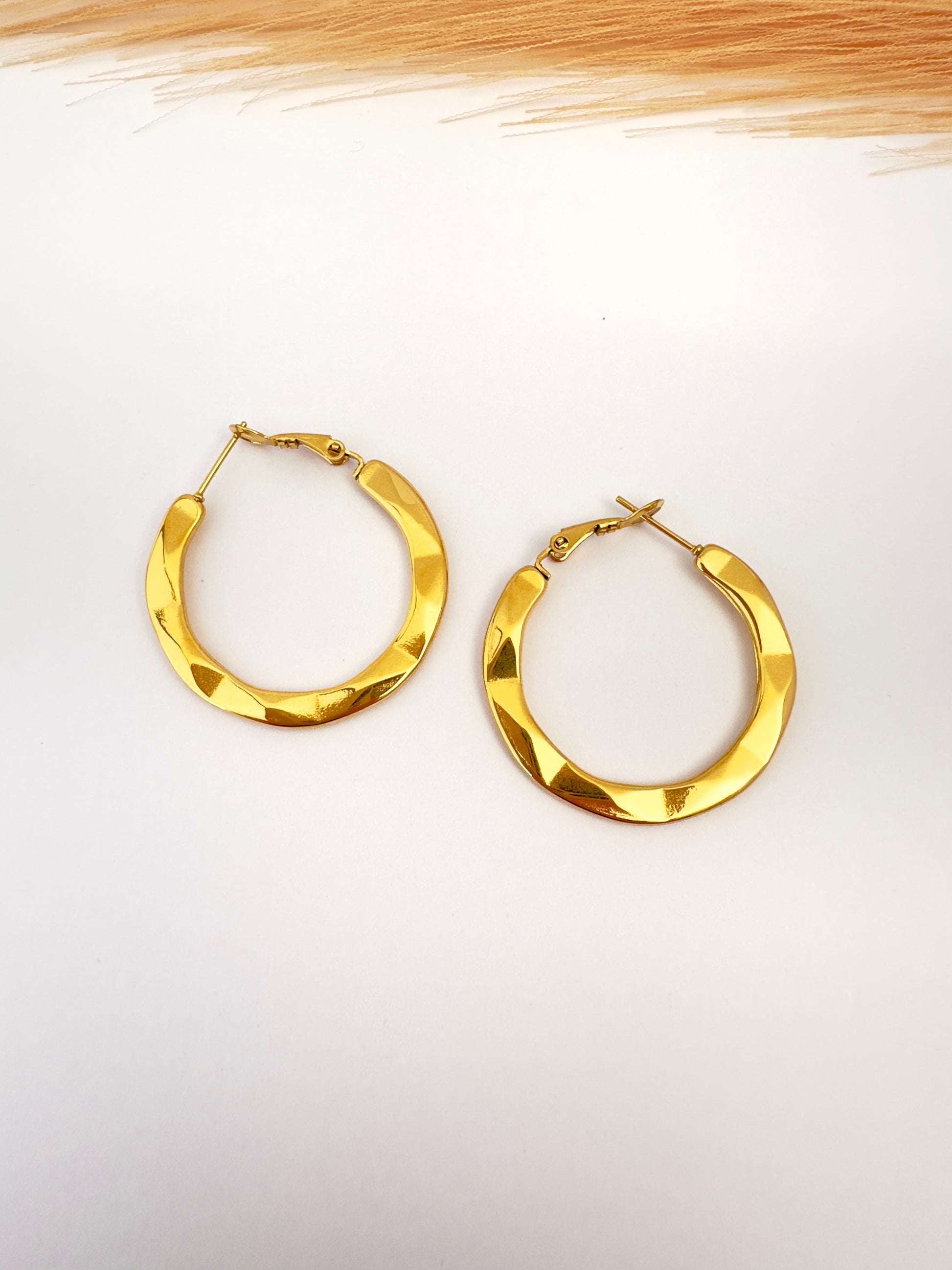 Diseño liviano y elegante con textura facetada que capta la luz como un halo dorado. Un modelo atemporal, ideal para elevar cualquier look.