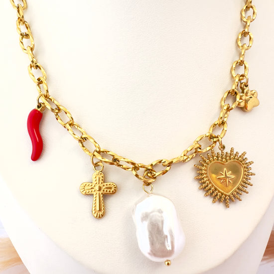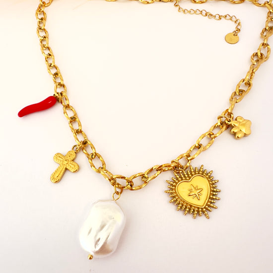 Un diseño con alma y carácter. El Collar Místico Dorado es una fusión de símbolos espirituales y elementos cargados de energía positiva: cruz, perla, corazón solar, ajíes y más. Un accesorio con personalidad, ideal para emprendedoras que buscan ofrecer joyas con significado.