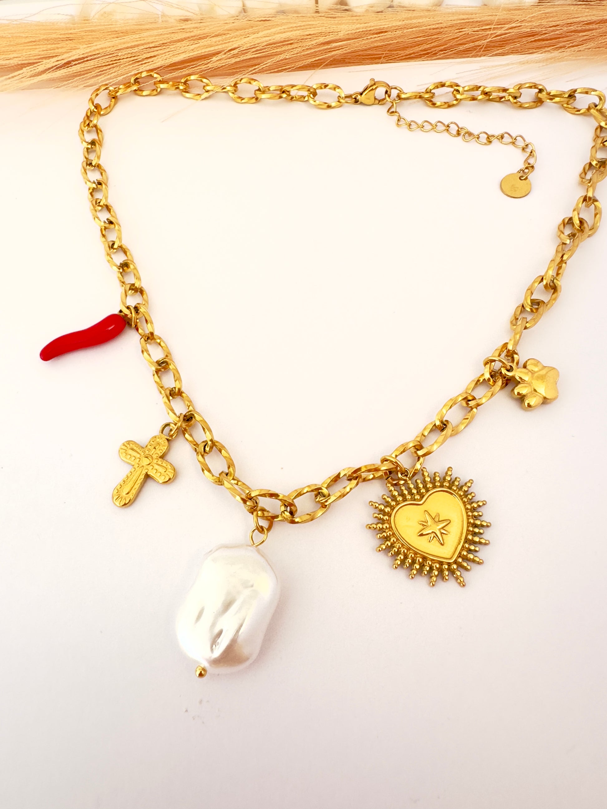 🔸 Dijes: cruz ornamental, perla irregular, corazón solar, ajíes y huella.