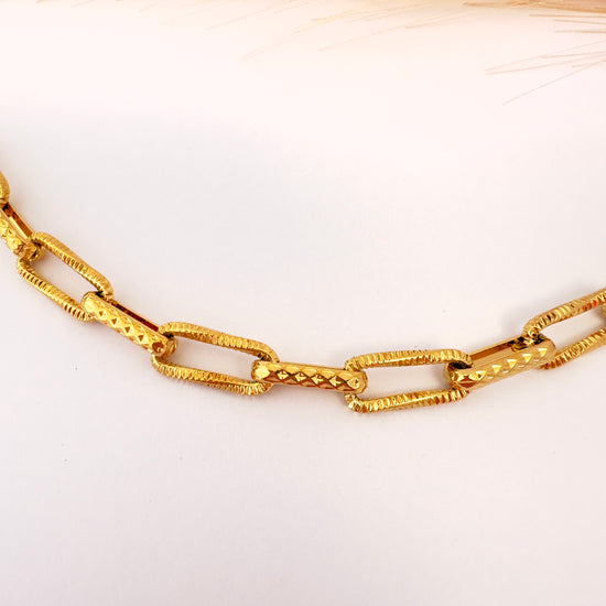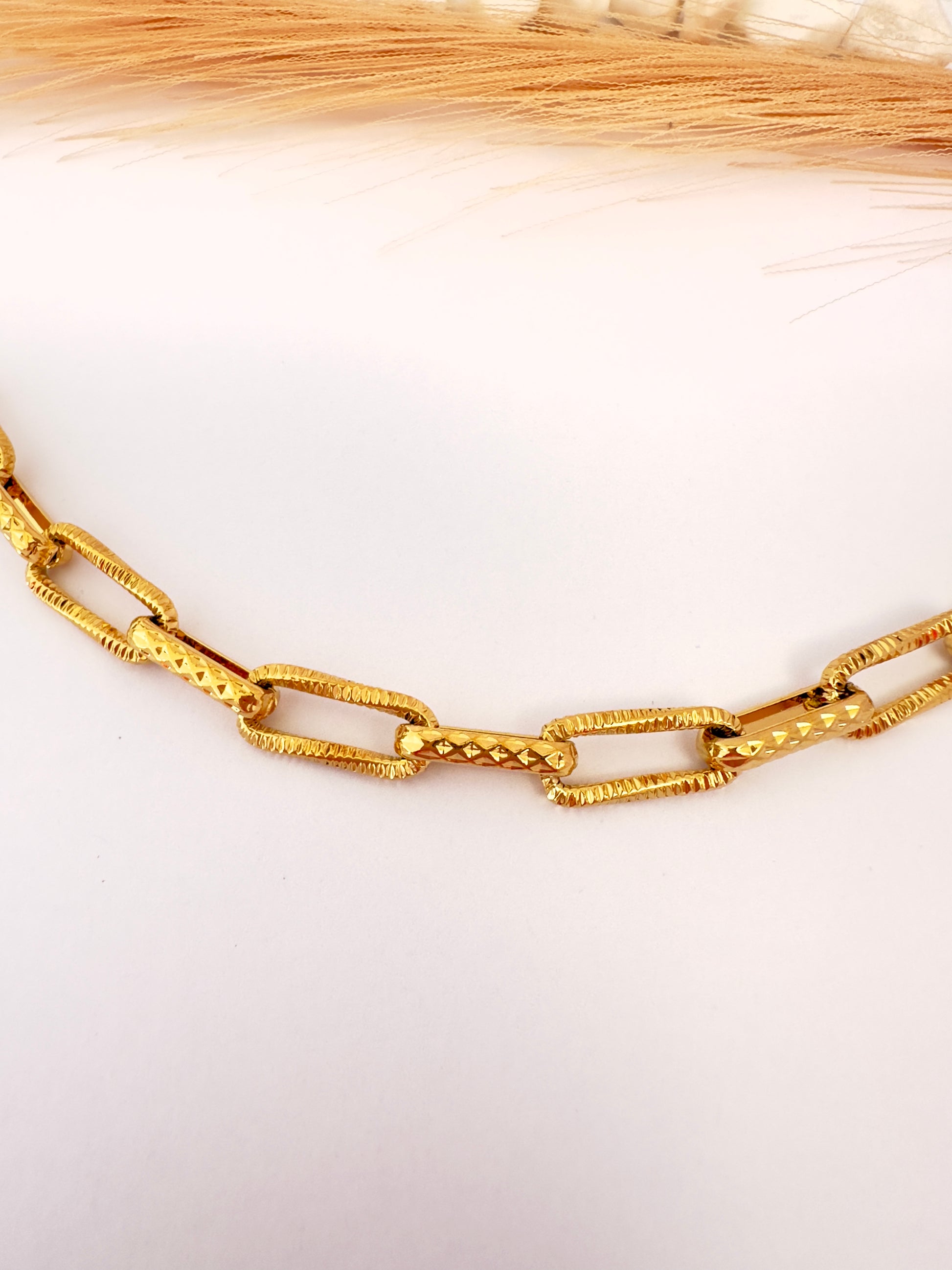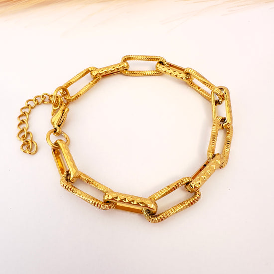 Un diseño con presencia y personalidad. Esta pulsera de eslabones texturizados enchapados en oro es ideal para quienes aman destacar con accesorios poderosos y versátiles.