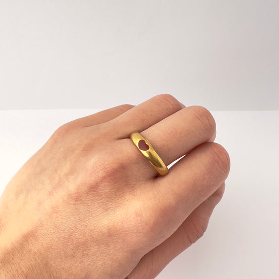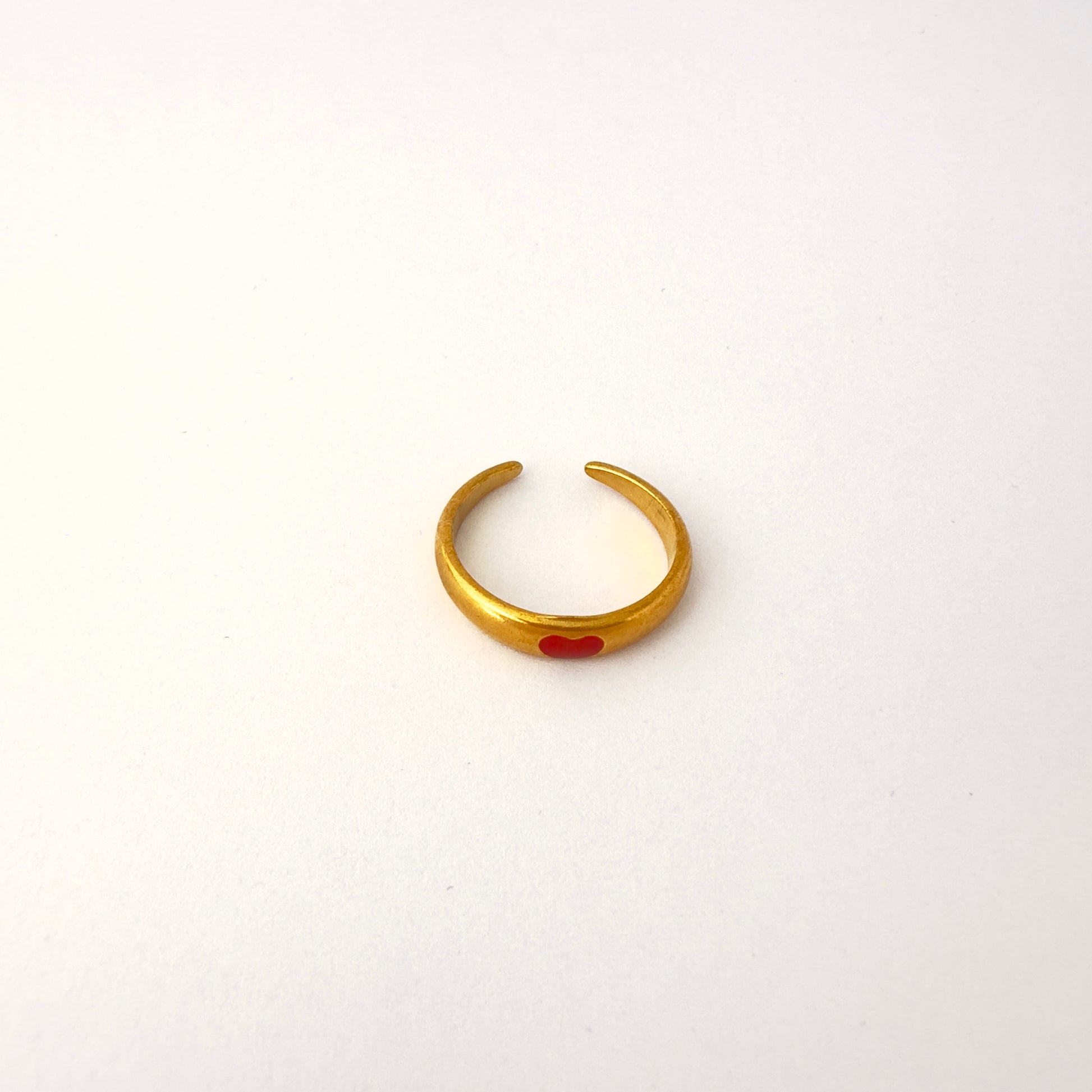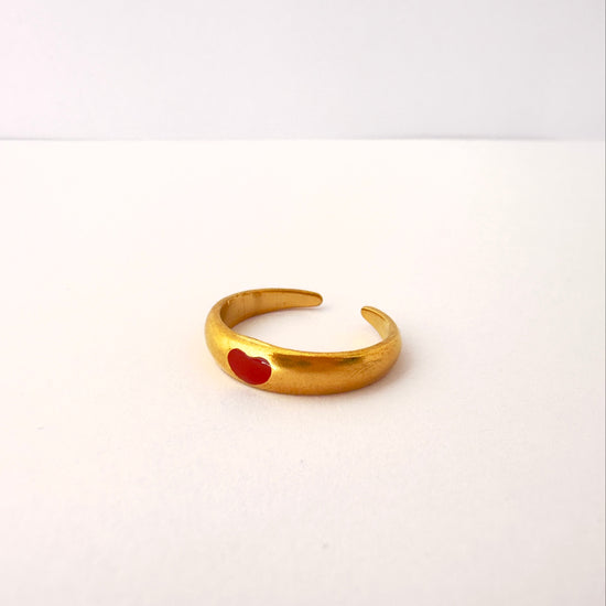 Este anillo combina el brillo del oro con un pequeño corazón esmaltado en rojo, creando una pieza delicada y significativa. Ideal para representar amor propio, cariño o detalles románticos sin exagerar.