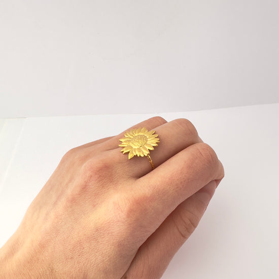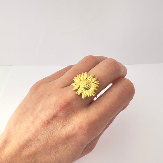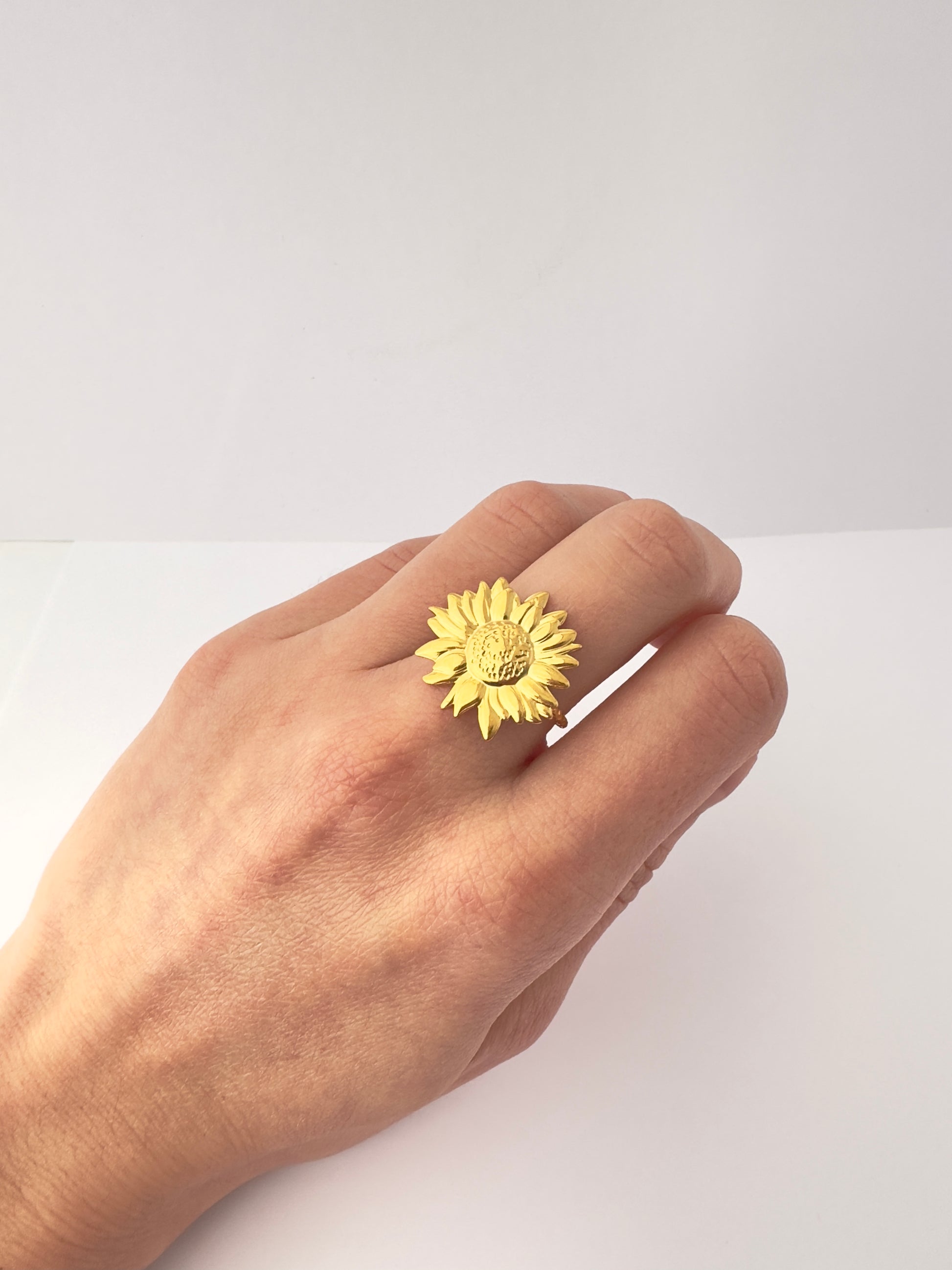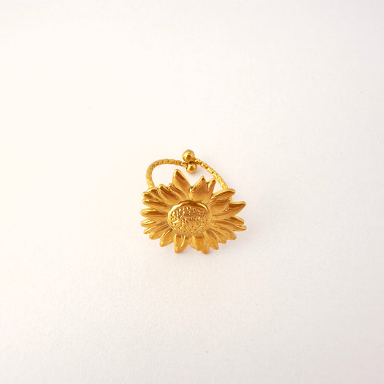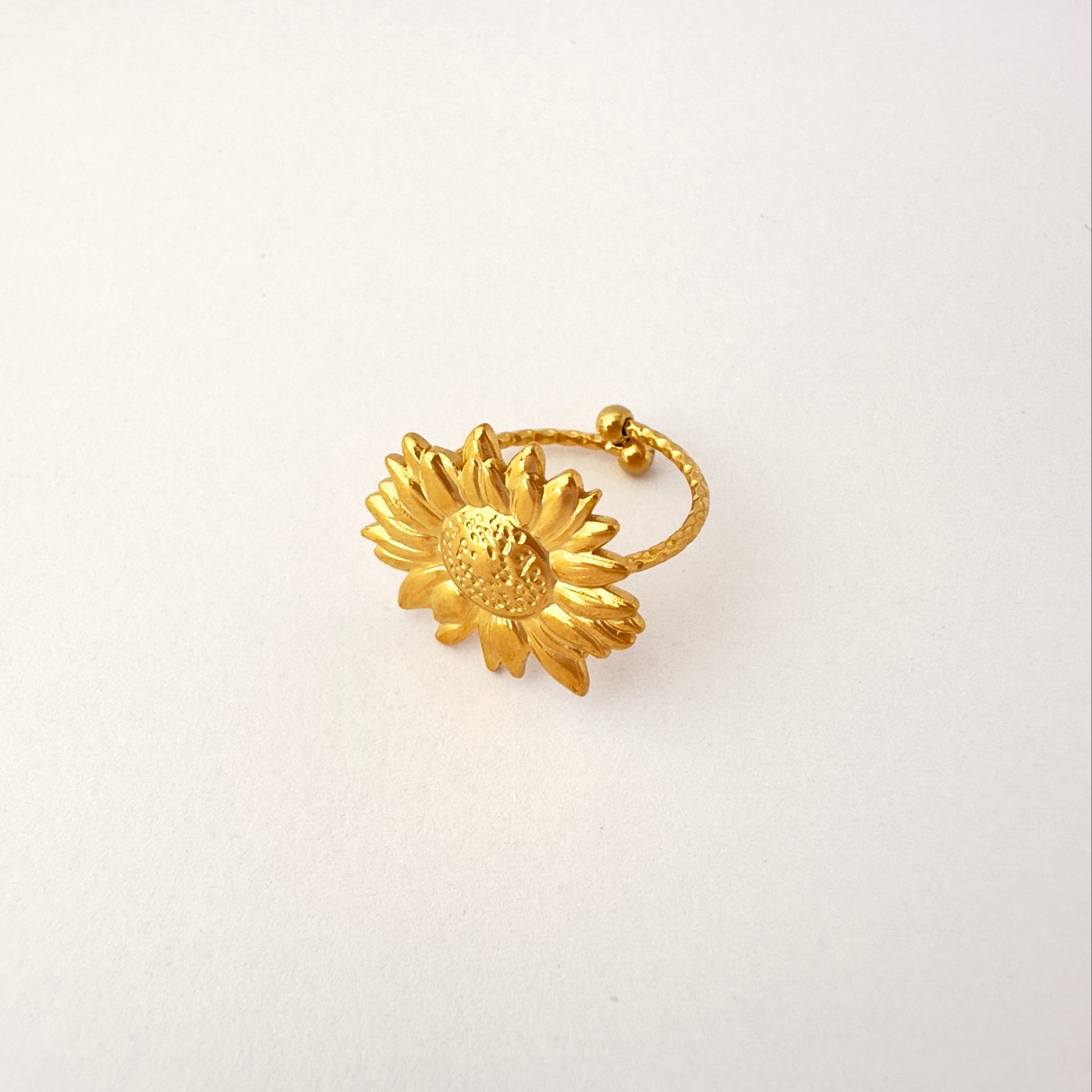 Un anillo ajustable con diseño de girasol enchapado en oro. Su estructura detallada y relieve lo convierten en una pieza llamativa y alegre, ideal para quienes buscan destacar con un toque de naturaleza en sus looks.