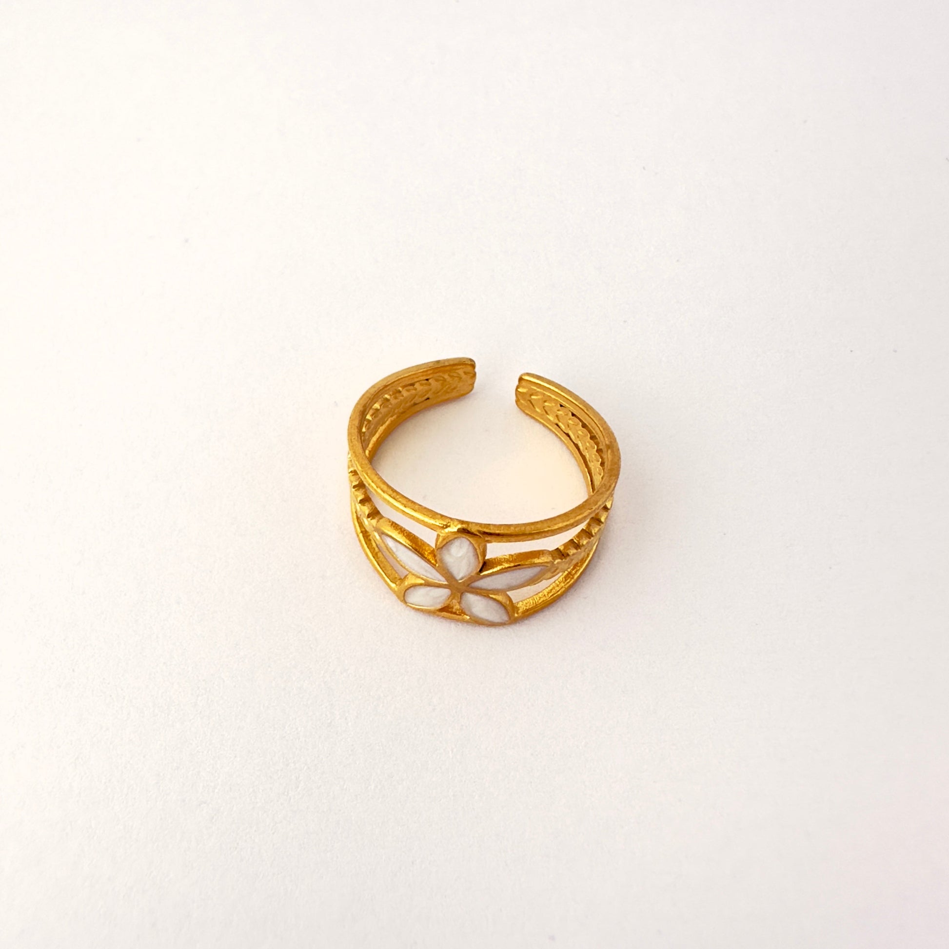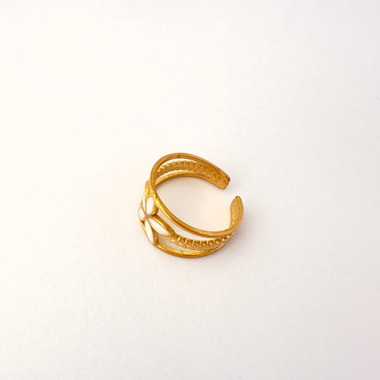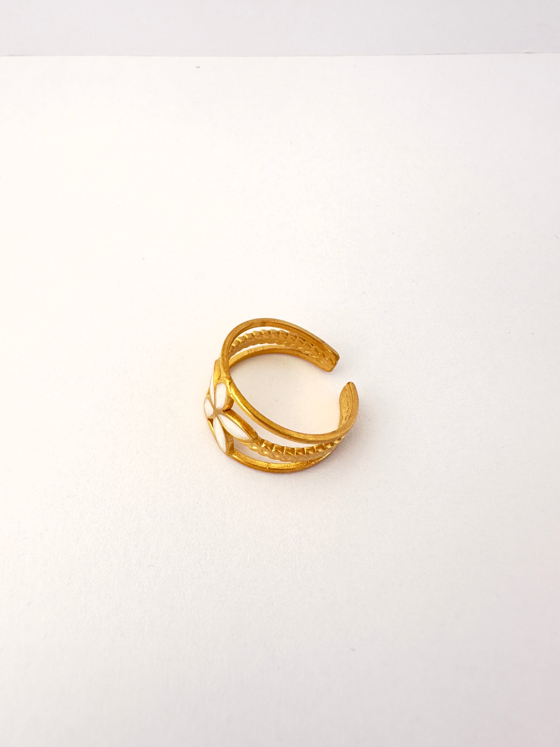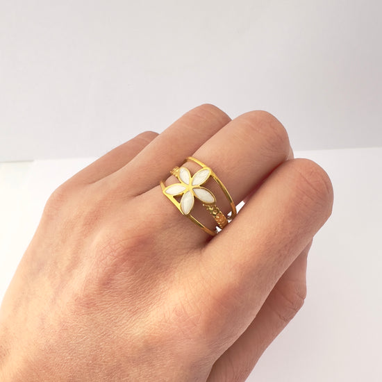 Inspirado en la belleza de las flores que se abren bajo la luz suave de la luna. Su diseño romántico y brillante, con pétalos blancos y detalles dorados, lo convierte en una joya ideal para resaltar en cualquier look.