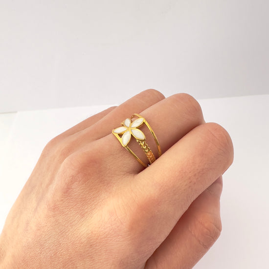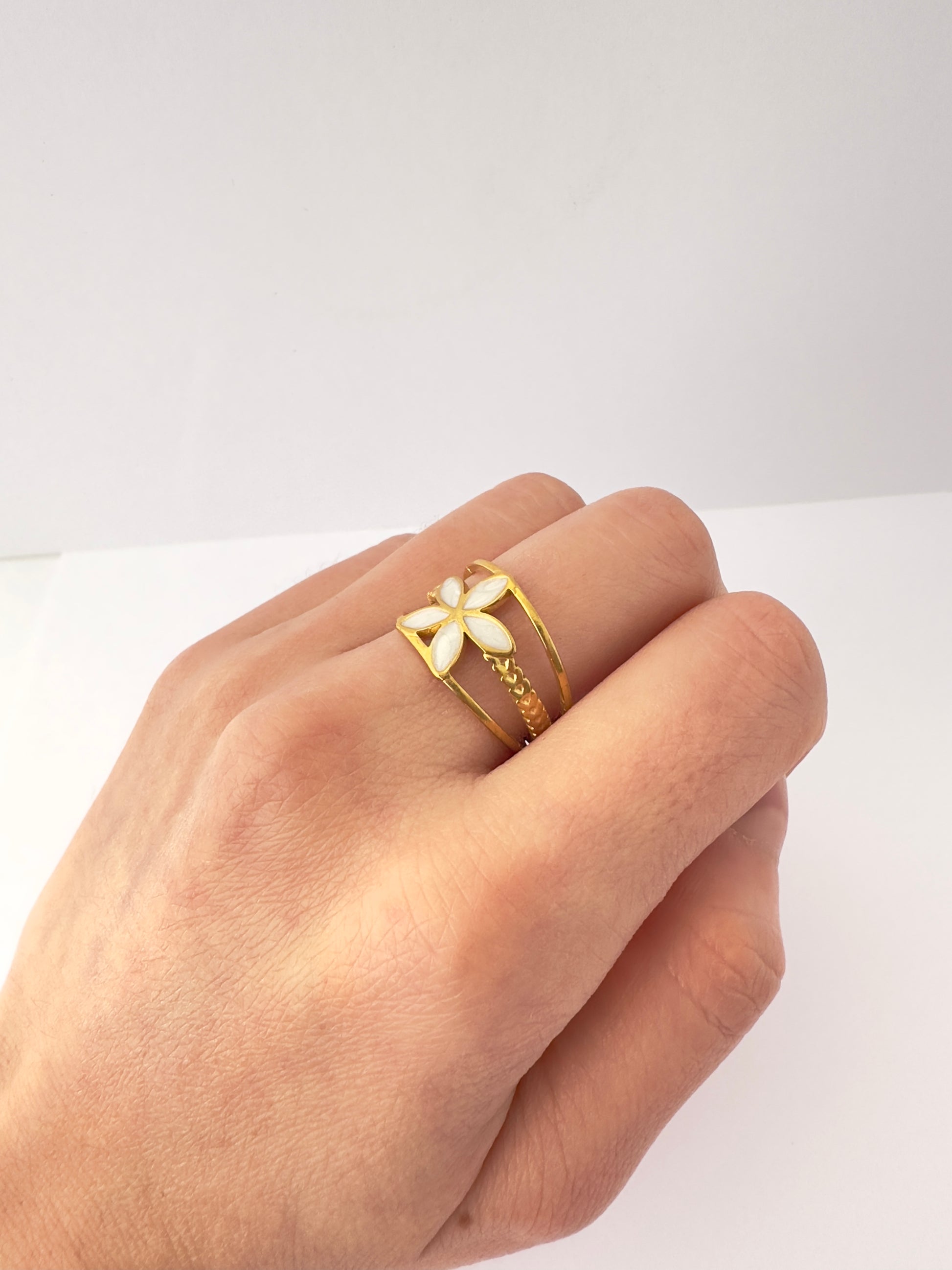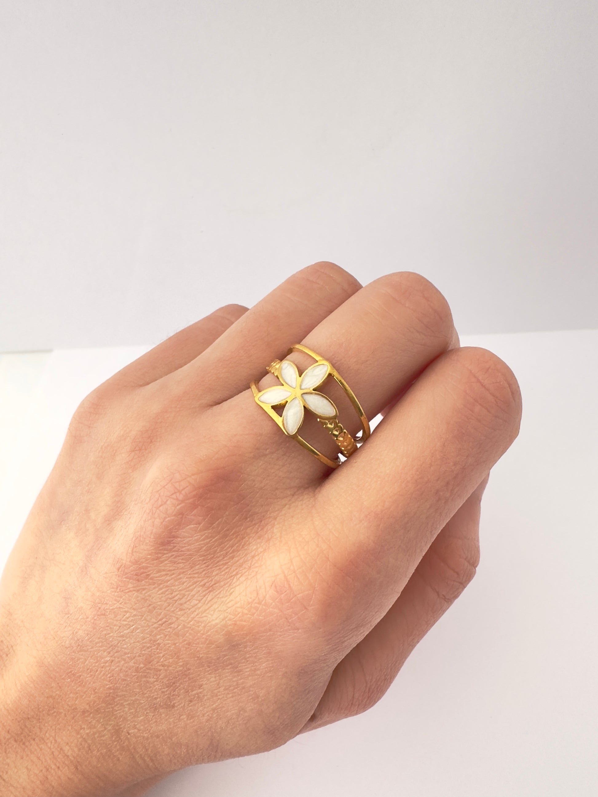 Diseño: Flor de 5 pétalos blancos esmaltados, con doble banda trenzada