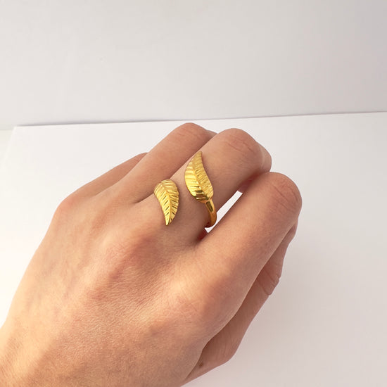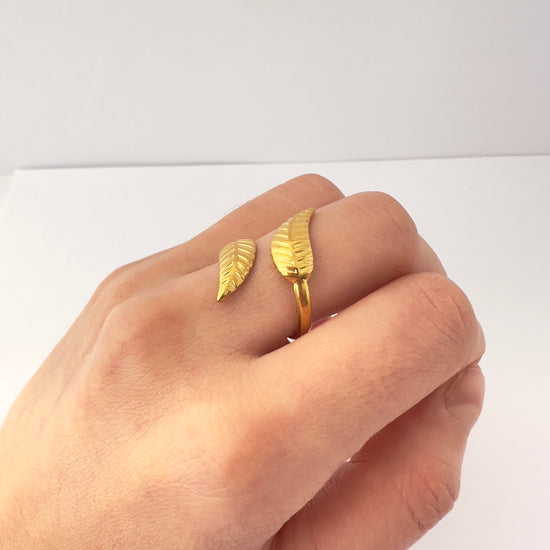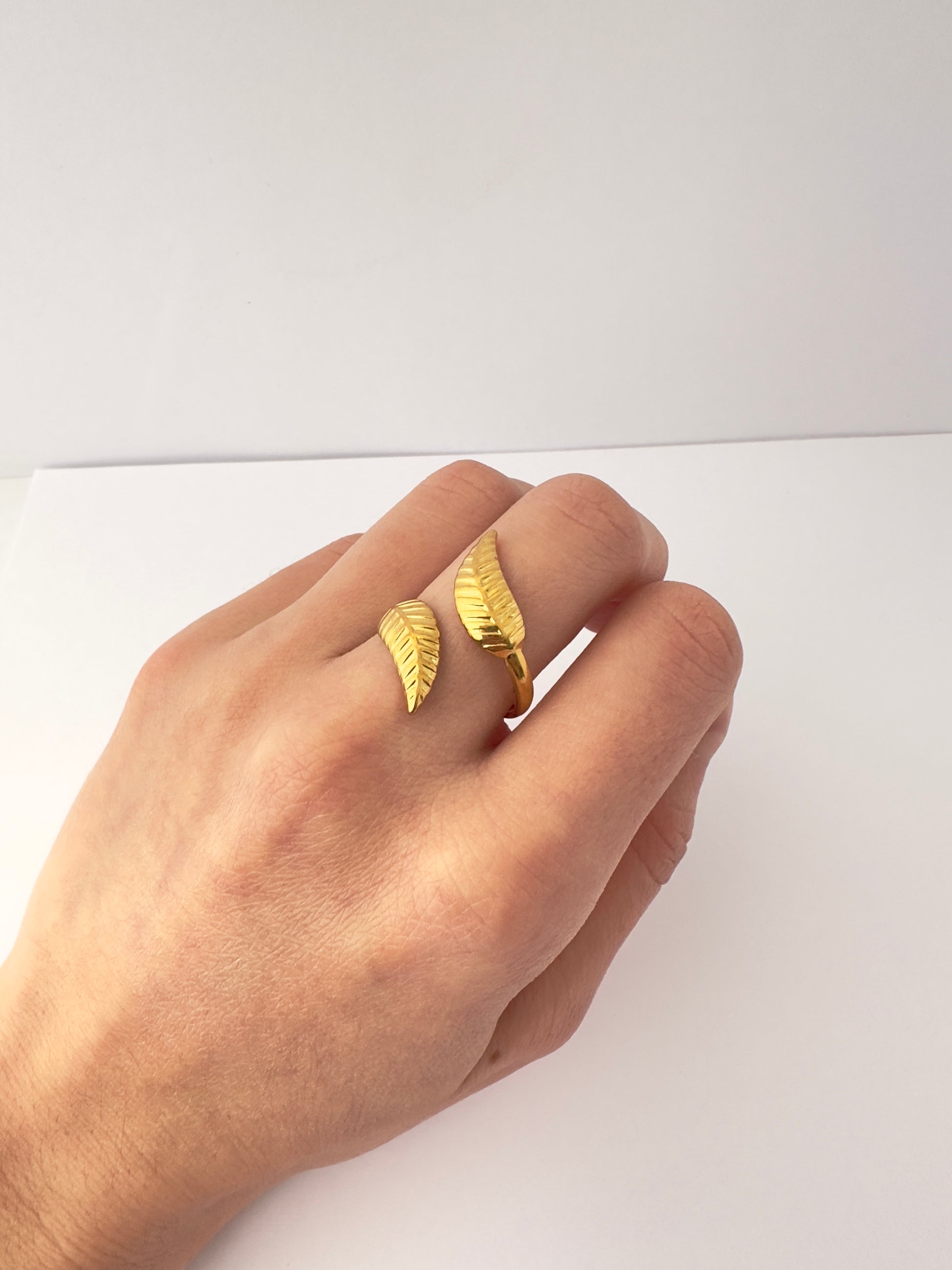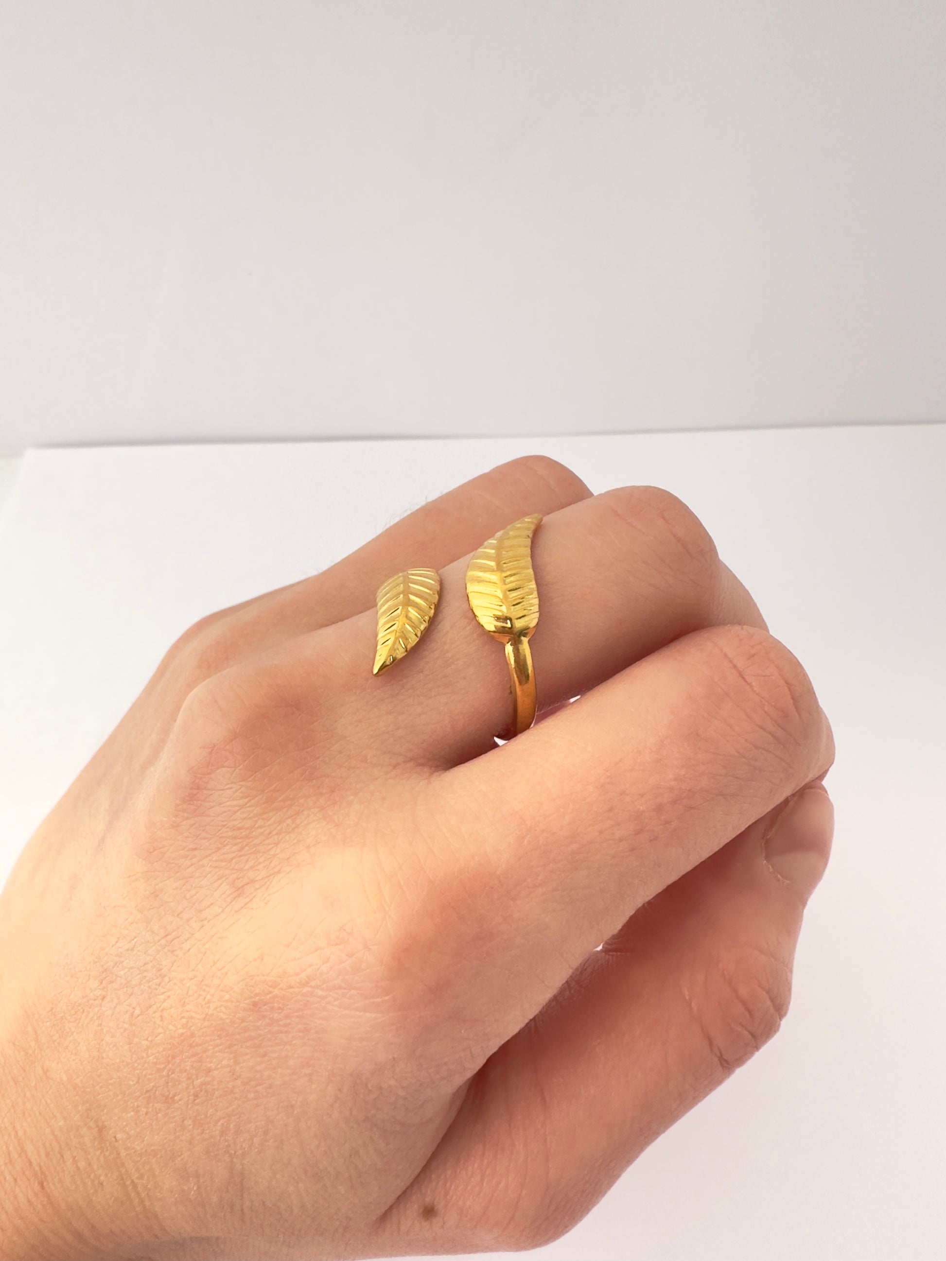 Inspirado en la naturaleza, este anillo ajustable presenta un diseño envolvente de hojas finamente talladas que simbolizan renovación, crecimiento y conexión con lo esencial. Su acabado en oro de 18 quilates le aporta un brillo cálido y elegante, ideal para usar a diario o regalar con intención.