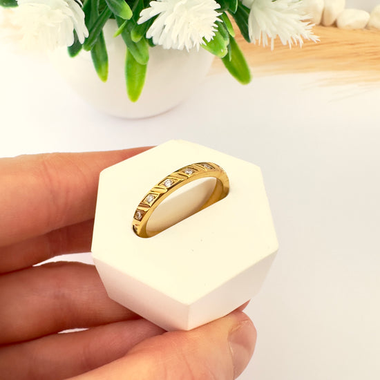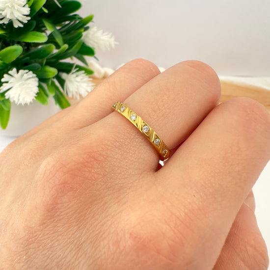Un clásico que nunca falla. Este anillo tipo cintillo combina simplicidad y sofisticación con incrustaciones de circonitas que capturan la luz desde cada ángulo.