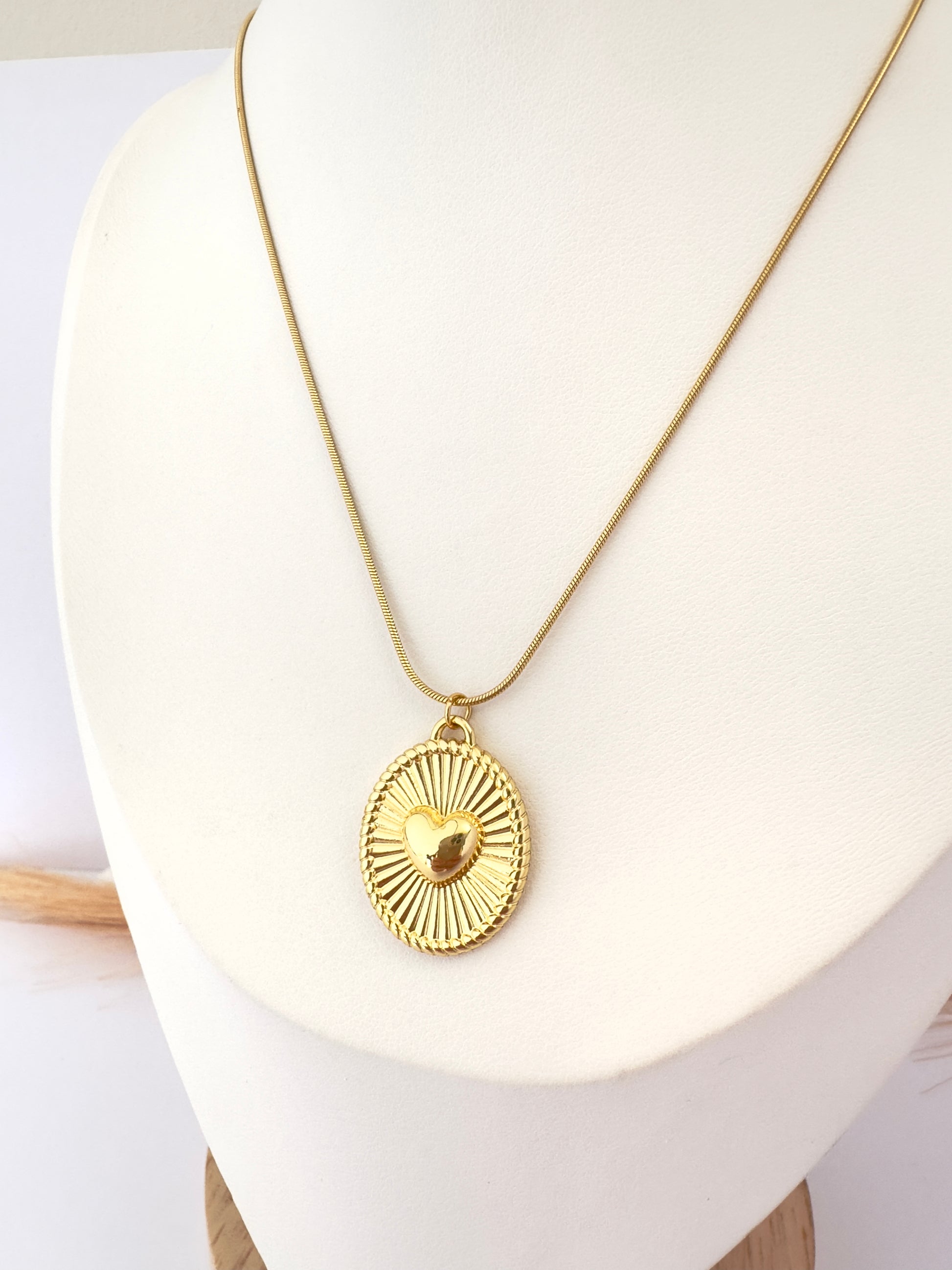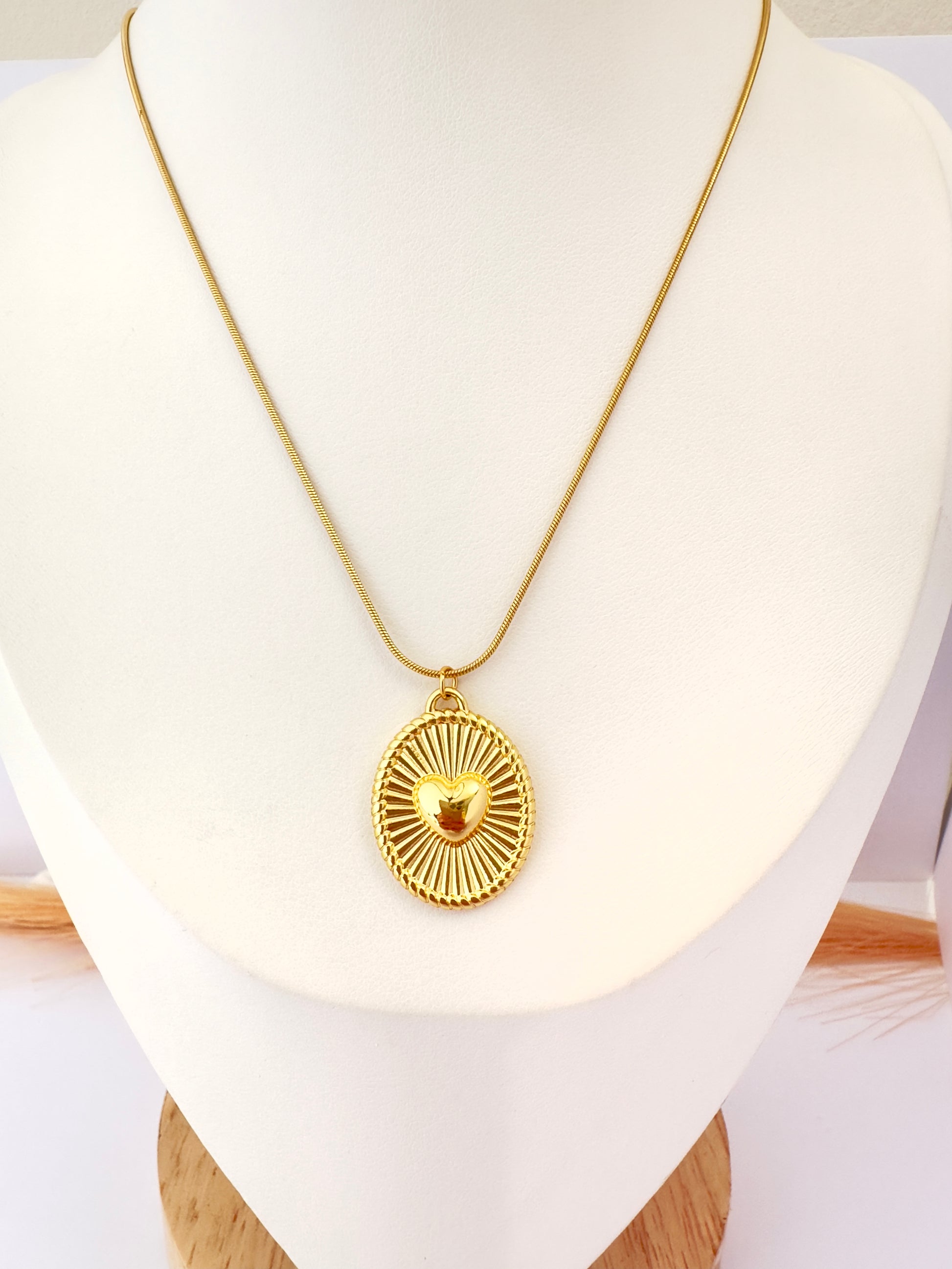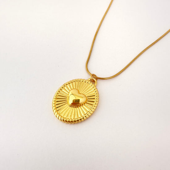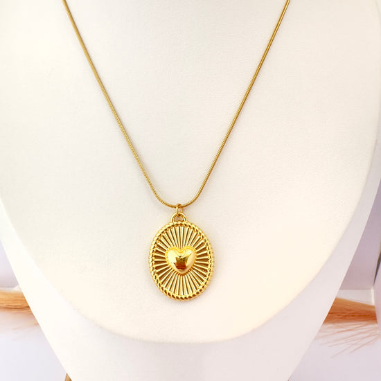 🔸 Dije medallón ovalado con diseño solar y corazón en el centro