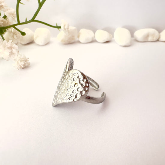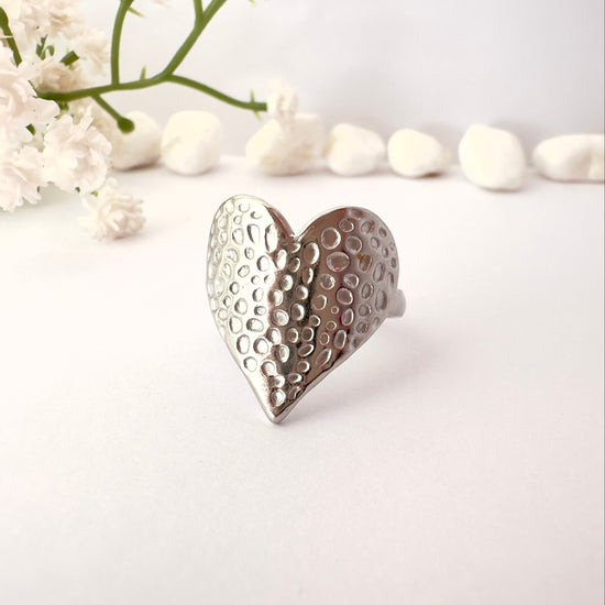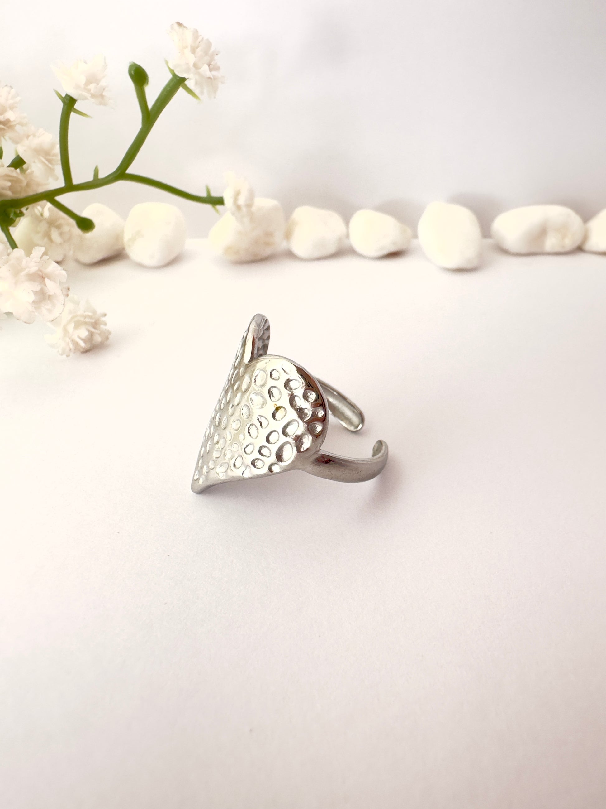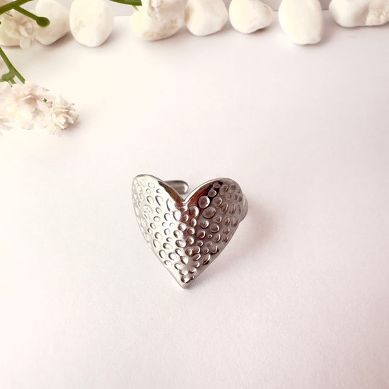 Un diseño que expresa ternura, fuerza y elegancia. El Anillo Amor plateado presenta un corazón de gran tamaño con textura martillada en toda su superficie, reflejando la luz con un brillo único. Es una pieza llamativa que eleva cualquier look, ya sea casual o sofisticado.