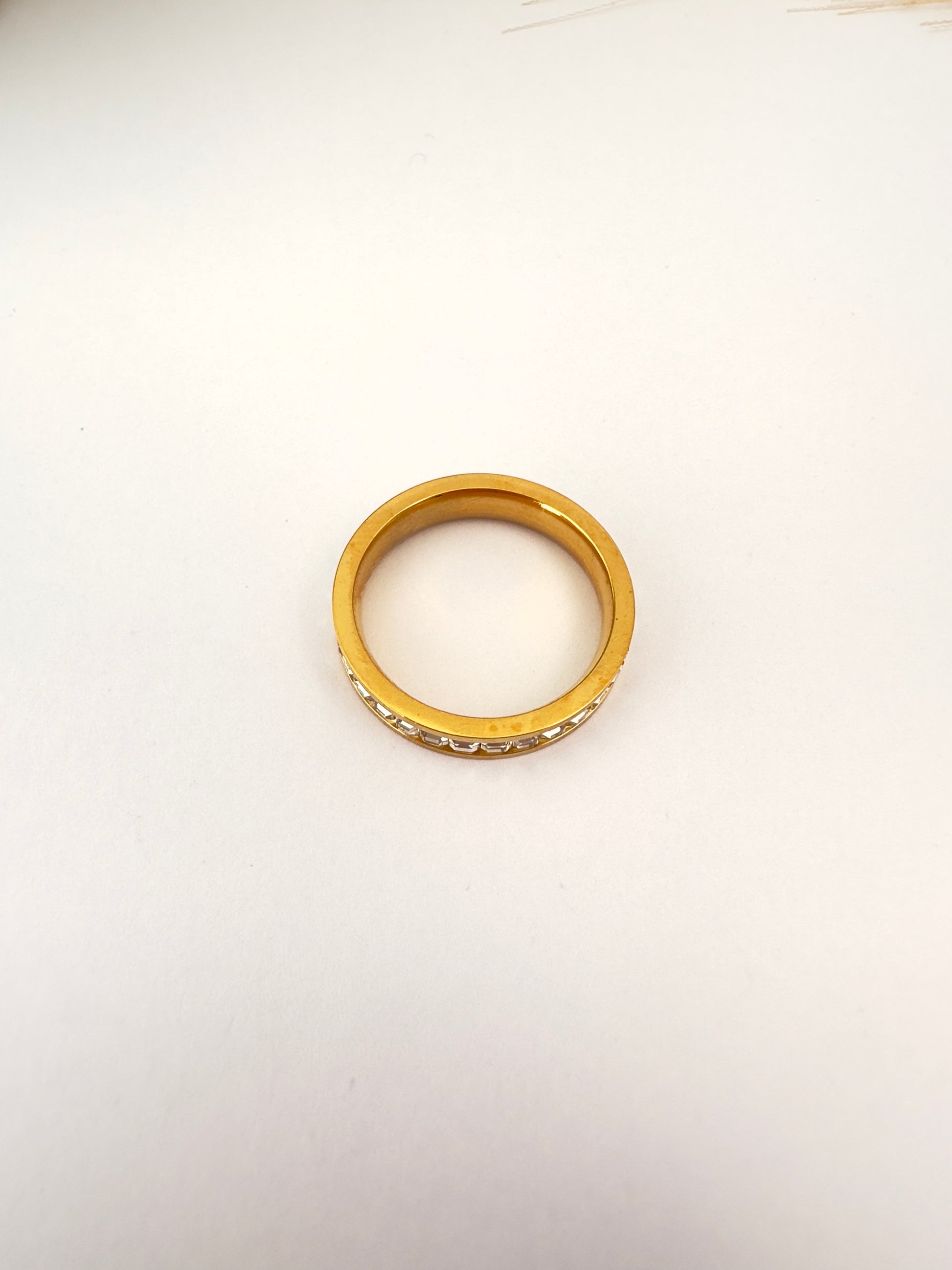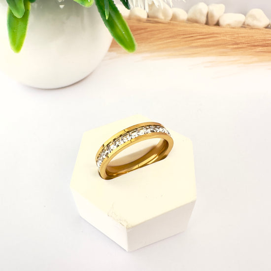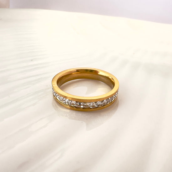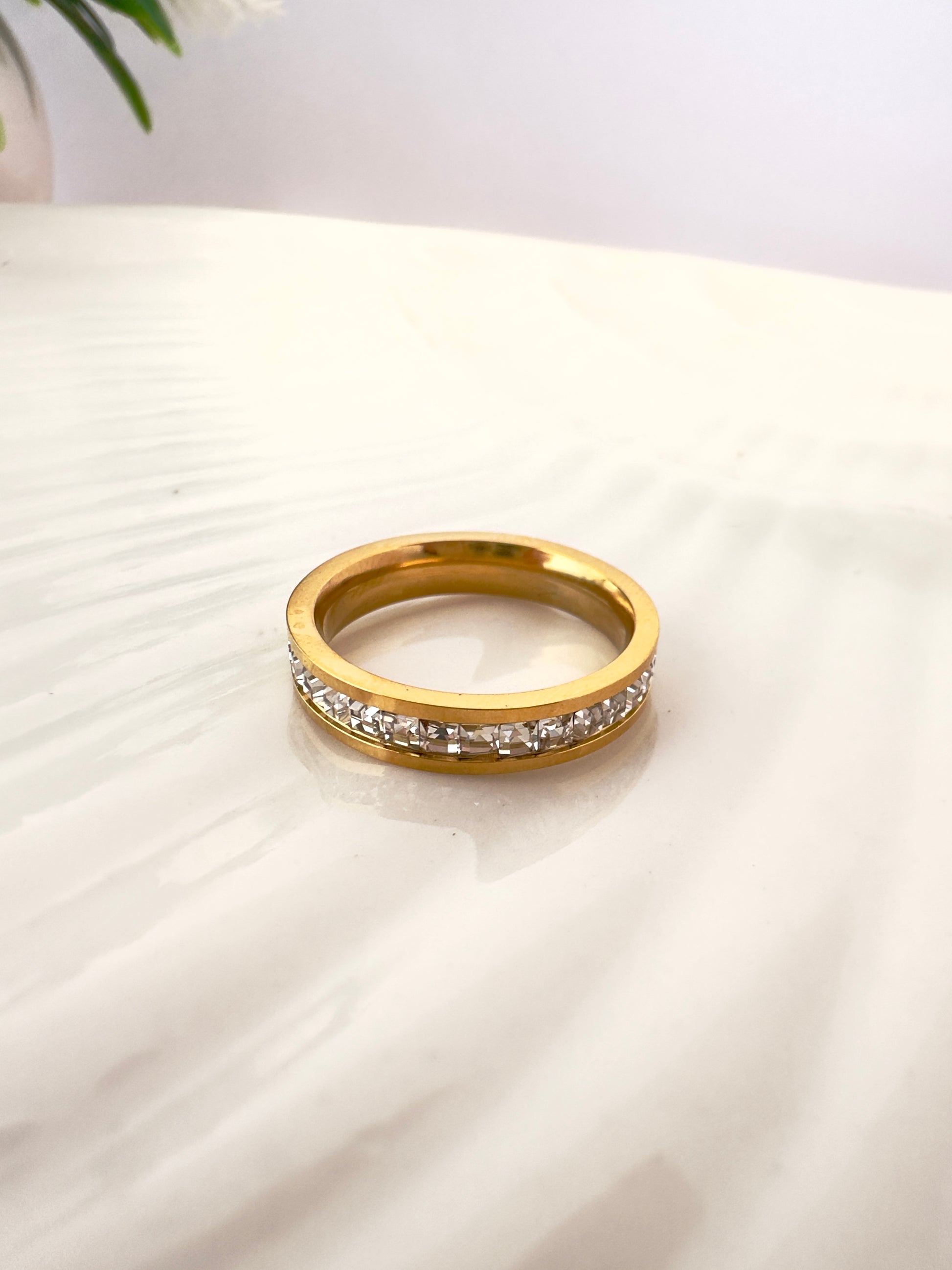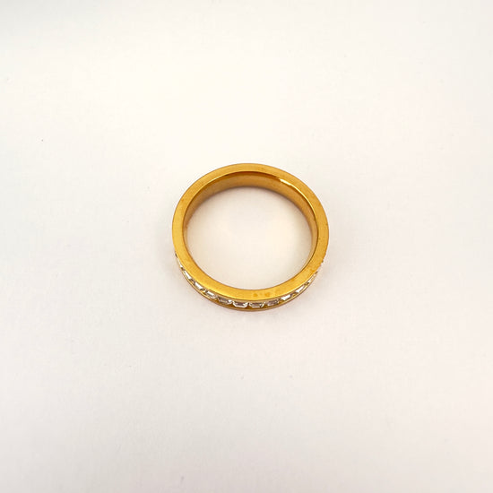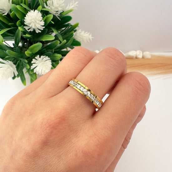Este anillo tipo cintillo cuenta con una delicada hilera de circonitas que aportan un toque de luz sin sobrecargar tu estilo. Su diseño clásico lo convierte en un accesorio ideal para usar solo o combinar con otros anillos.