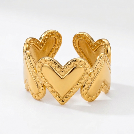Anillo de diseño llamativo con corazones en relieve y detalles texturizados, que aportan un estilo sofisticado y lleno de personalidad.