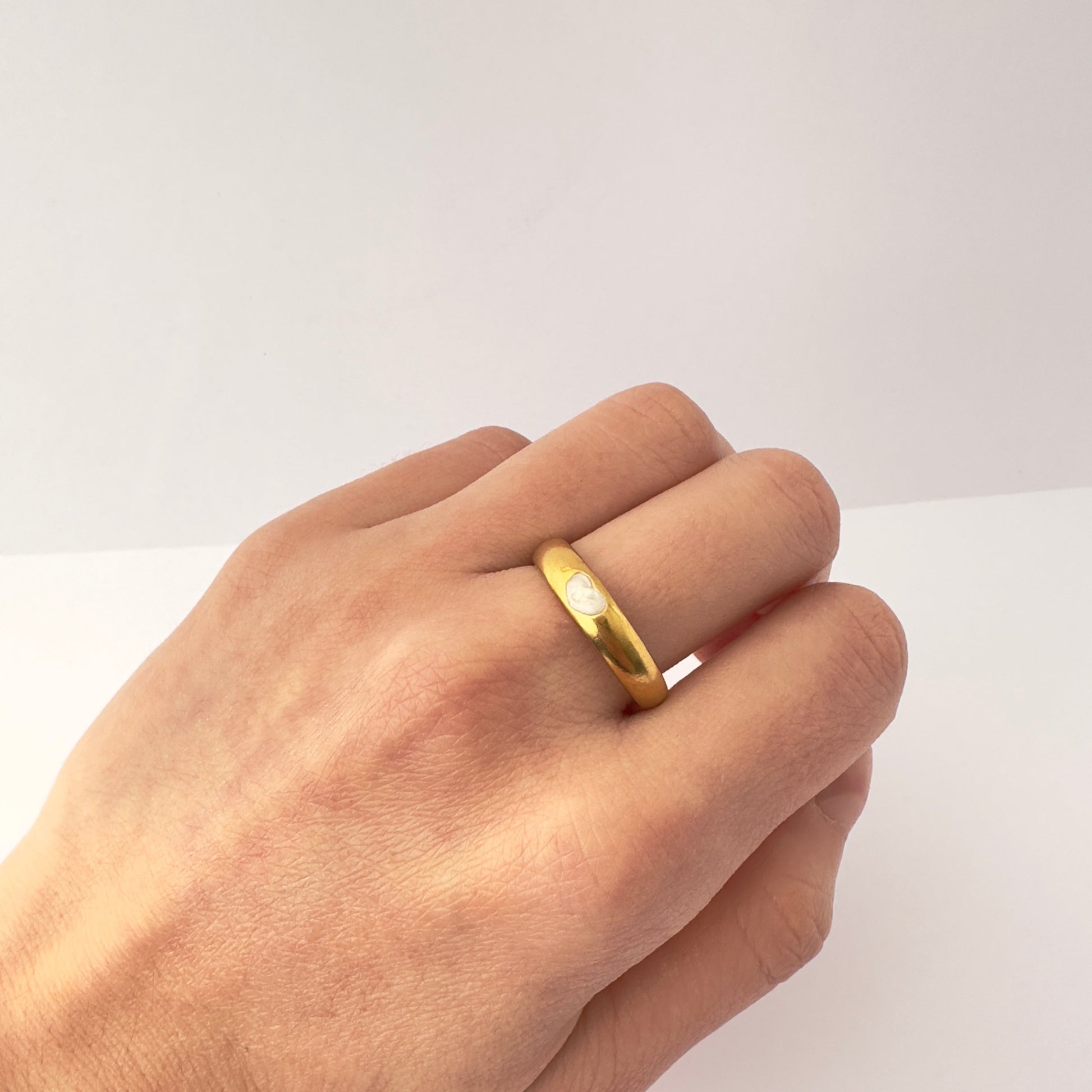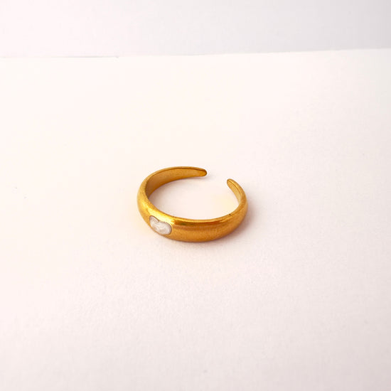 Anillo tipo banda gruesa, con un delicado corazón blanco nacarado al centro. Un diseño minimalista y elegante, perfecto para llevar solo o en combinación con otros anillos.
