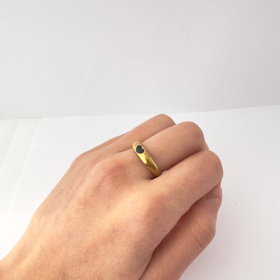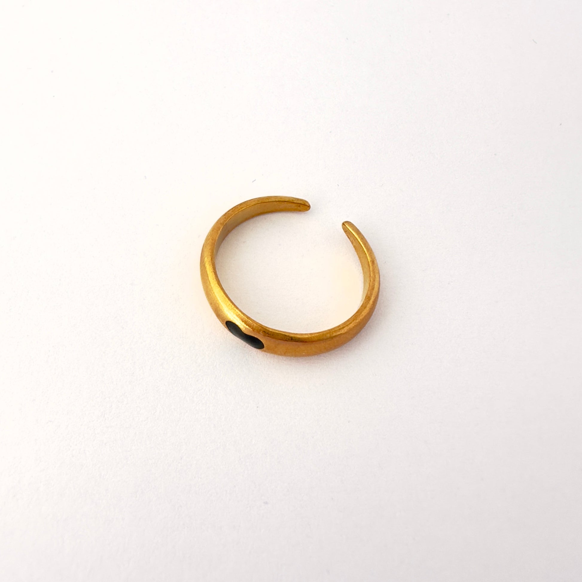 Un anillo ajustable de diseño simple pero potente. Su forma redondeada, combinada con un corazón negro esmaltado, lo convierte en una pieza perfecta para quienes buscan un accesorio sutil con significado.