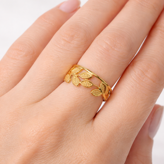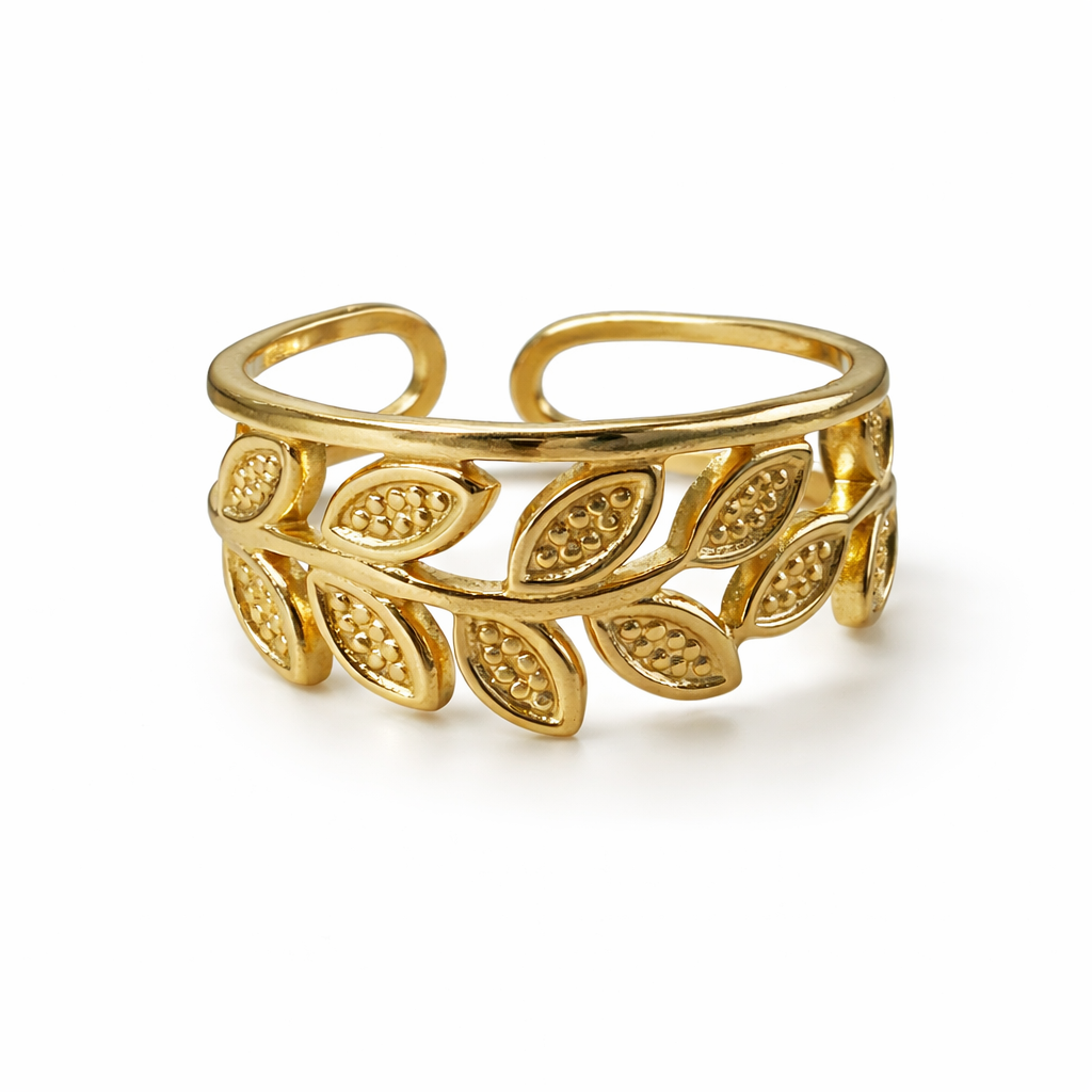Anillo de diseño abierto inspirado en formas naturales, con delicadas hojas en relieve que aportan un estilo elegante y orgánico.