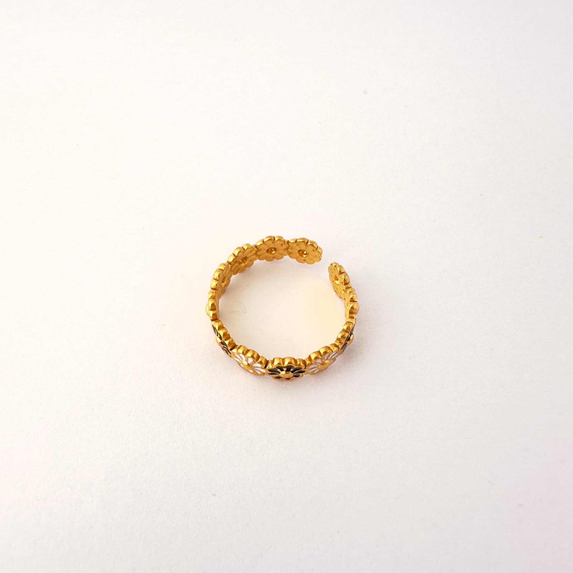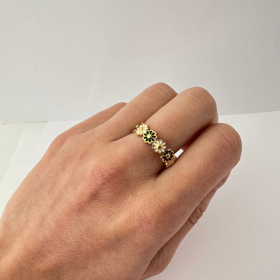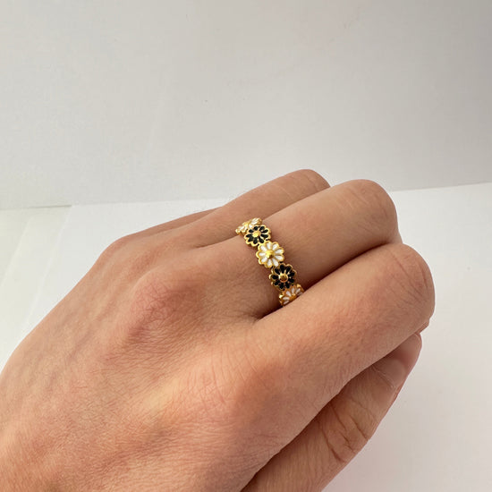 Delicado, femenino y con un toque misterioso, el Anillo Jardín Nocturno es una pieza ajustable compuesta por pequeñas flores esmaltadas en blanco y negro, que se distribuyen a lo largo de toda la circunferencia. Su diseño detallado lo hace ideal para quienes buscan un anillo que combine ternura y estilo sin esfuerzo.