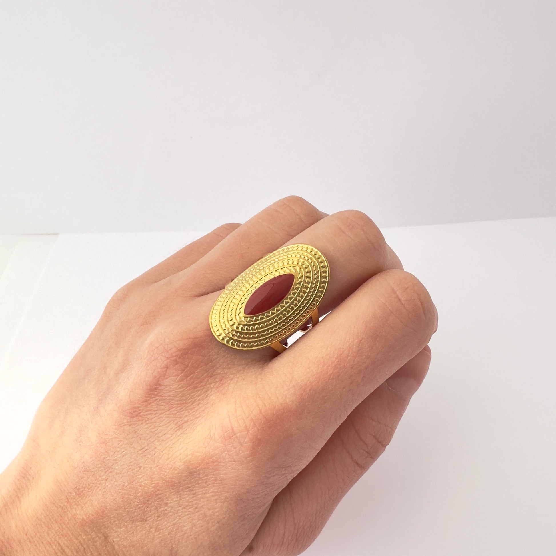 Anillo con diseño ovalado y textura grabada, protagonizado por una piedra roja central en forma de gota. Una joya con carácter, ideal para quienes aman destacar con estilo y personalidad.