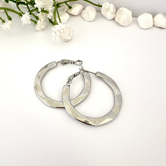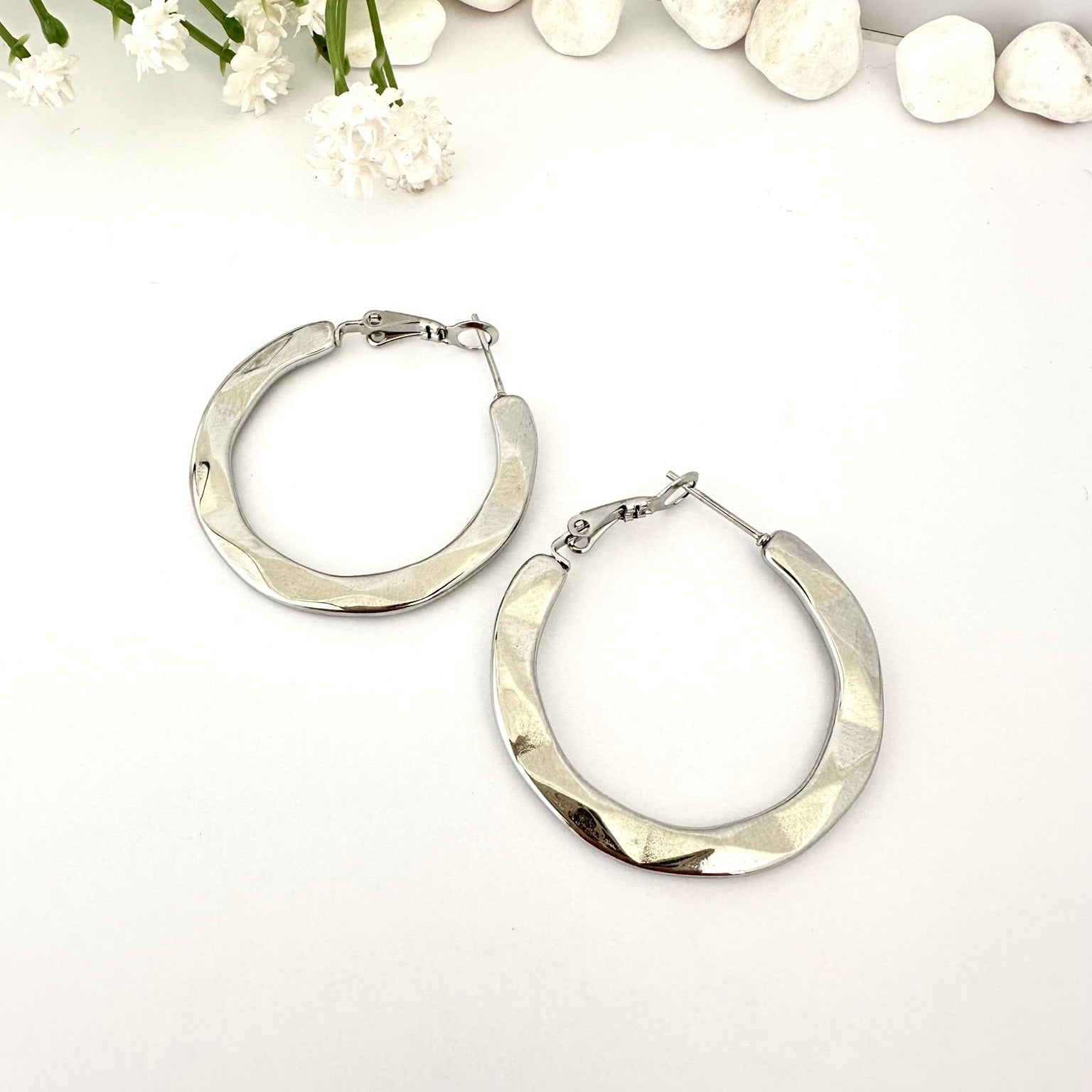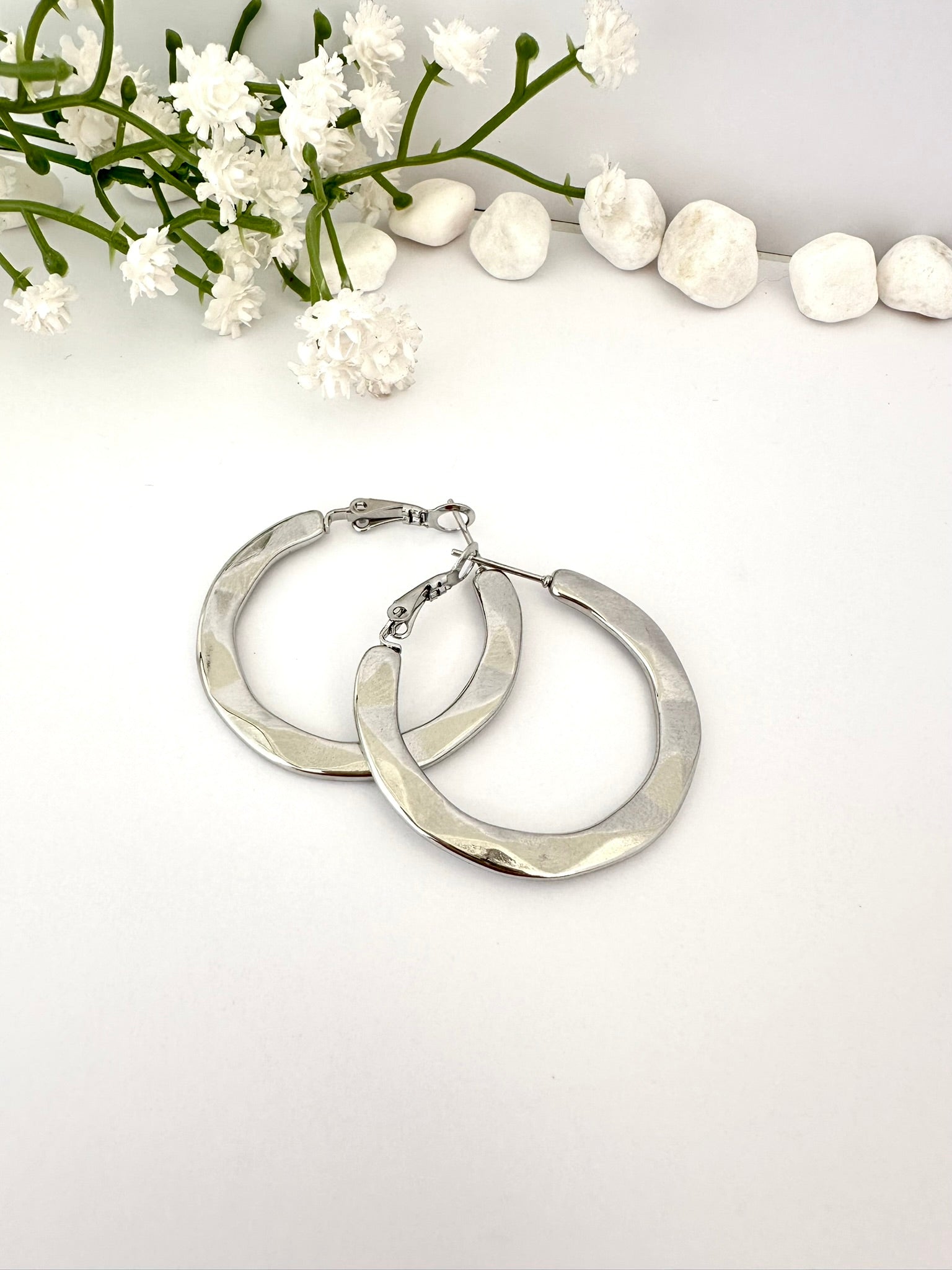 Las Argollas Aura Plateadas combinan elegancia y modernidad en un diseño de líneas suaves con superficie facetada. Su brillo sutil refleja la luz con un acabado único que aporta un toque sofisticado a cualquier look. Son livianas, cómodas y perfectas para el uso diario o para complementar estilos más refinados.