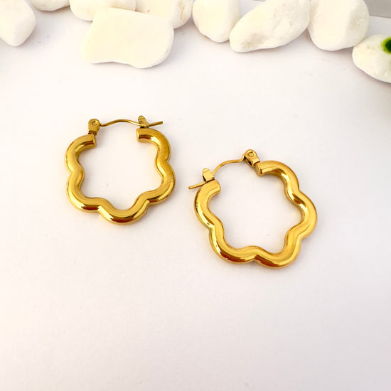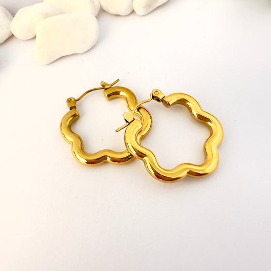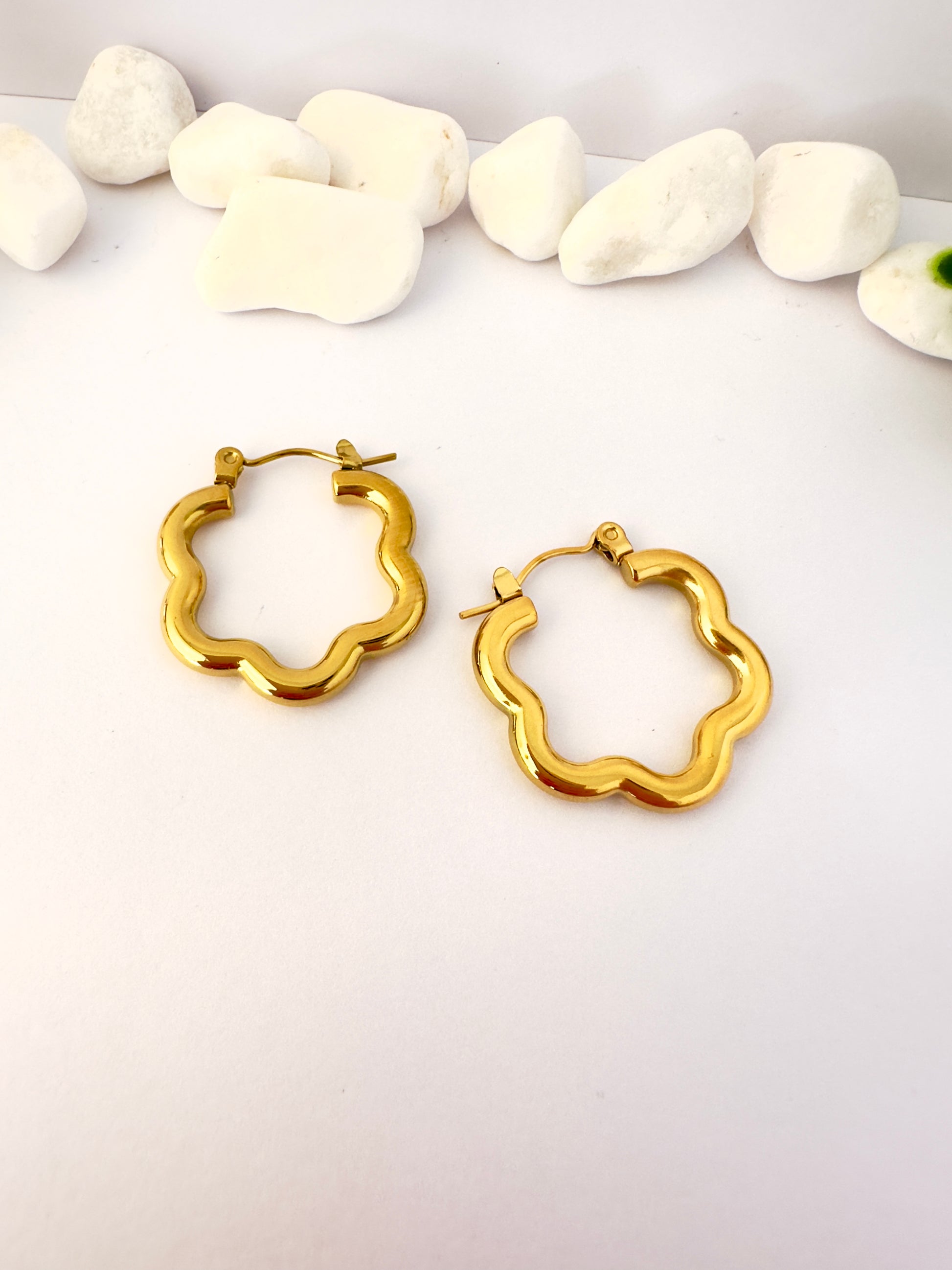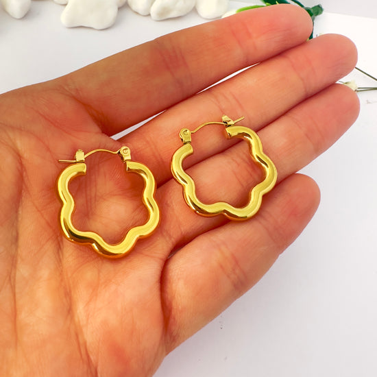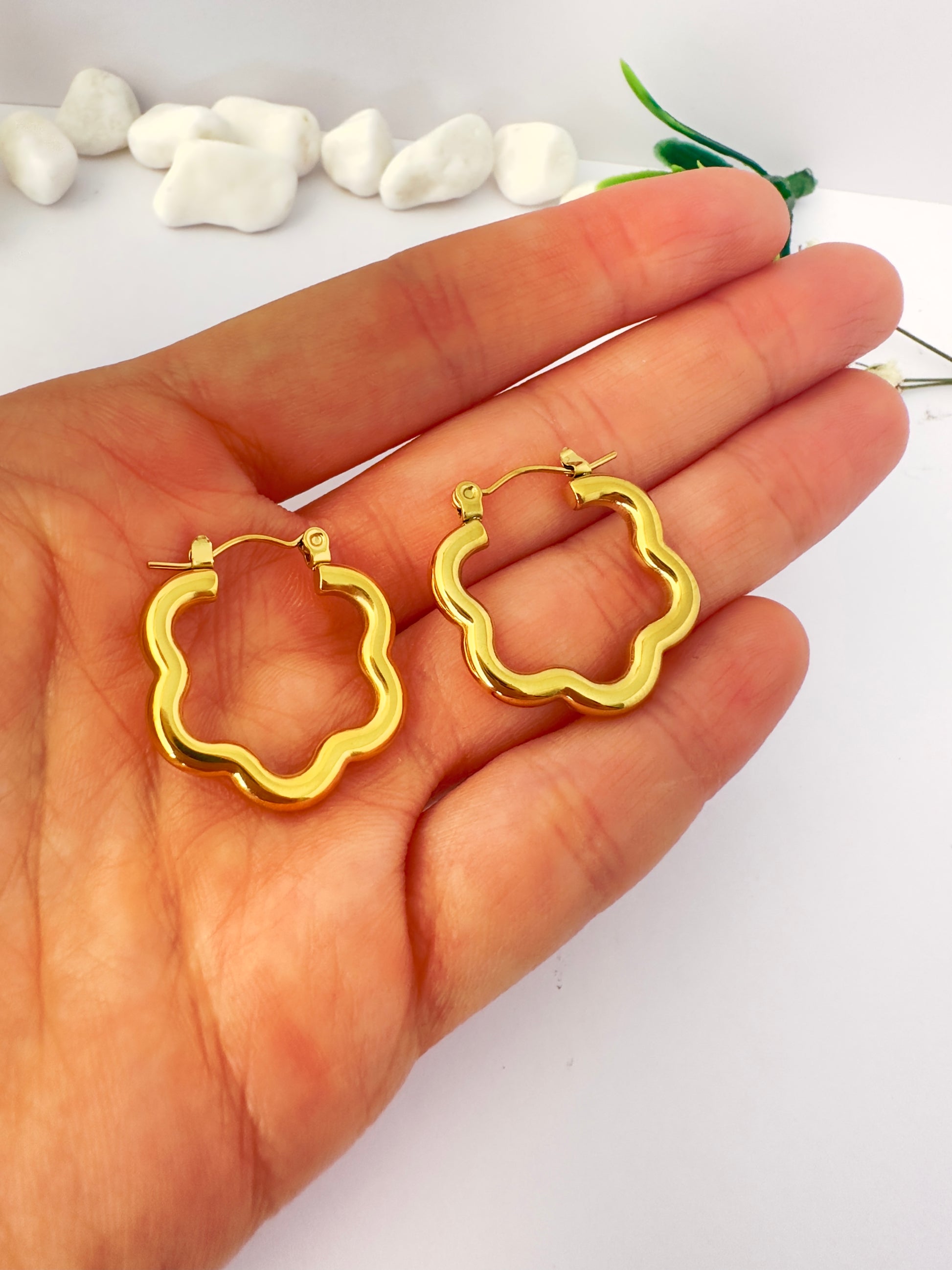 Argollas de diseño floral en forma ondulada, elaboradas en acero inoxidable con enchapado en oro de 18 quilates (4 micras). Un modelo moderno, divertido y ultra combinable, inspirado en las tendencias más vistas en Pinterest y TikTok.