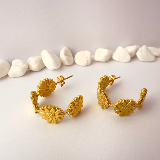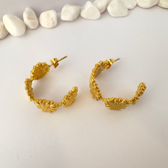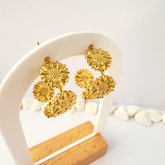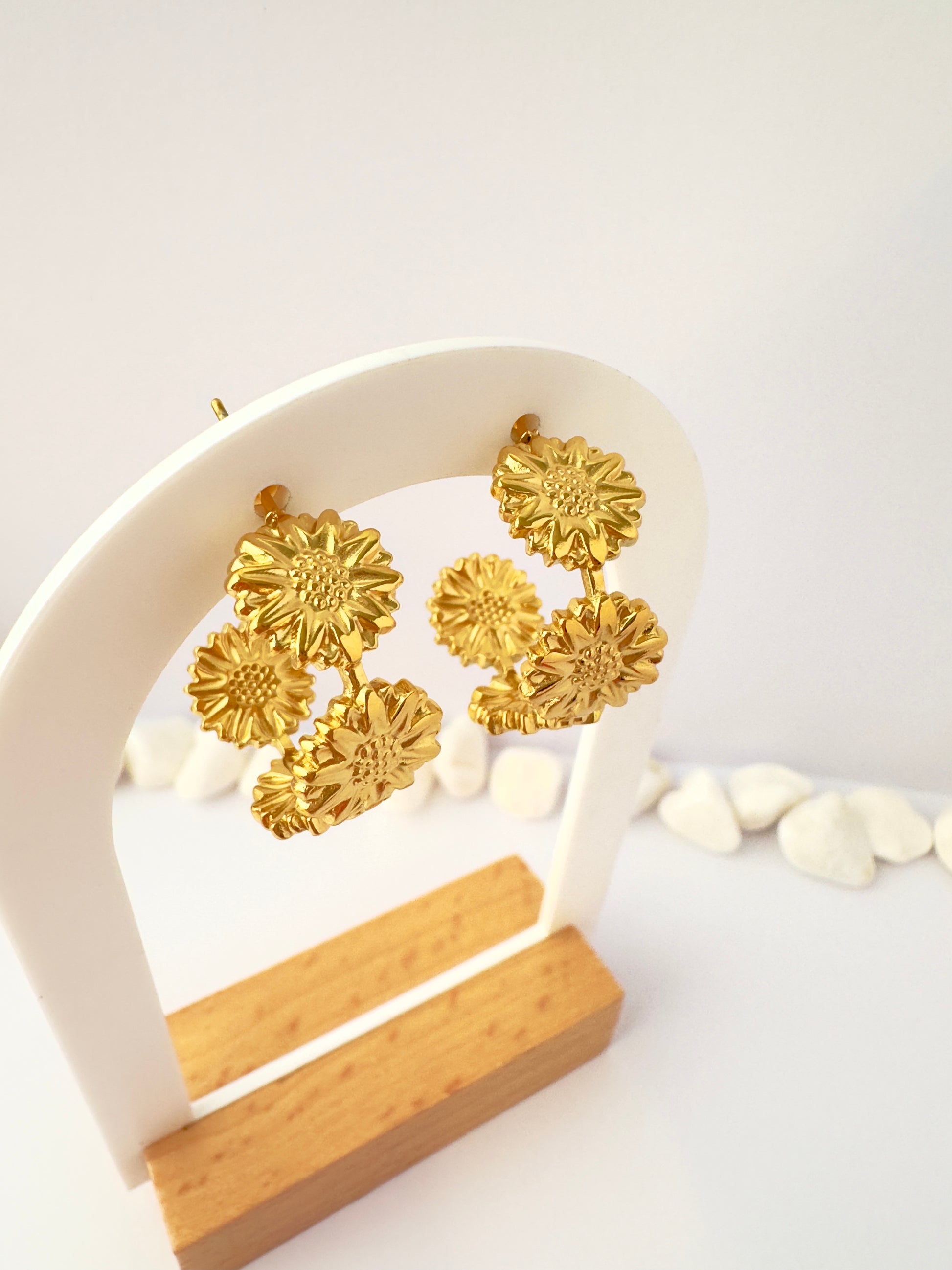 Un diseño lleno de luz y energía, estas argollas florales de triple caída evocan la frescura de la primavera con un acabado dorado intenso y texturizado. Cada flor tiene volumen y presencia, ideales para looks vibrantes y femeninos.