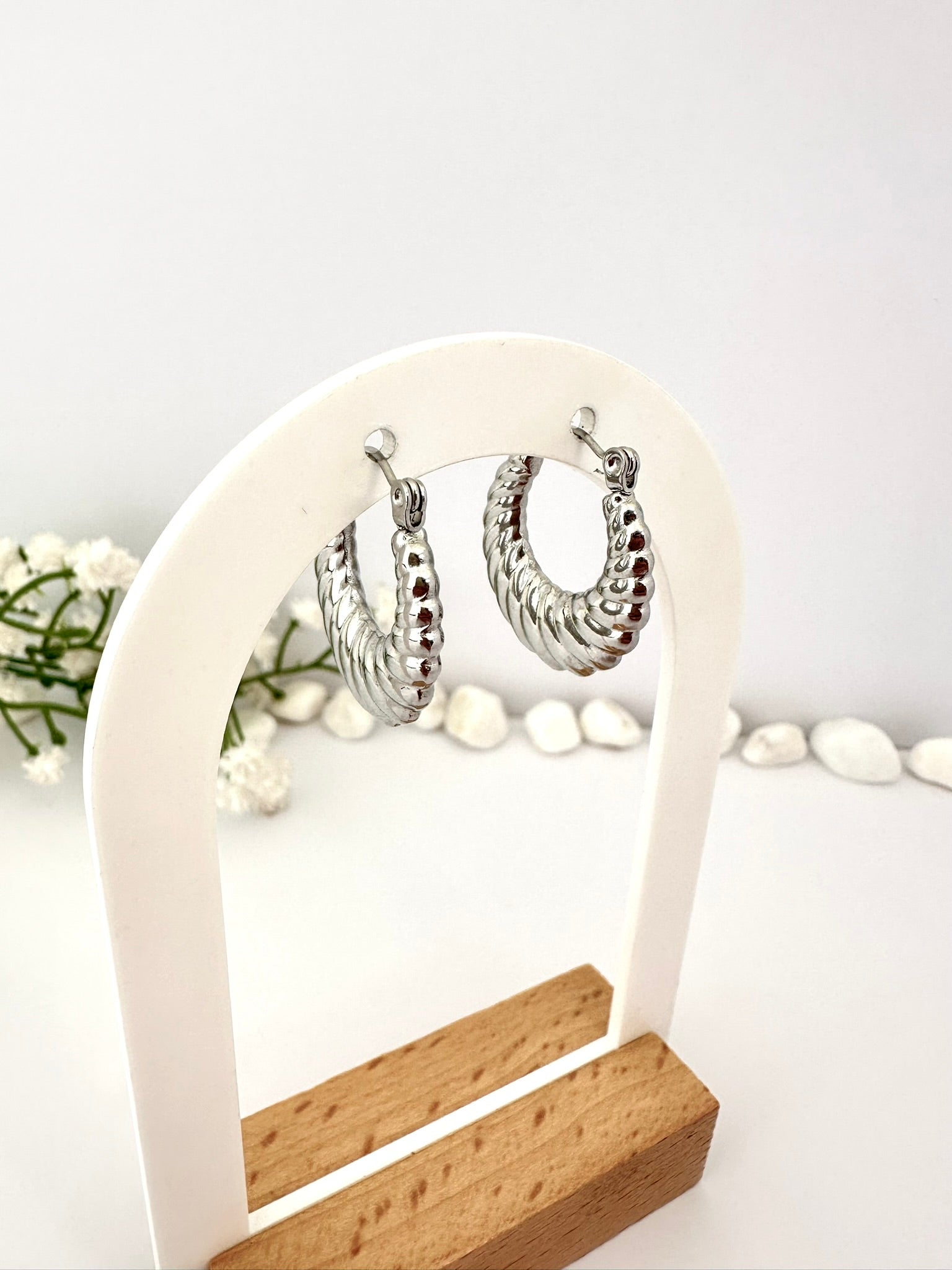 Las Argollas Plateadas con Relieve Acanalado destacan por su diseño moderno y elegante. Su textura en espiral refleja la luz desde distintos ángulos, aportando un brillo sutil y sofisticado. Son livianas, cómodas y perfectas para quienes buscan un estilo clásico con un toque contemporáneo.
