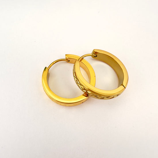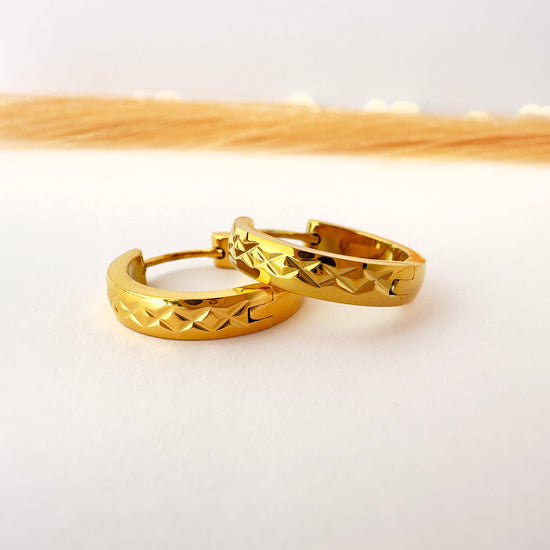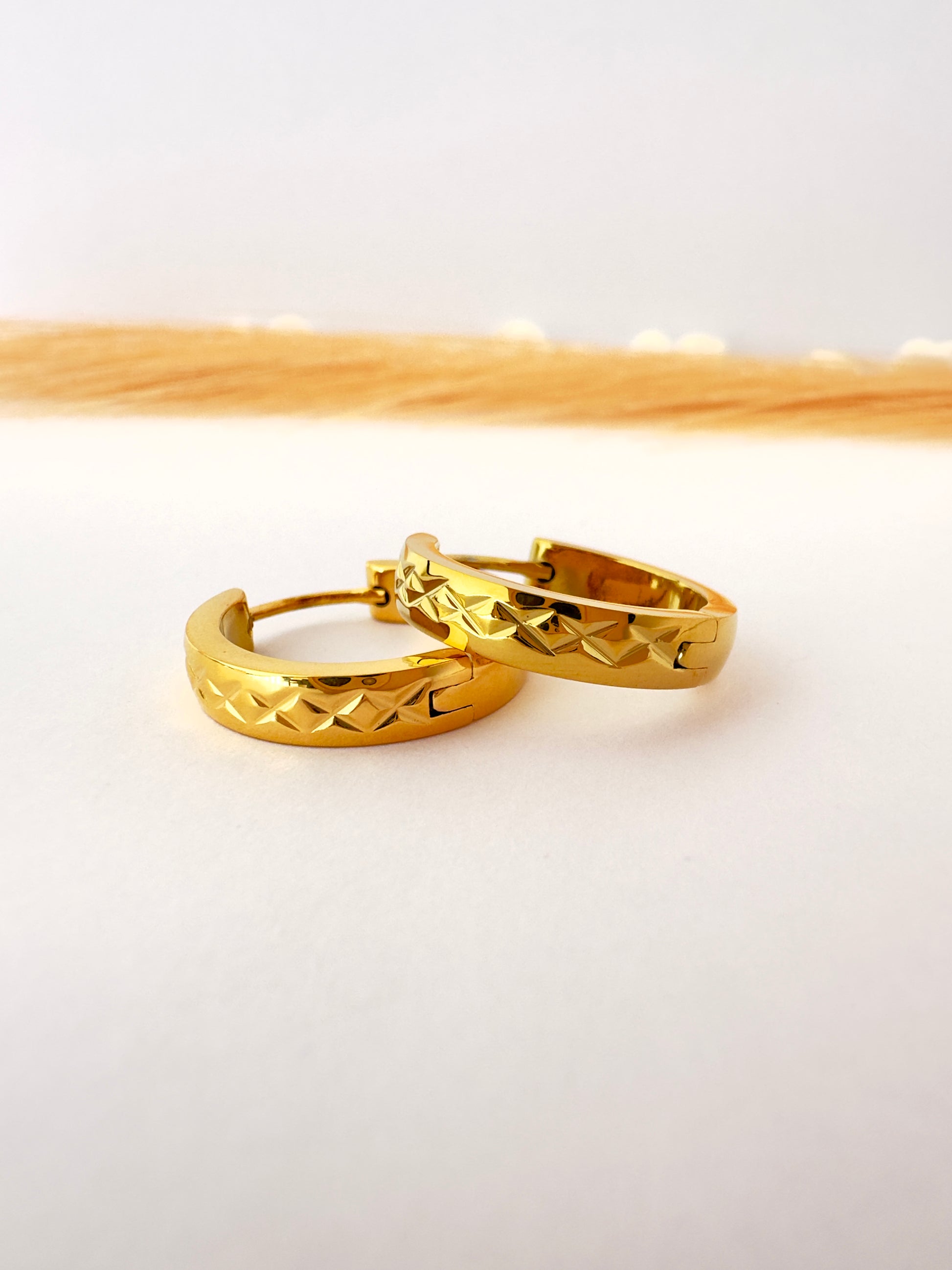 Estas argollas doradas de tamaño medio cuentan con una textura geométrica que refleja la luz de forma elegante, aportando un brillo único a cualquier look.