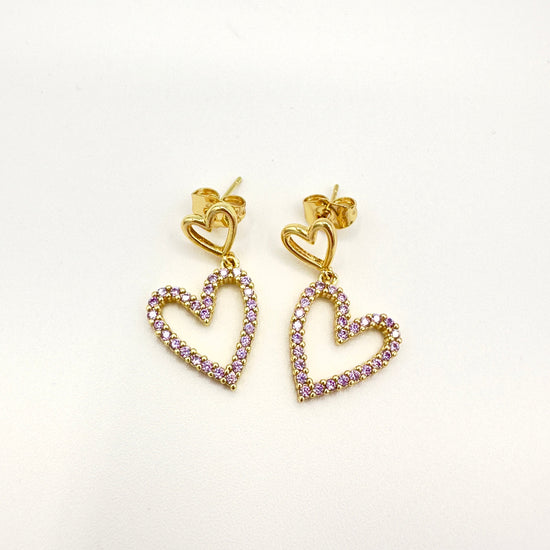 Estos aros presentan un diseño colgante de doble corazón: una base superior lisa y un corazón inferior decorado con circones que aportan brillo y sofisticación.