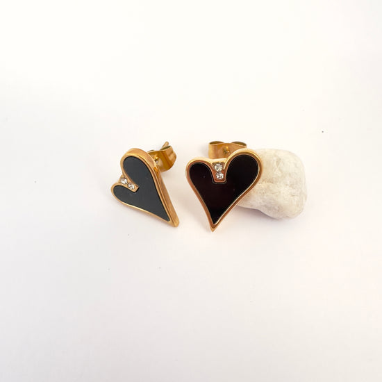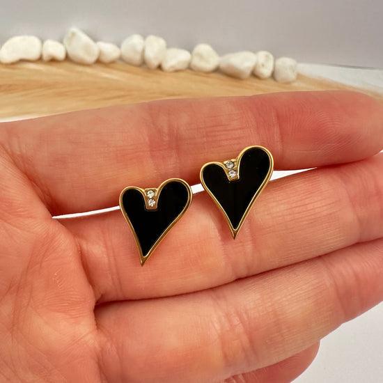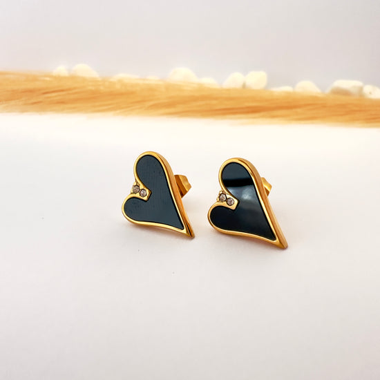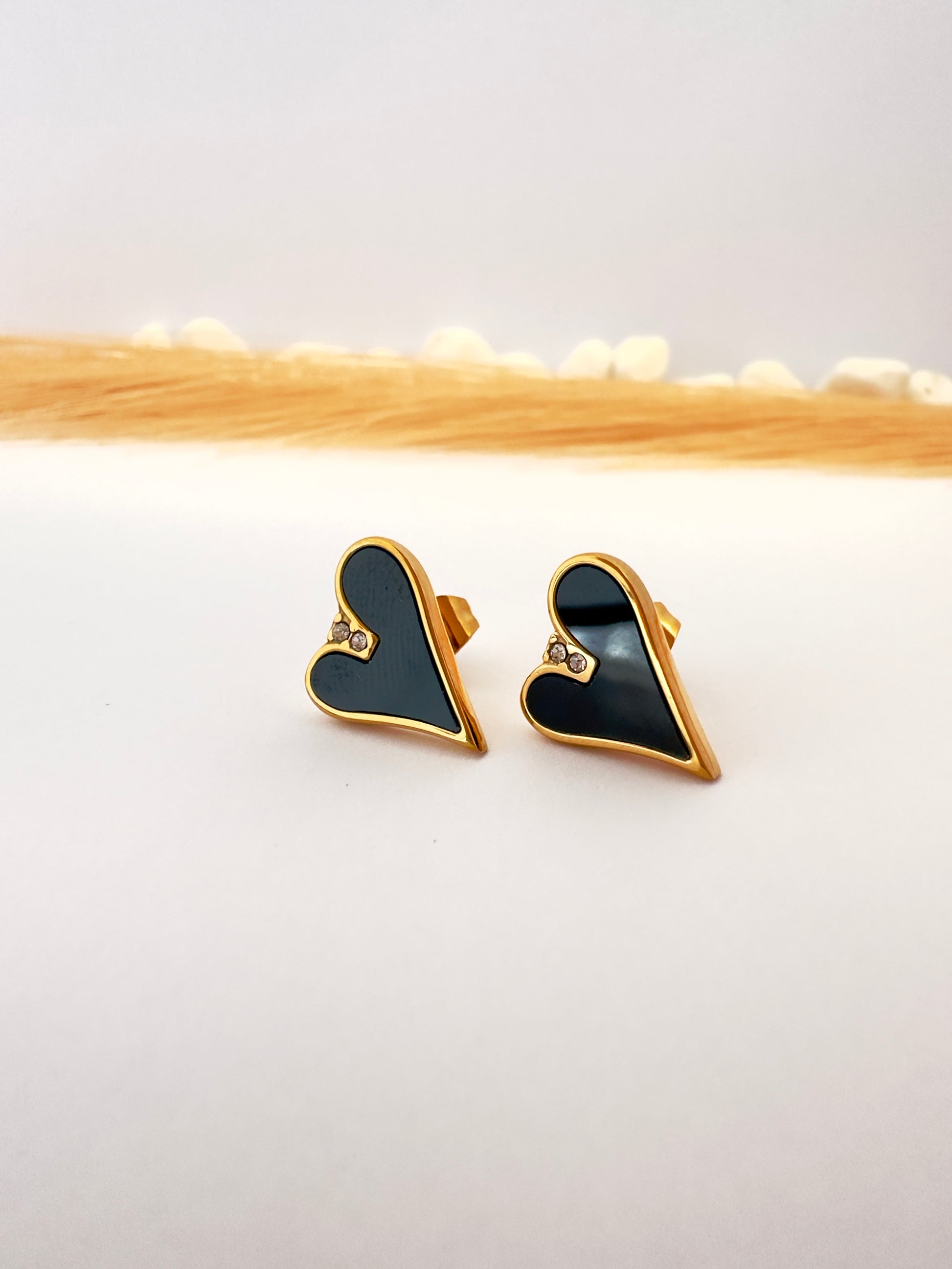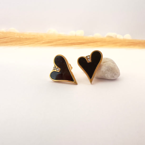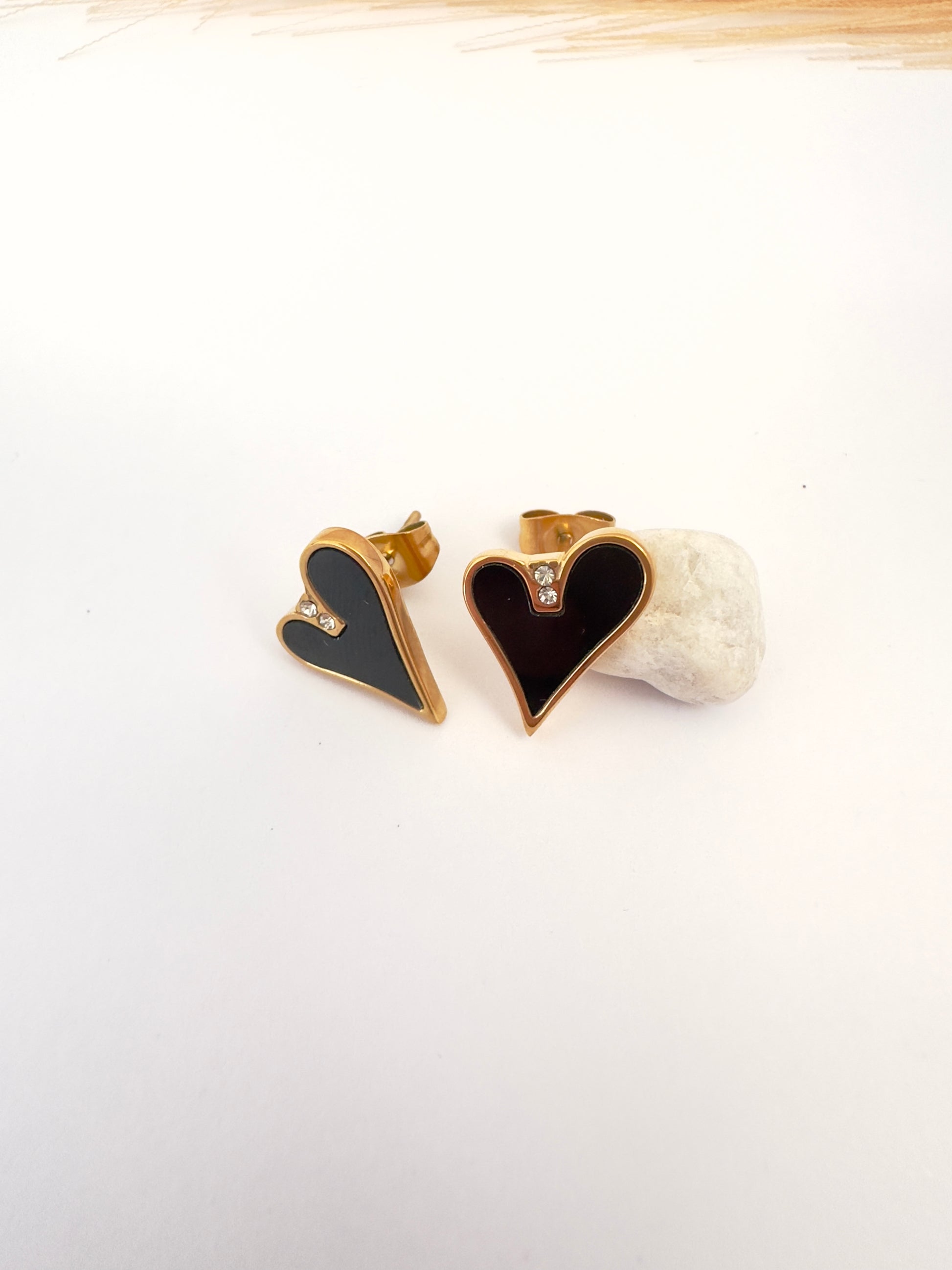 Un diseño elegante y audaz: corazones negros con detalles brillantes que destacan por su contraste y sofisticación. El marco dorado realza su forma y los pequeños cristales añaden el toque perfecto de brillo.