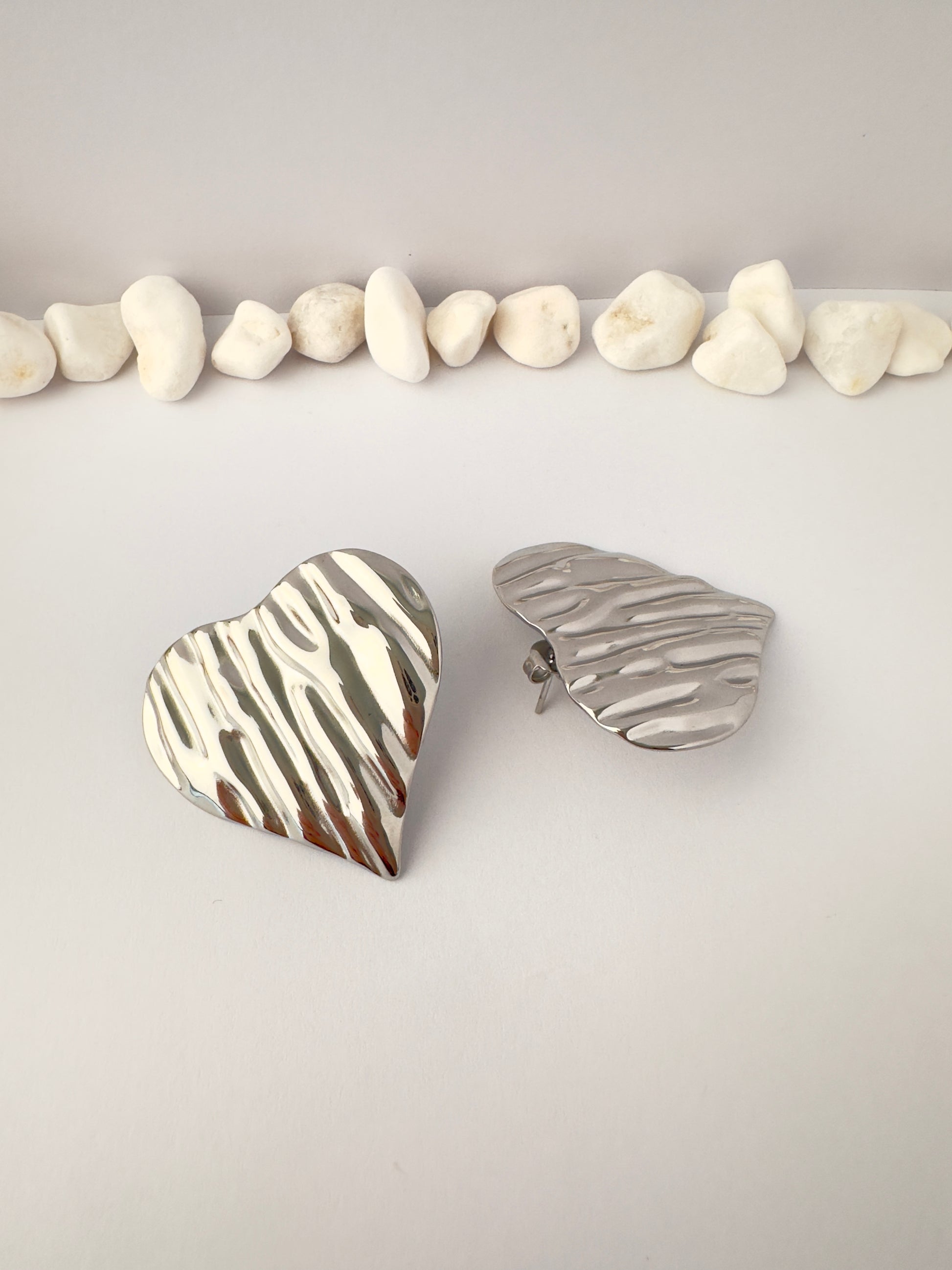 Diseño en forma de corazón con acabado plateado espejo y textura orgánica tipo ondas. Una pieza moderna y llamativa que destaca por su brillo y volumen, perfecta para looks con actitud.
