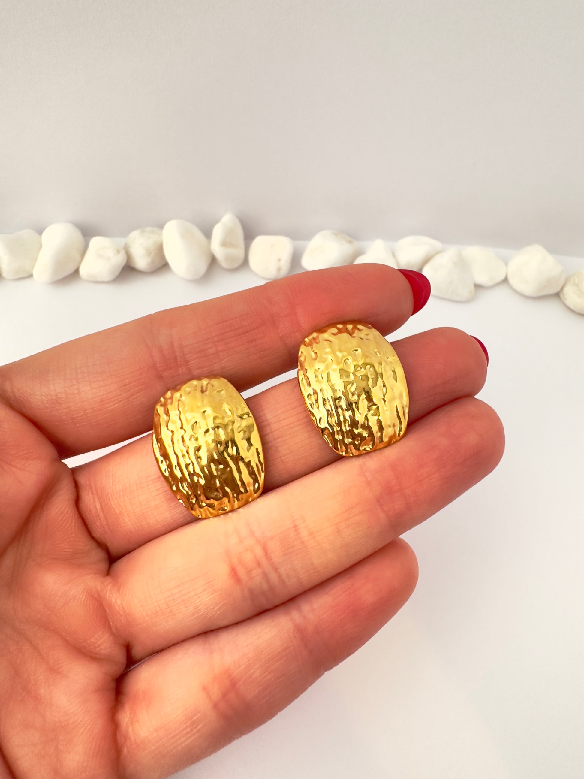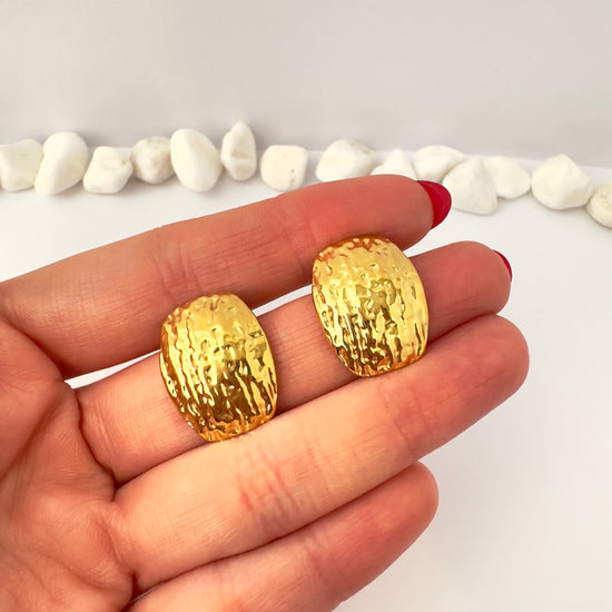 Diseño robusto y con carácter. Estos aros tipo clip (sin colgar) tienen una textura martillada que refleja la luz de forma sutil, brindando un acabado artesanal y a la vez refinado. Ideales para looks sobrios, elegantes o con inspiración artística.