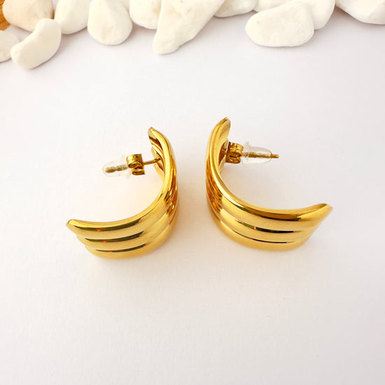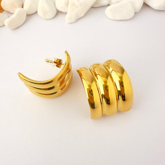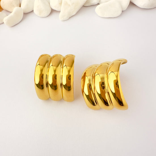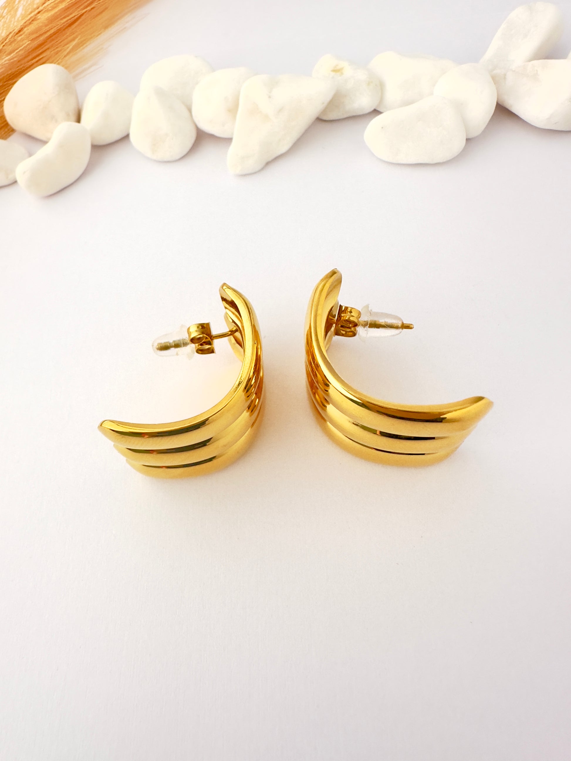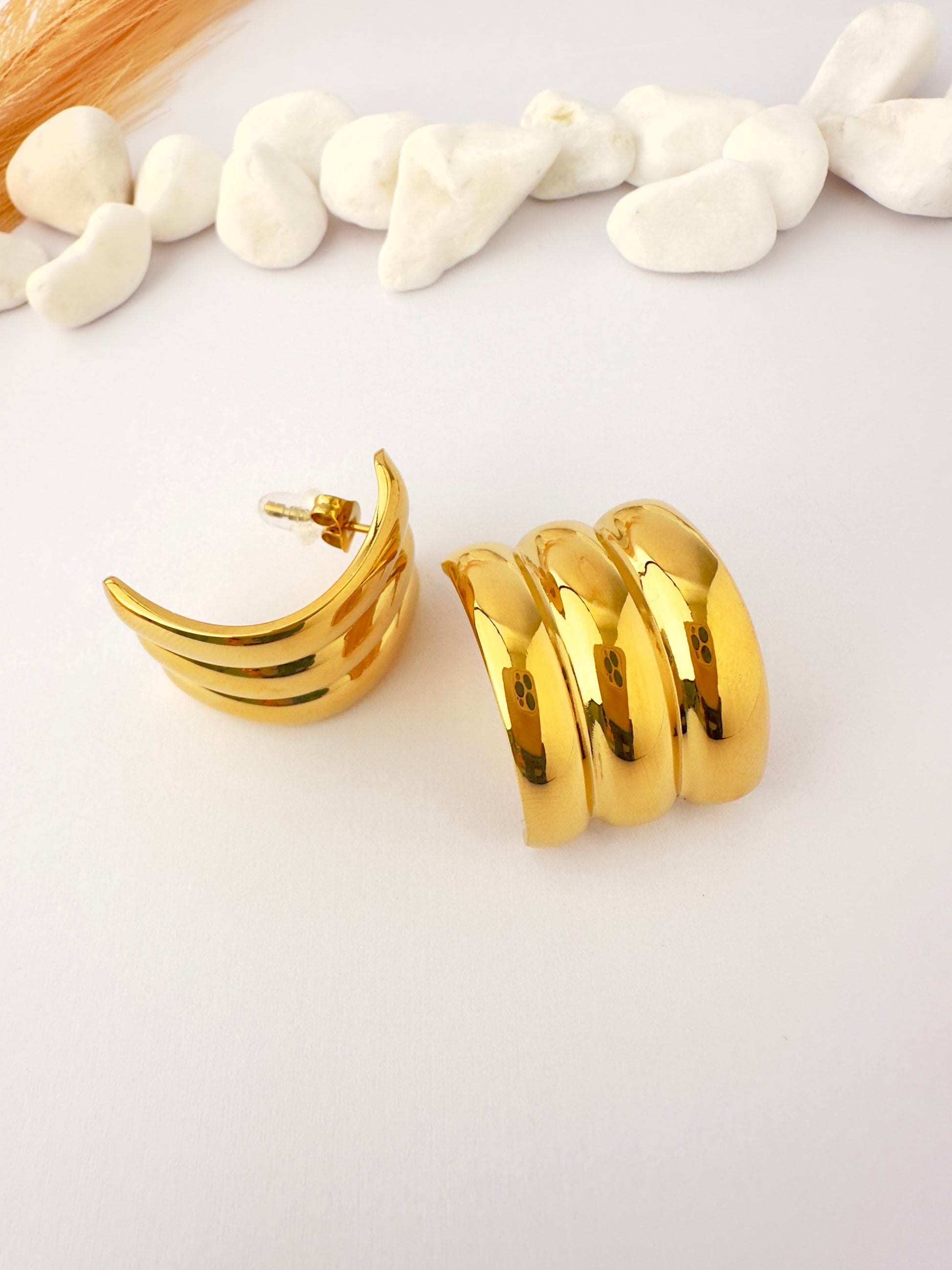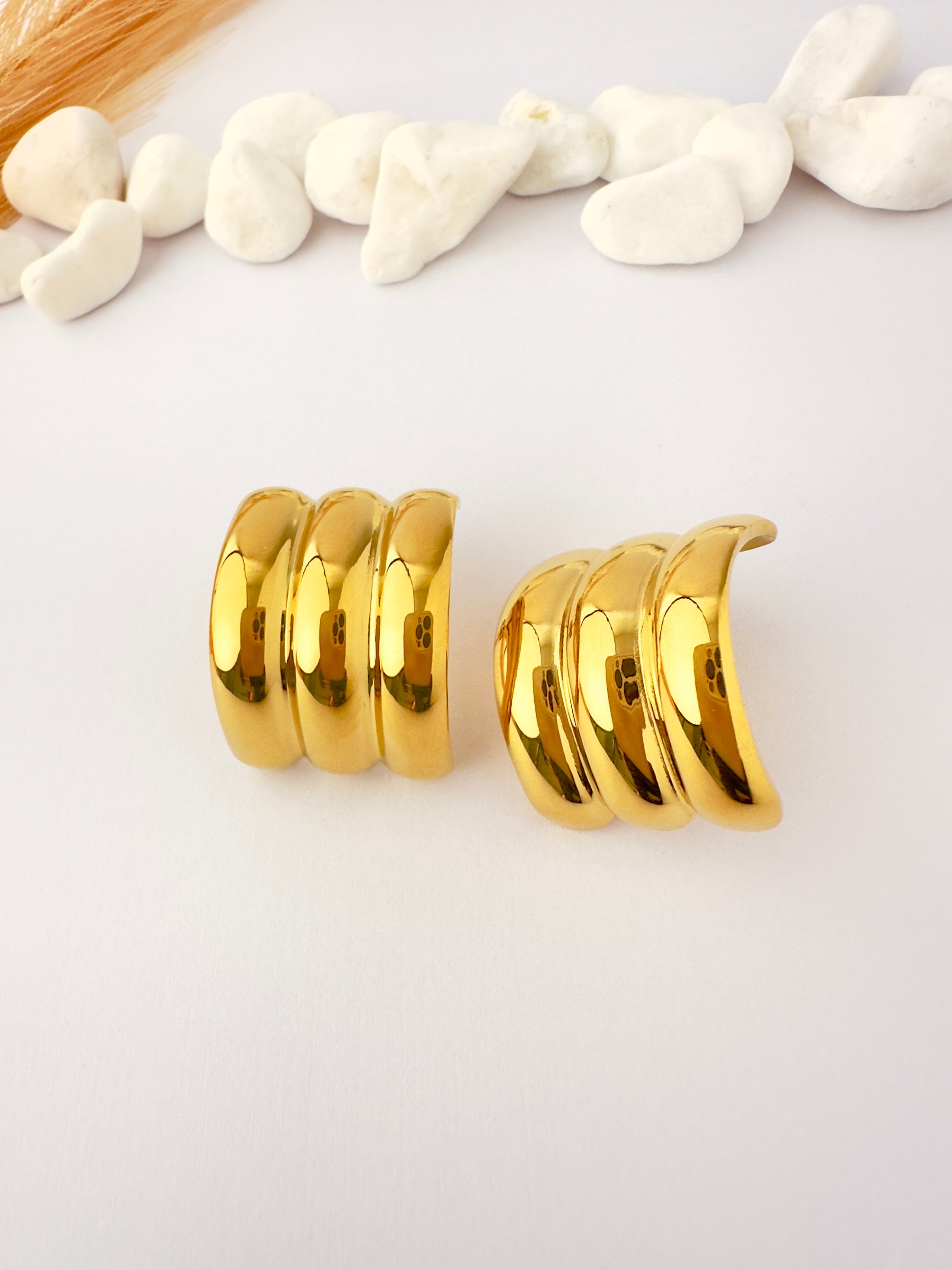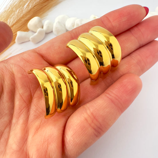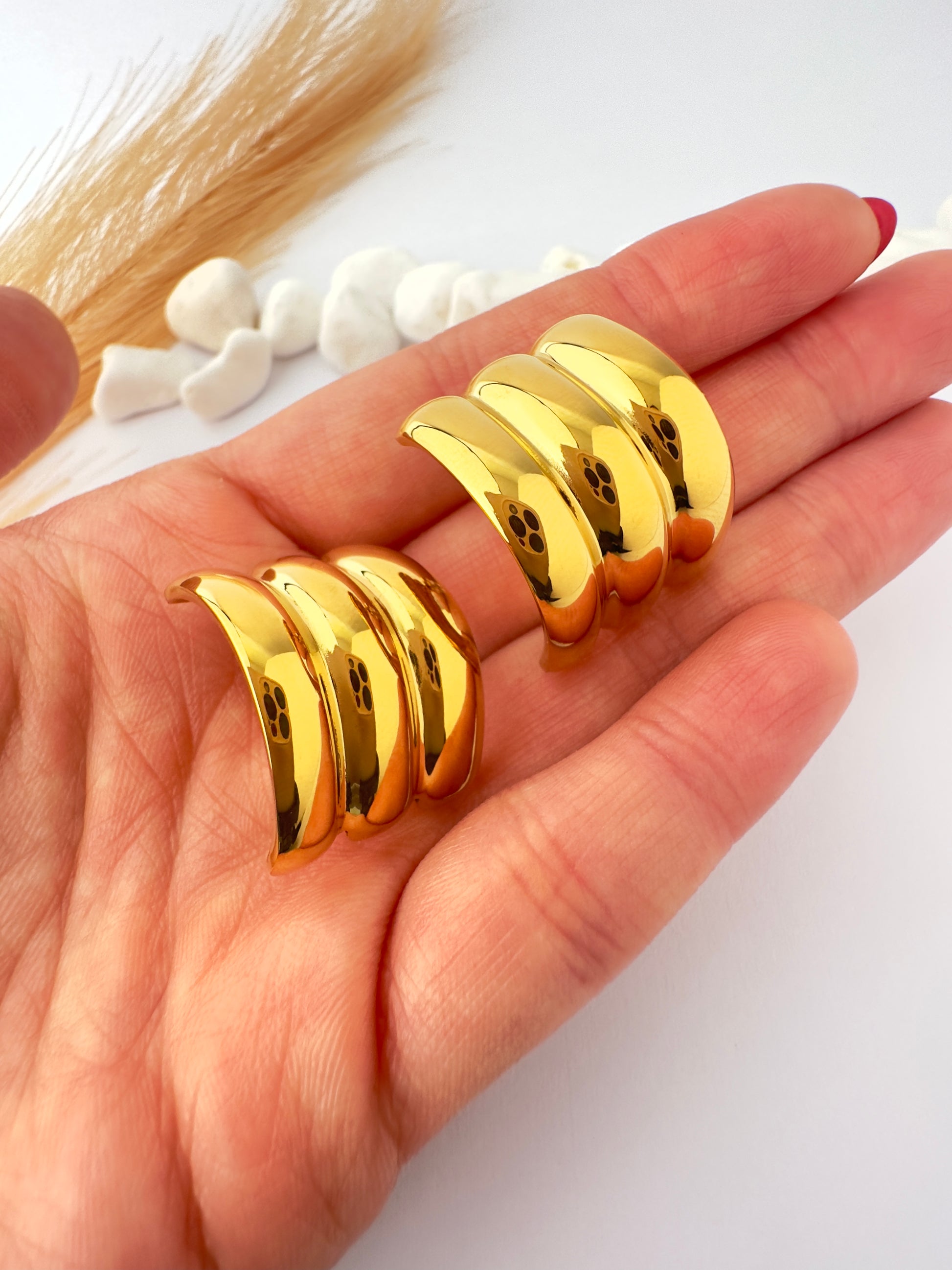 Un diseño de líneas curvas y envolventes que atrapa la luz desde todos los ángulos. Modernos, imponentes y elegantes, estos aros realzan cualquier look con carácter y sofisticación. Ideales para quienes buscan destacar con piezas audaces, sin perder la versatilidad del dorado clásico.