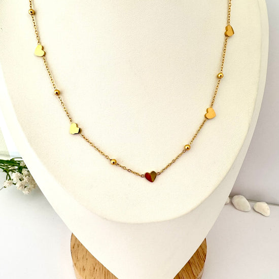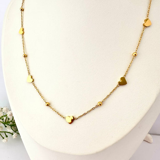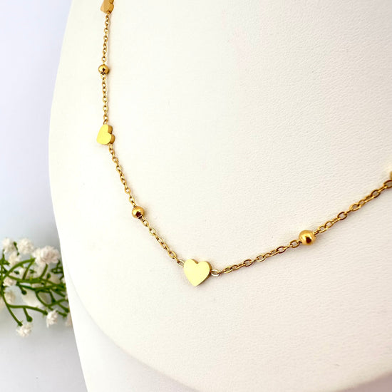 La Cadena de Corazones Dorada es una joya elegante y delicada que simboliza amor y conexión. Su diseño incluye pequeños corazones intercalados con esferas doradas, logrando un estilo femenino, moderno y versátil que combina con cualquier look.