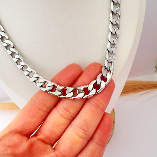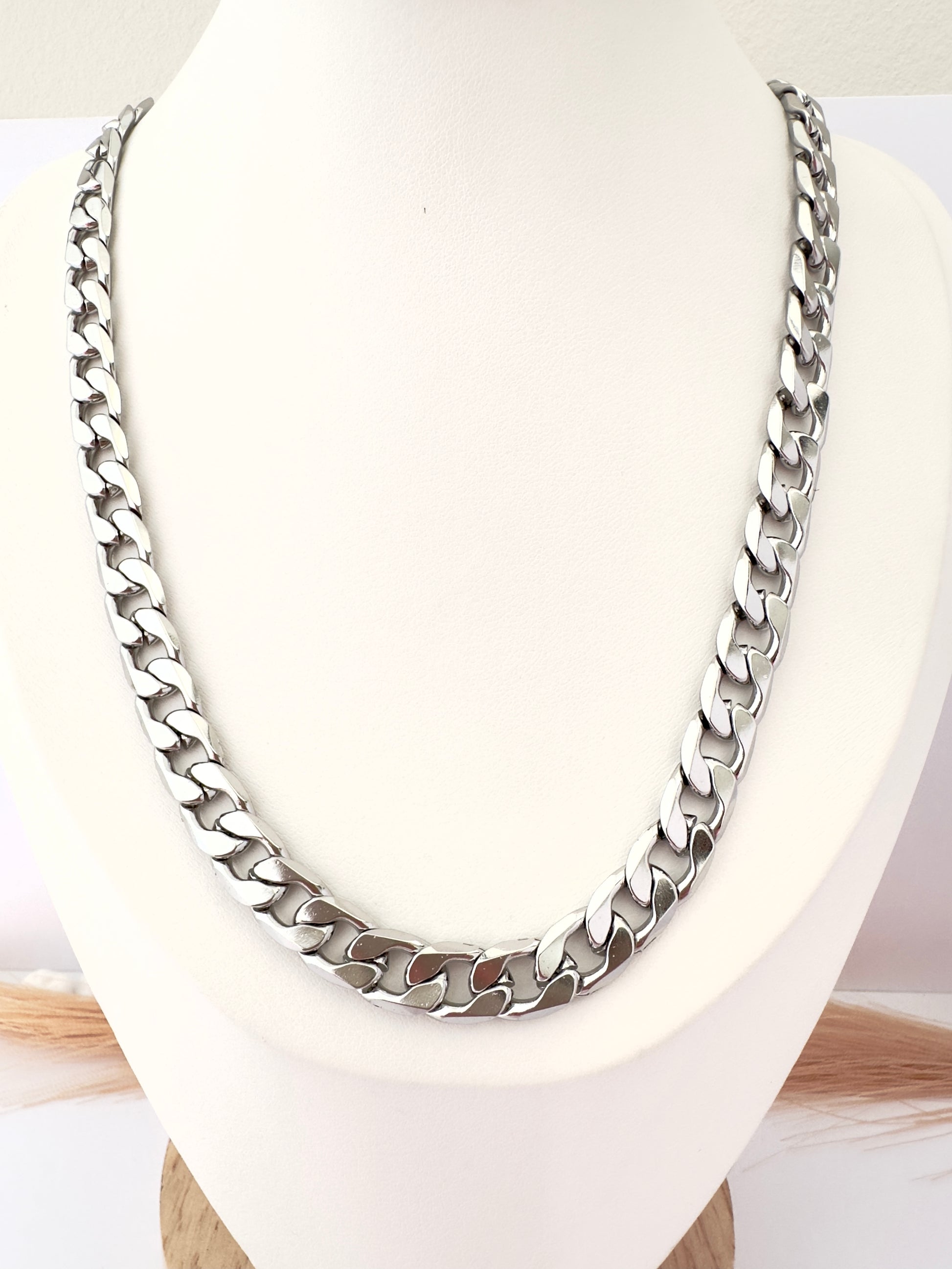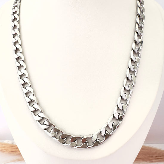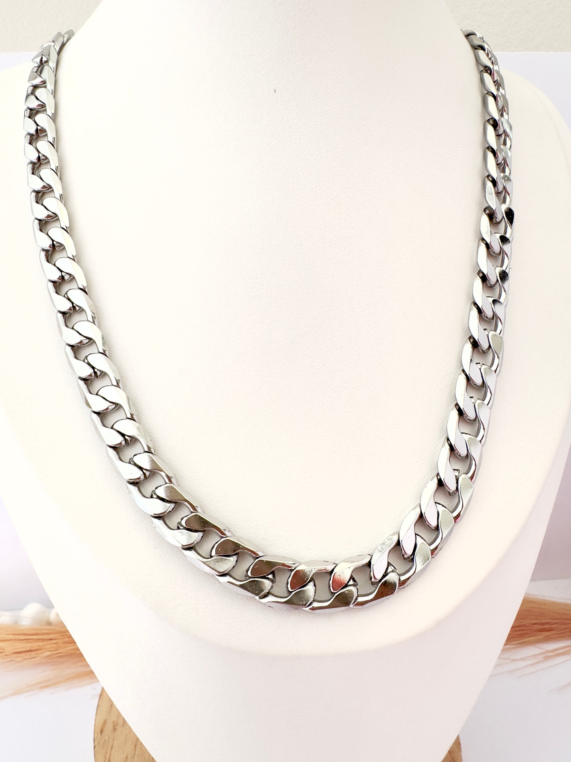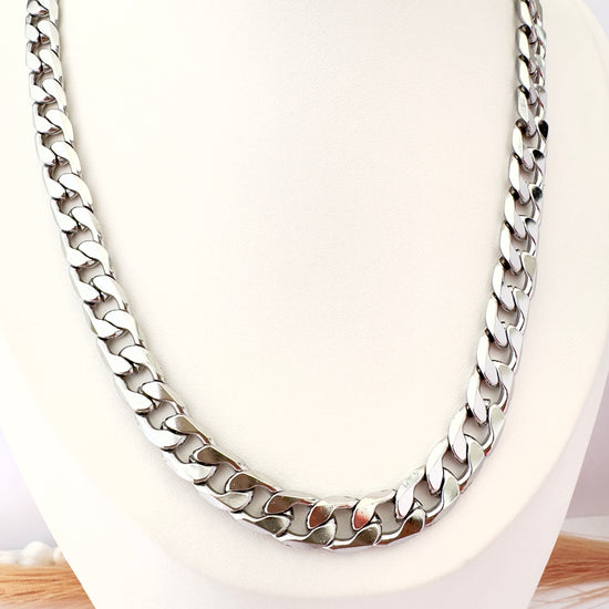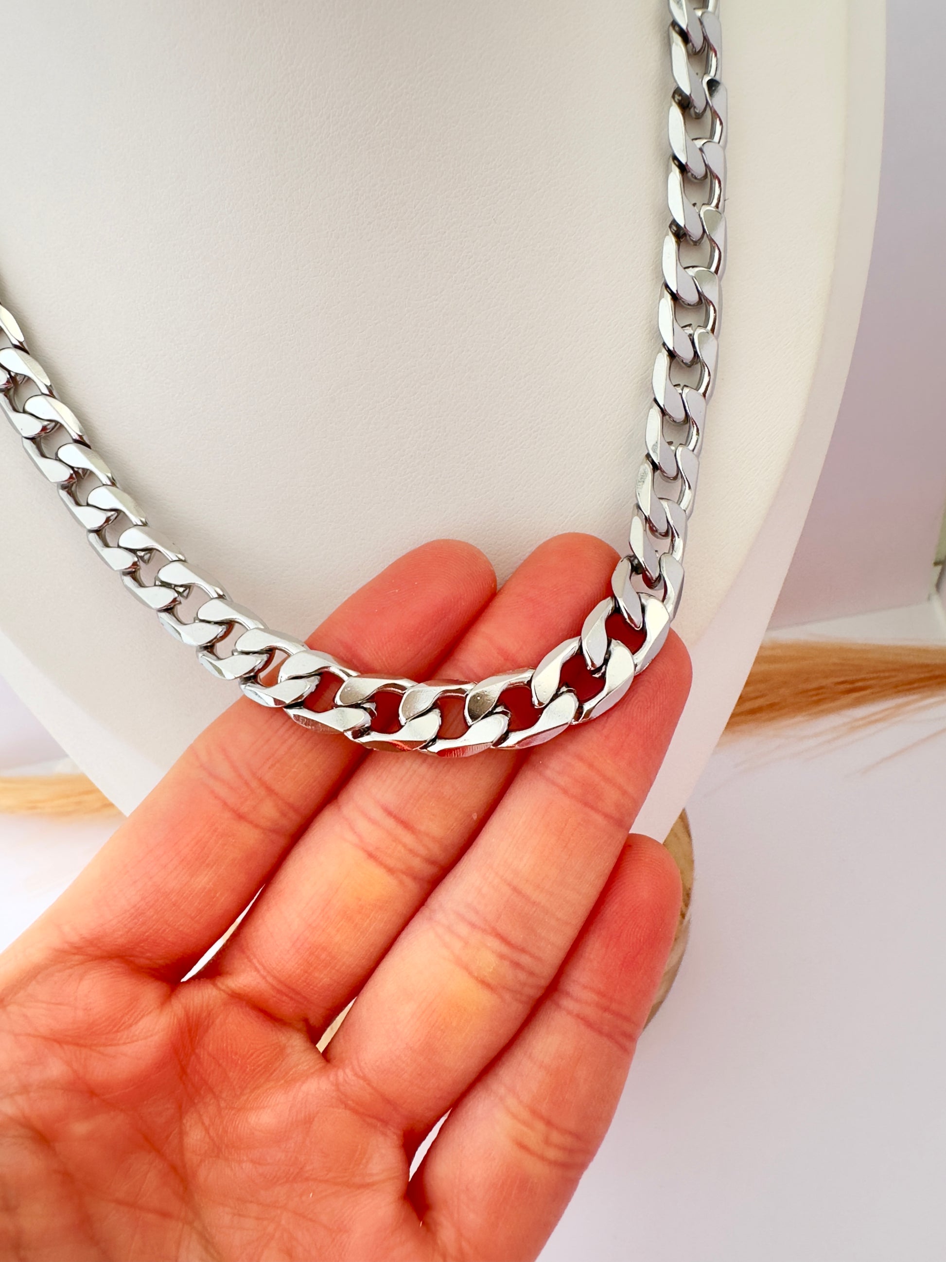 Cadena estilo cubano de eslabones gruesos, fabricada en acero inoxidable de alta resistencia. Su diseño clásico y masculino la convierte en una opción infaltable para quienes buscan un look urbano, elegante y duradero. Ideal para usar sola o combinar con colgantes. No se oxida, no se despinta y es hipoalergénica.
