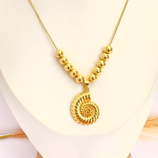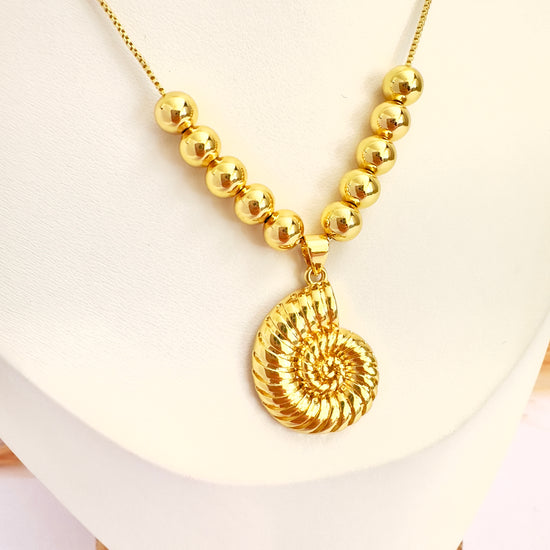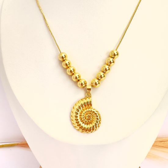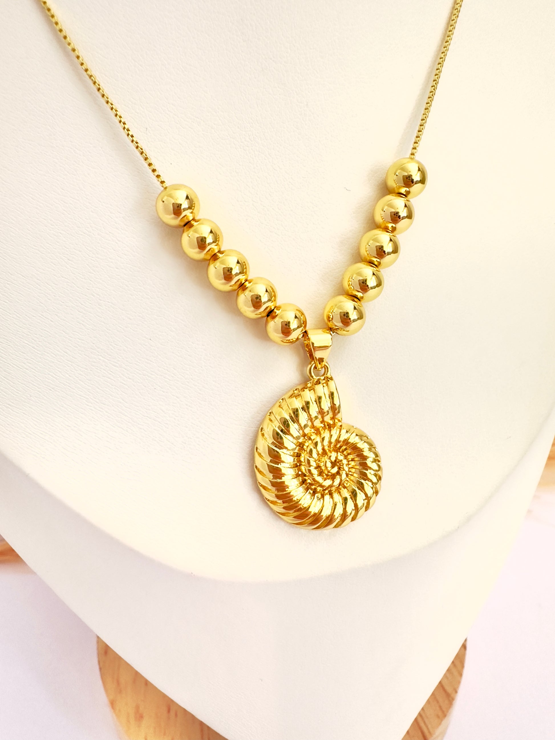 El Collar Caracola Dorada destaca por su diseño llamativo y sofisticado. Su dije en forma de caracola posee un acabado texturizado que refleja la luz de manera preciosa, acompañado de esferas doradas que añaden volumen, estilo y un carácter moderno a la pieza.