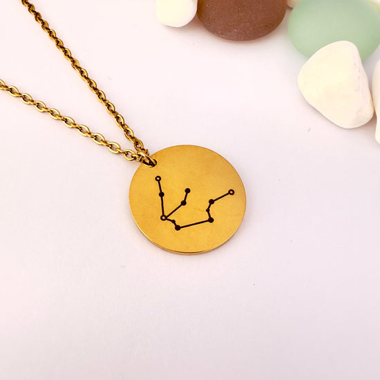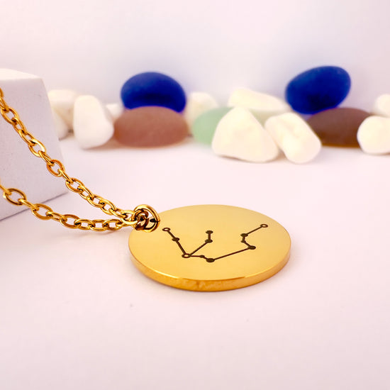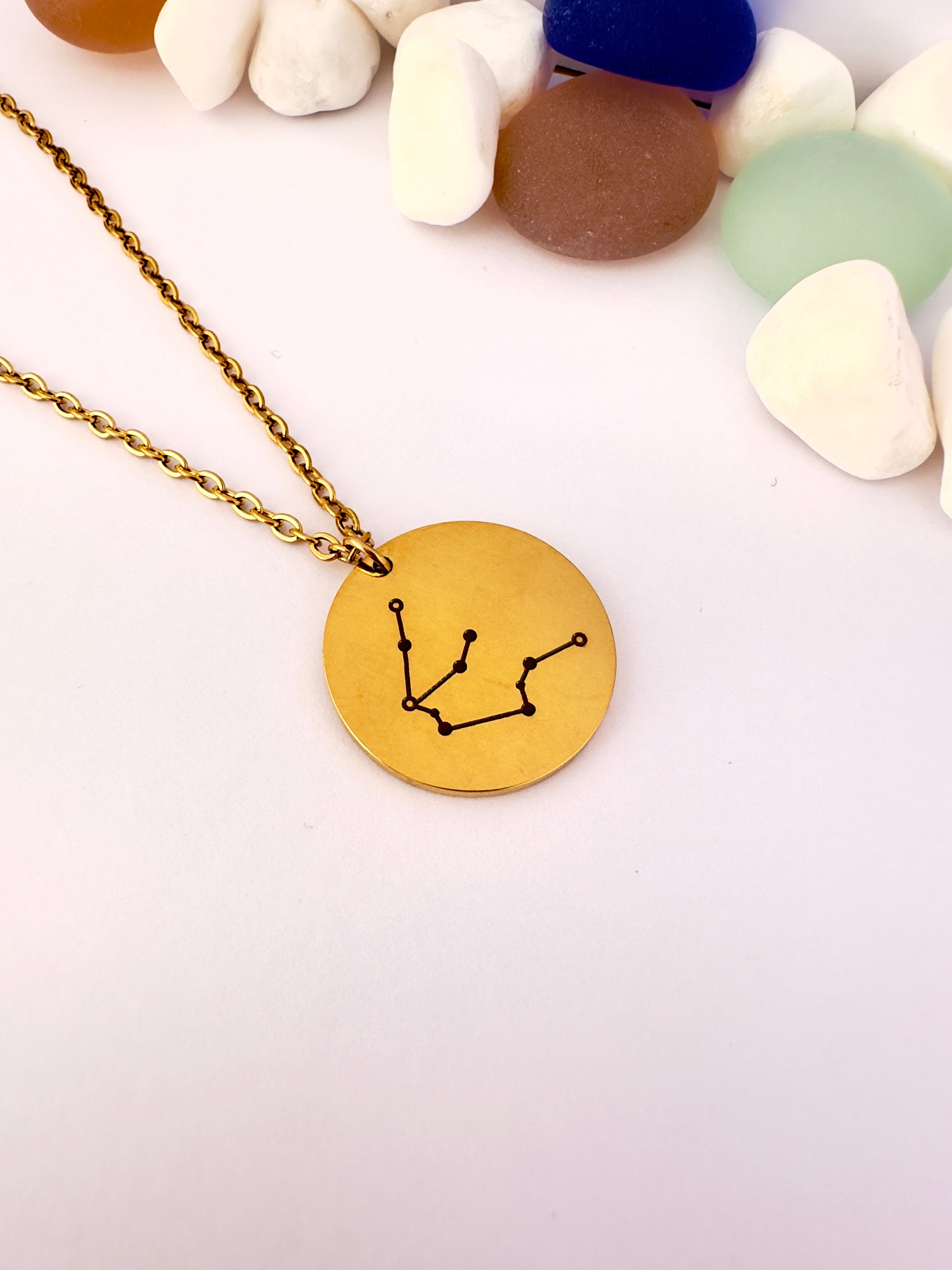 Collar con la constelación del signo Acuario grabada con detalle sobre un dije circular minimalista. Un diseño ideal para personas creativas, independientes y visionarias.
