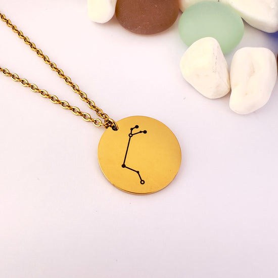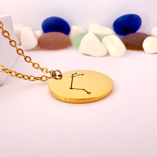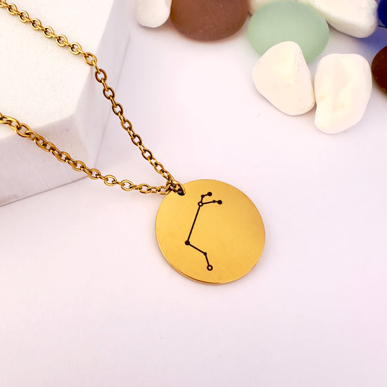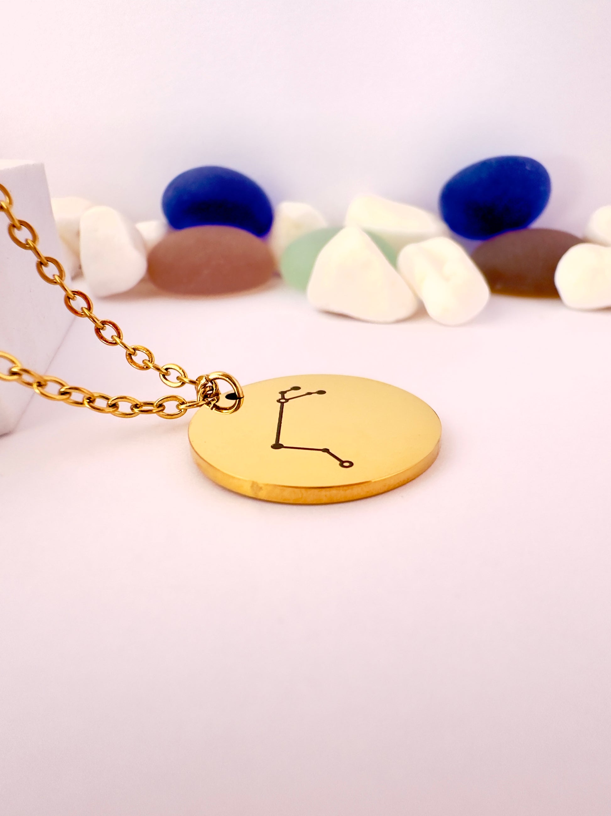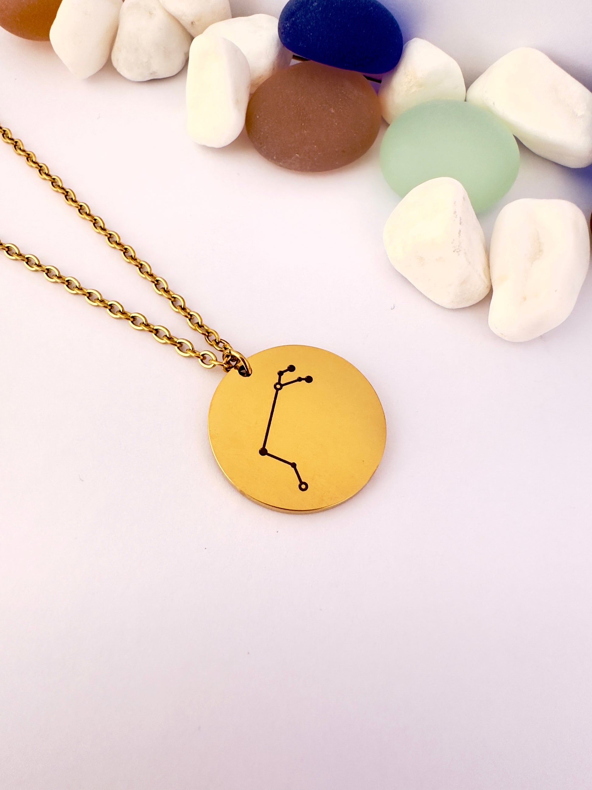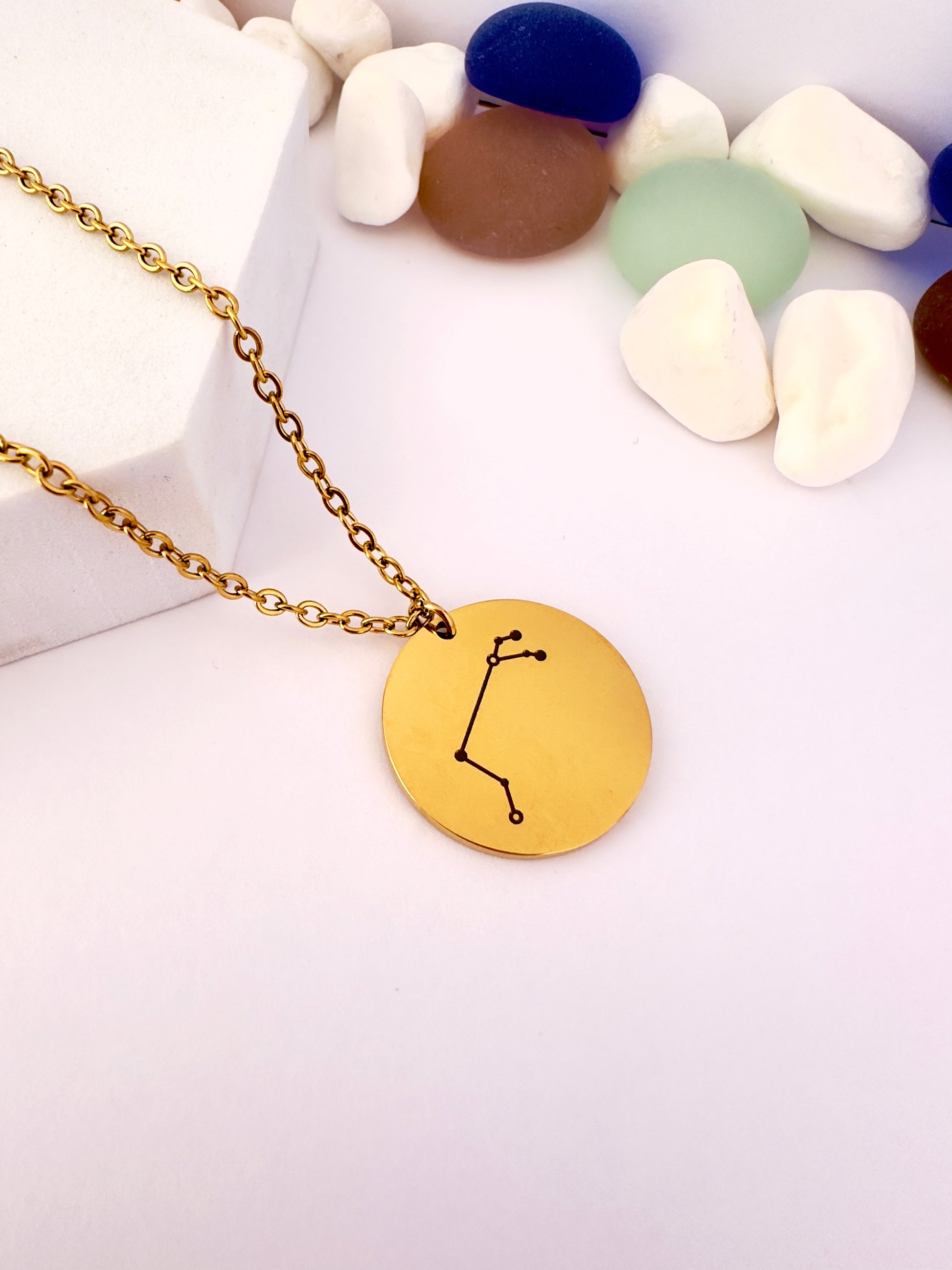 Collar con la constelación del signo Aries grabada en un dije redondo de acabado elegante y moderno. Ideal para personas decididas, valientes y apasionadas que siempre van un paso adelante.