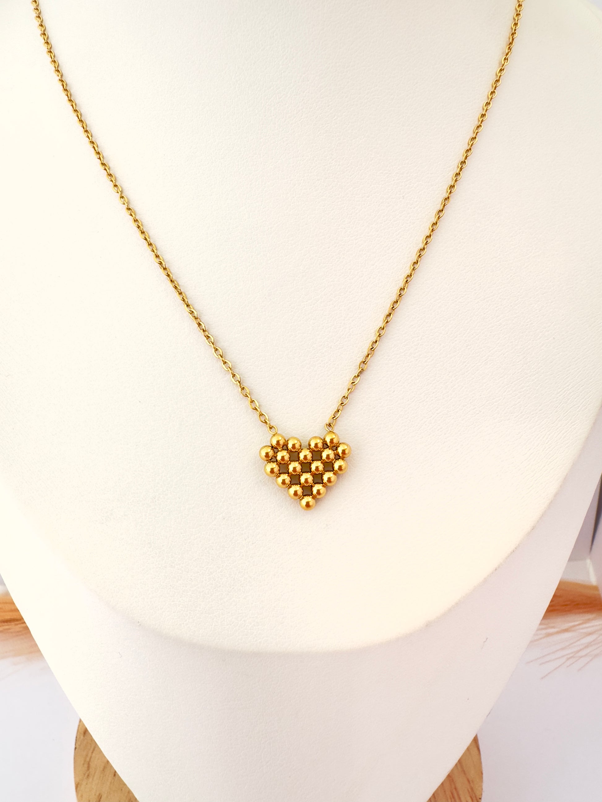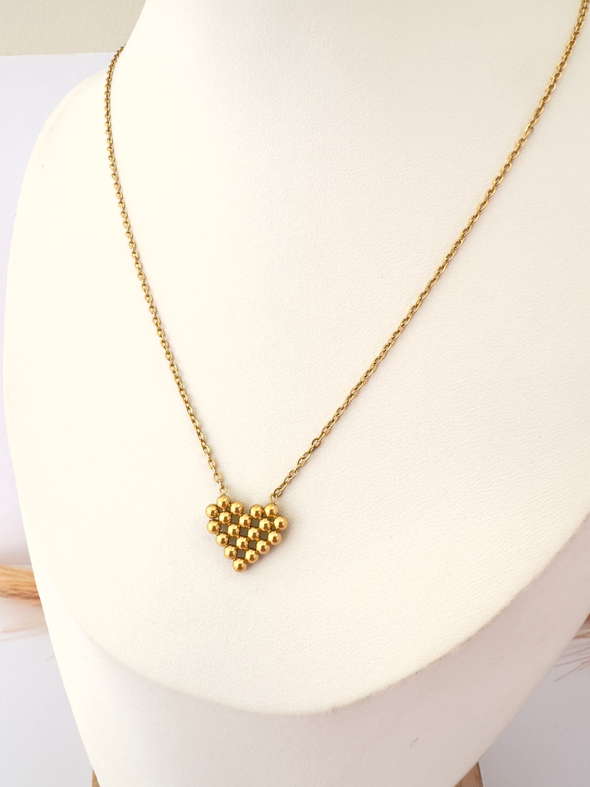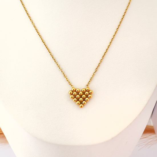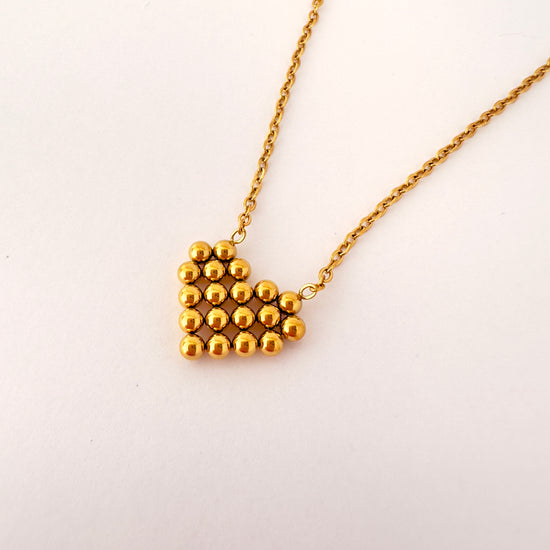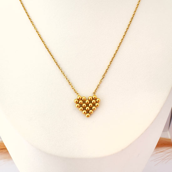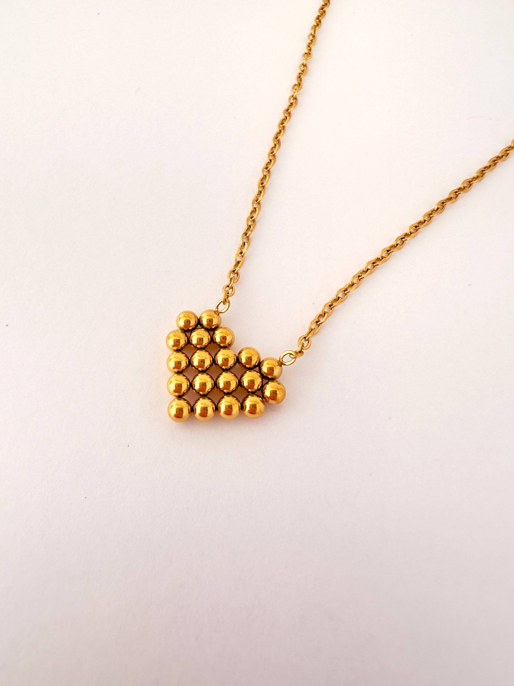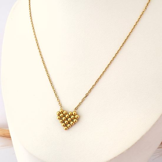 Este delicado collar presenta un corazón formado por pequeñas esferas doradas, creando un diseño moderno y minimalista que irradia armonía. Cada esfera refleja la luz suavemente, evocando una conexión sutil entre elegancia y ternura. Es el accesorio perfecto para quienes buscan una joya atemporal con un toque contemporáneo.