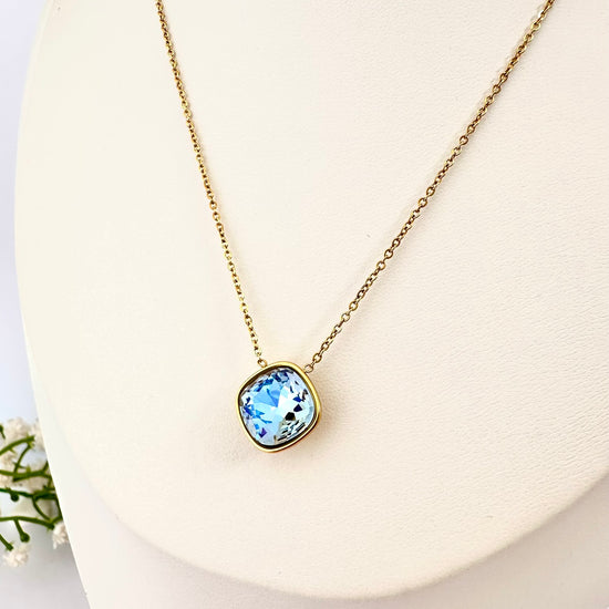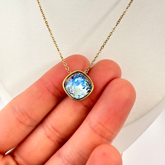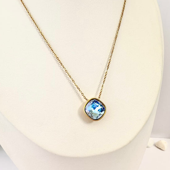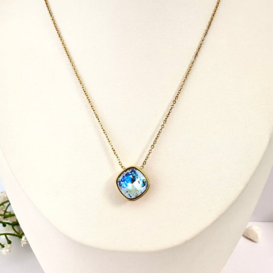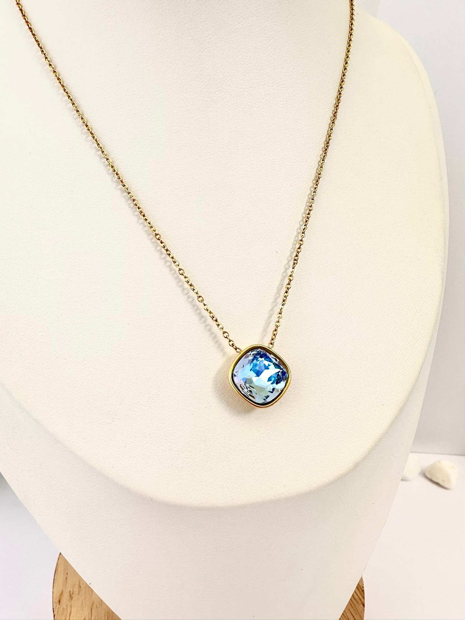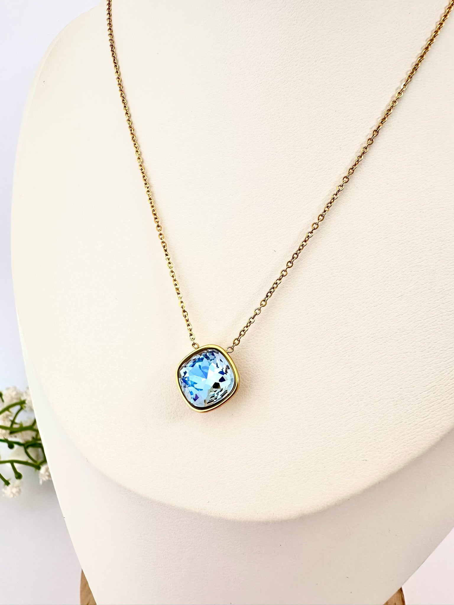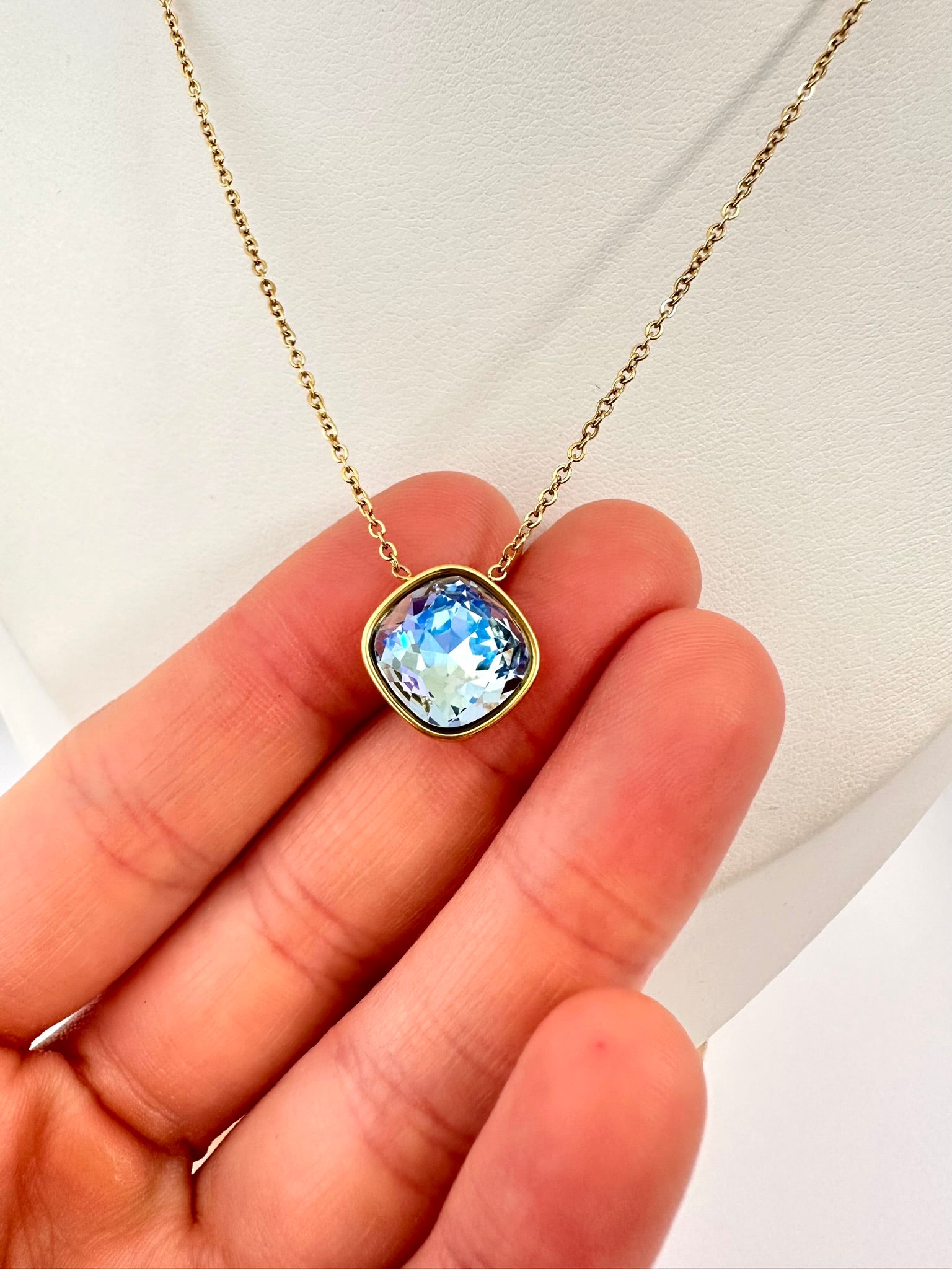 Este collar resalta por su cristal celeste facetado que refleja la luz con elegancia y delicadeza. Enmarcado en un borde dorado, combina brillo y sofisticación en una pieza única. Ideal para quienes buscan un accesorio refinado que aporte un toque de color y distinción a cualquier look.