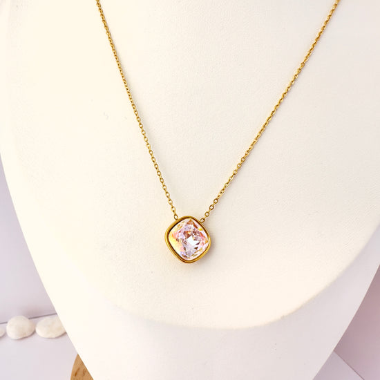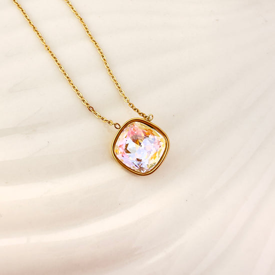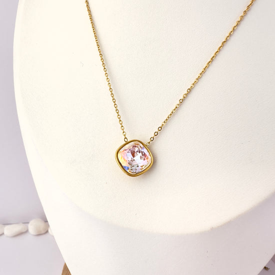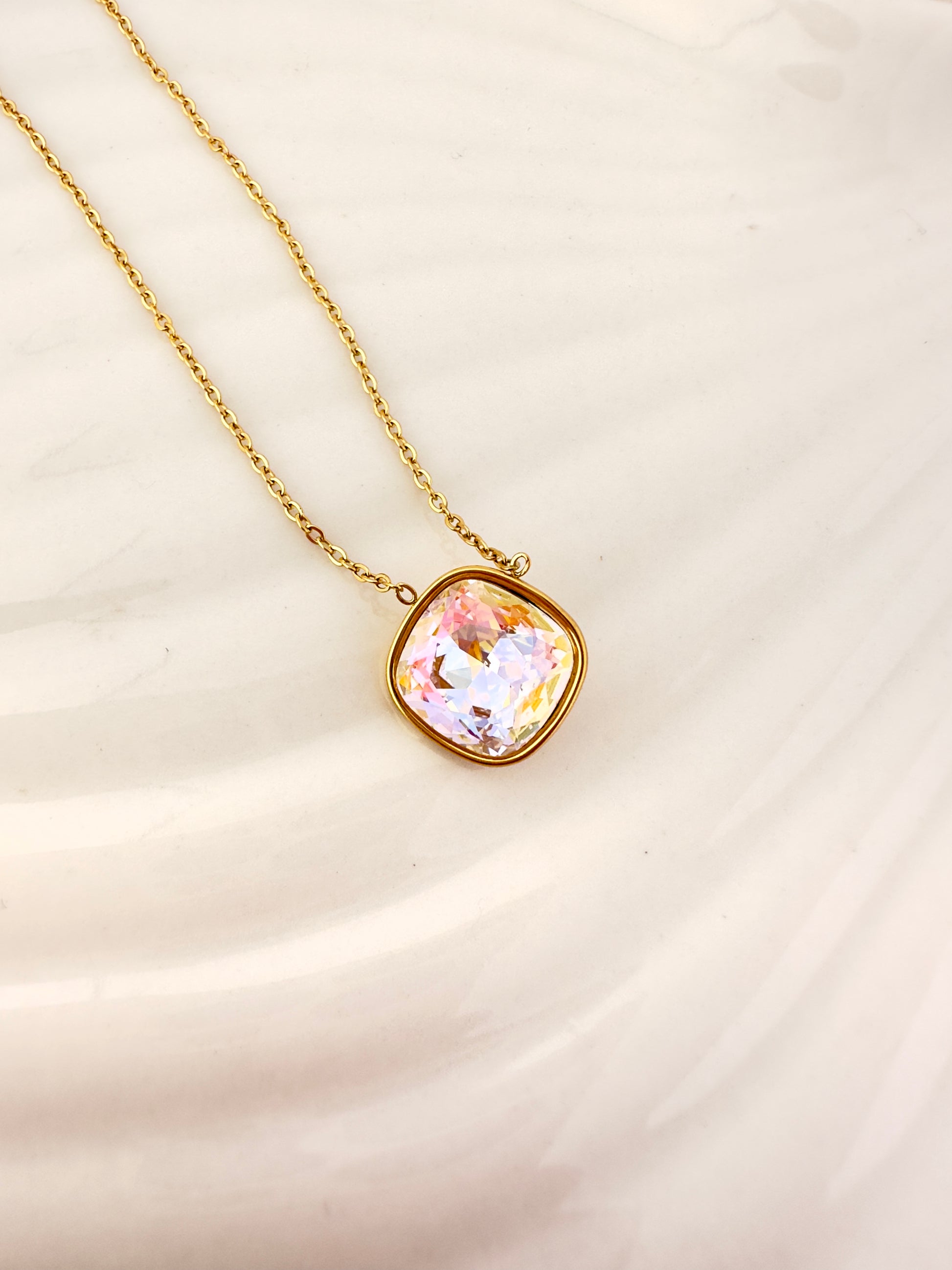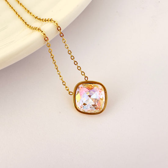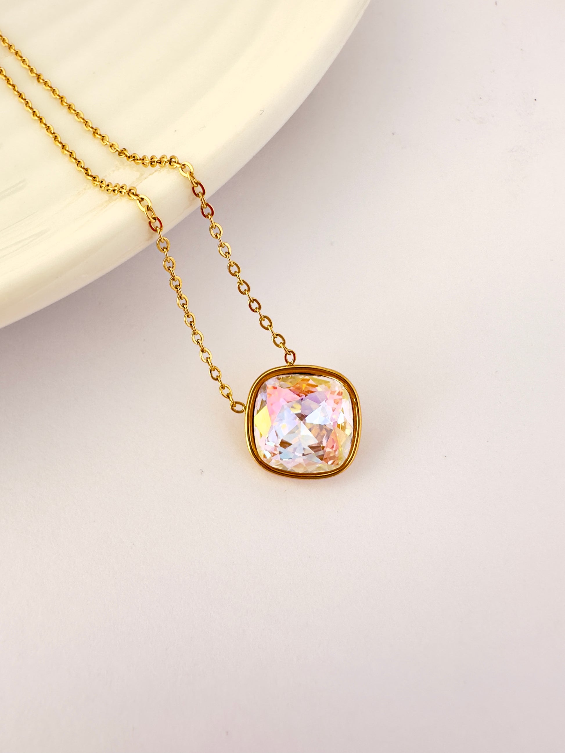 Collar enchapado en oro de 18 quilates (4 micras) con cadena fina y dije cuadrado con cristal facetado de efecto tornasol, que refleja distintos tonos según la luz. Una joya moderna y versátil, ideal para destacar en tu catálogo.