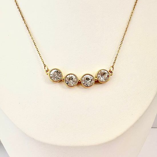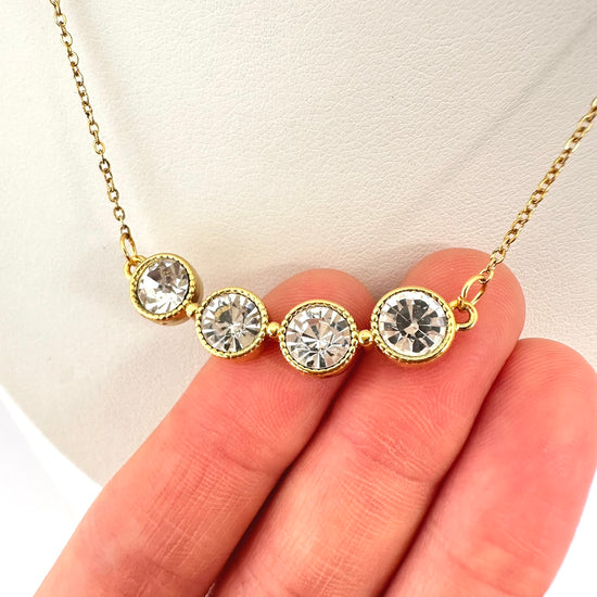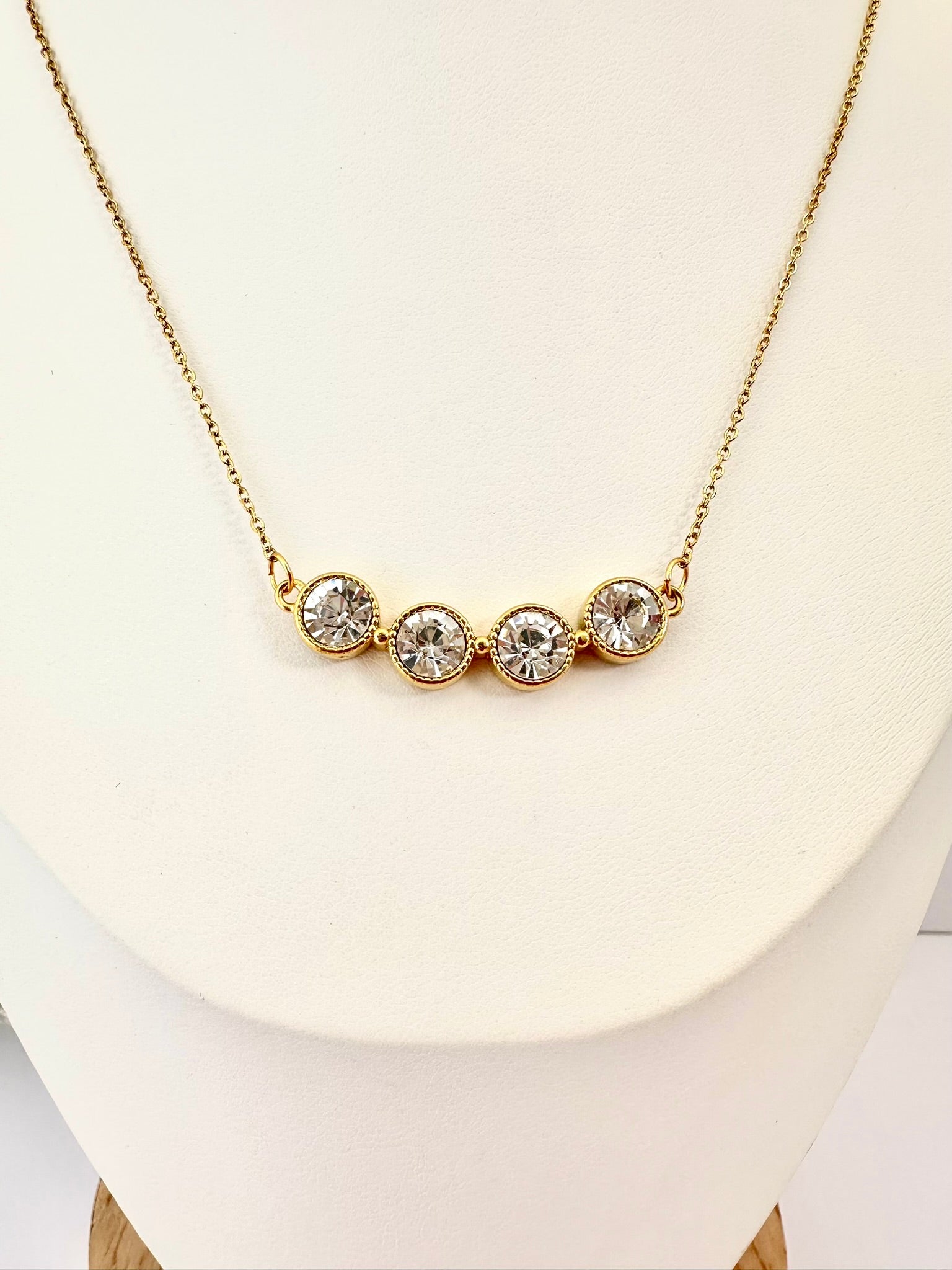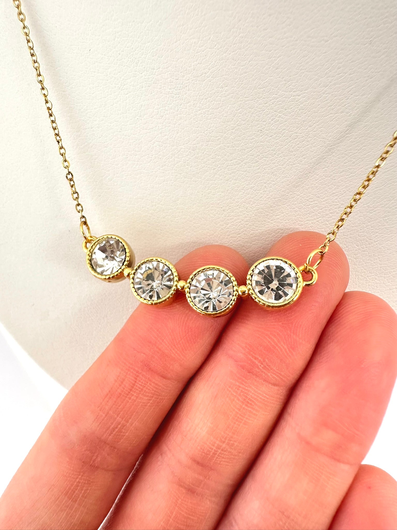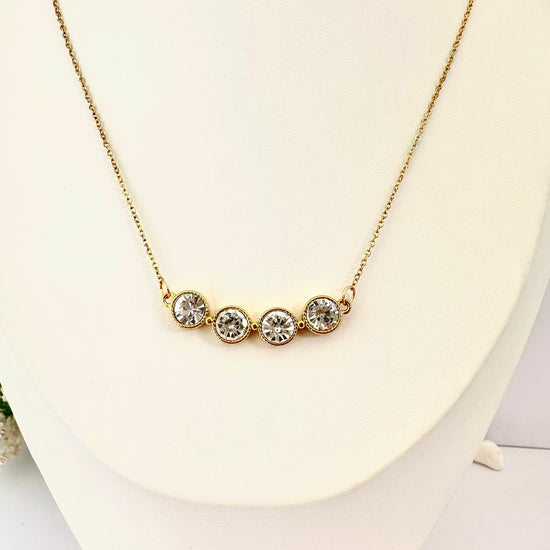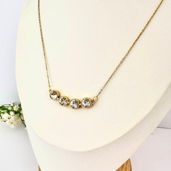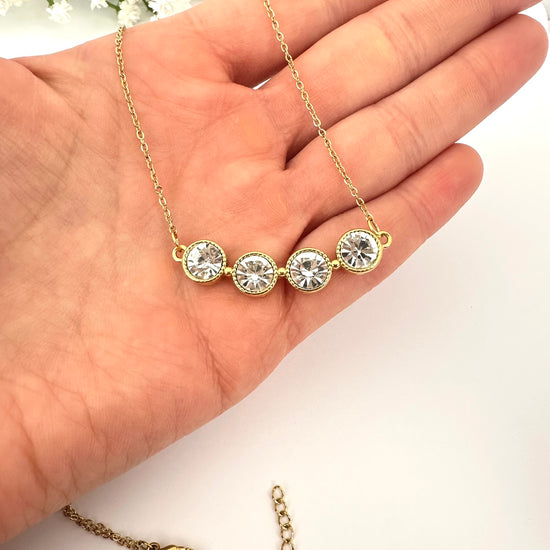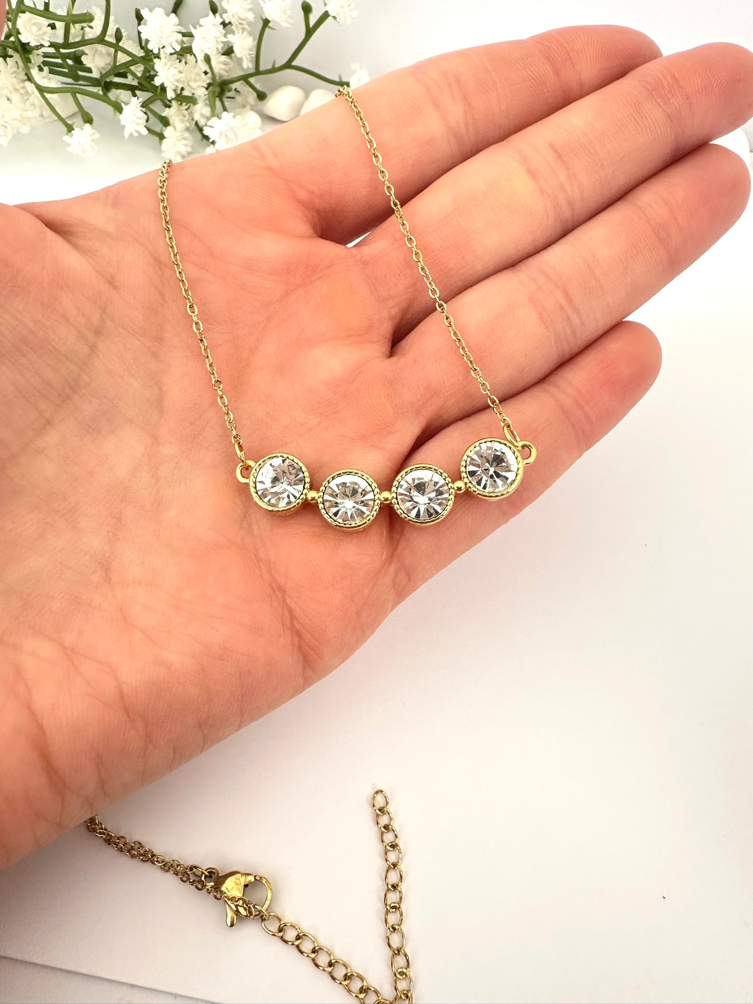 El Collar Brillos Dorados es una pieza que combina elegancia y minimalismo con un toque de luz único. Su diseño presenta cuatro cristales engastados que capturan la luz desde cualquier ángulo, creando reflejos delicados y sofisticados. Ideal para quienes buscan una joya clásica y atemporal que complemente tanto looks formales como casuales.