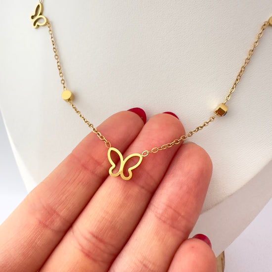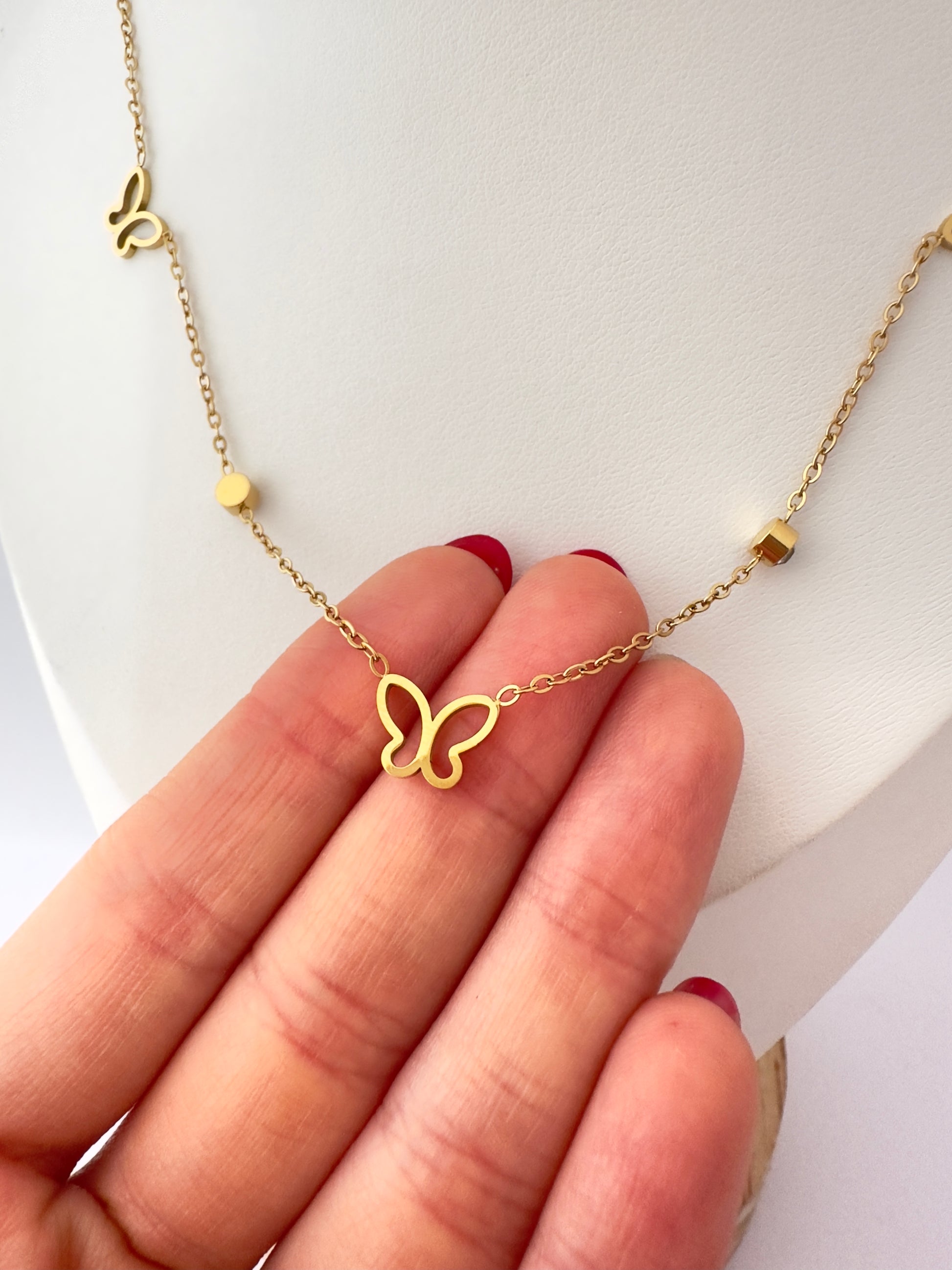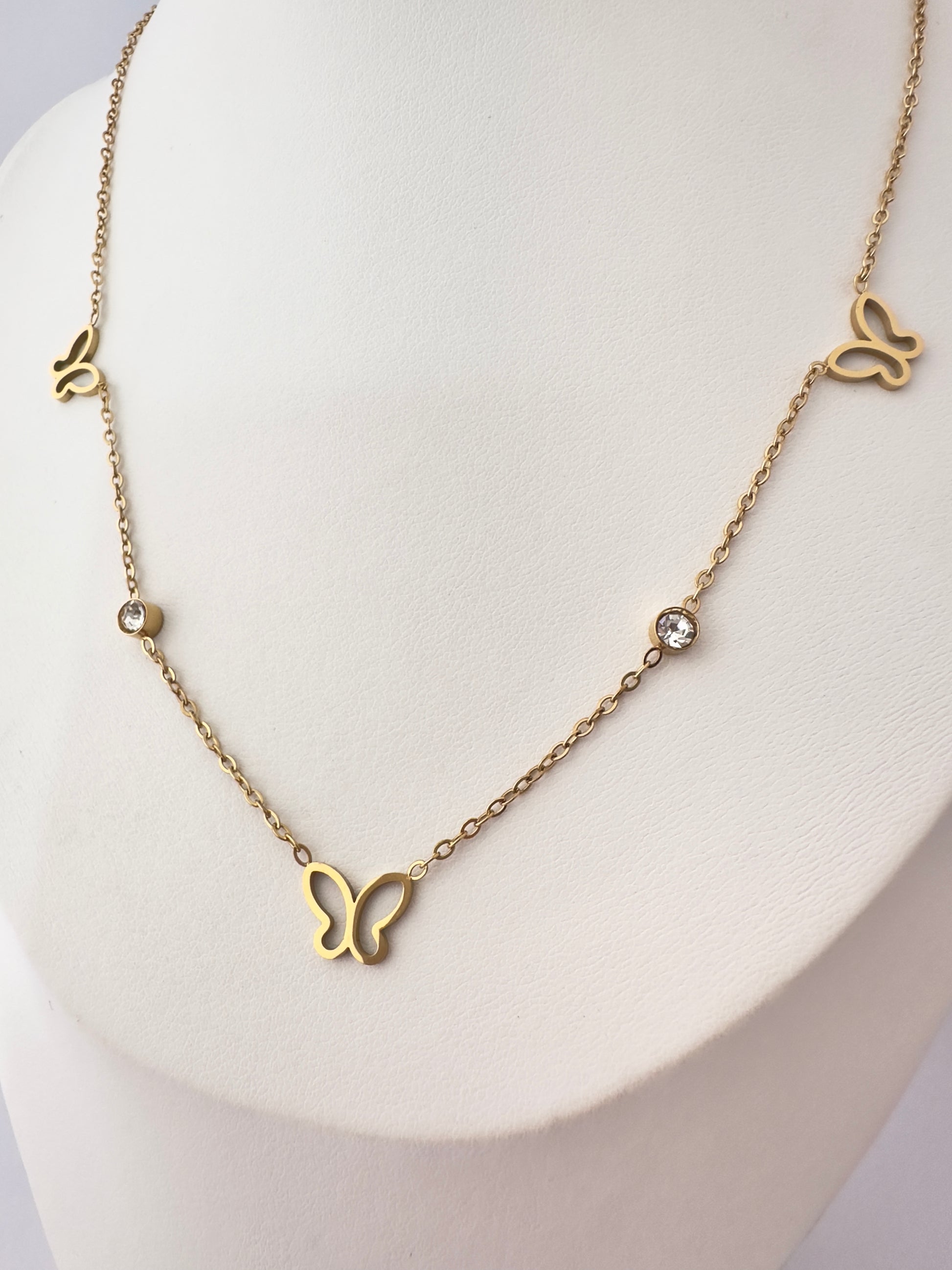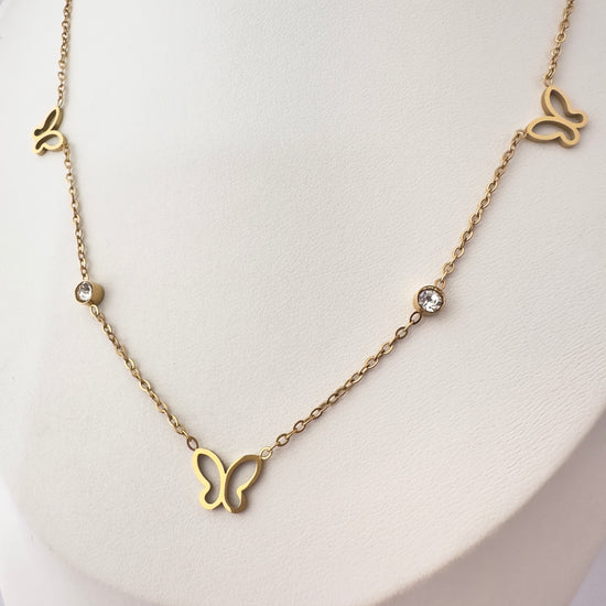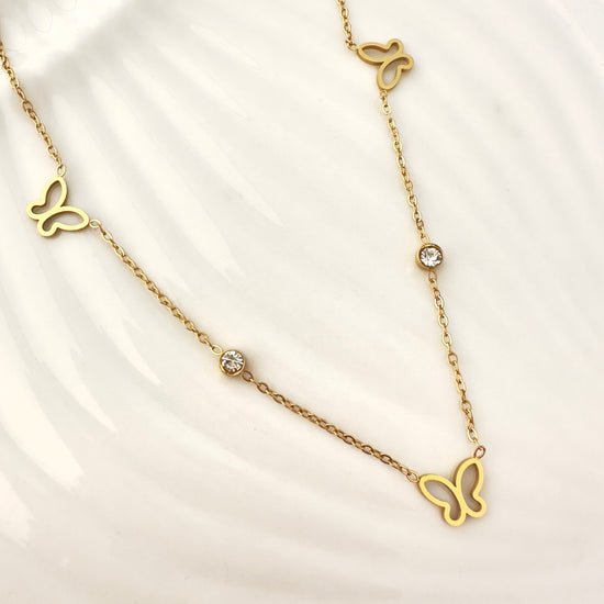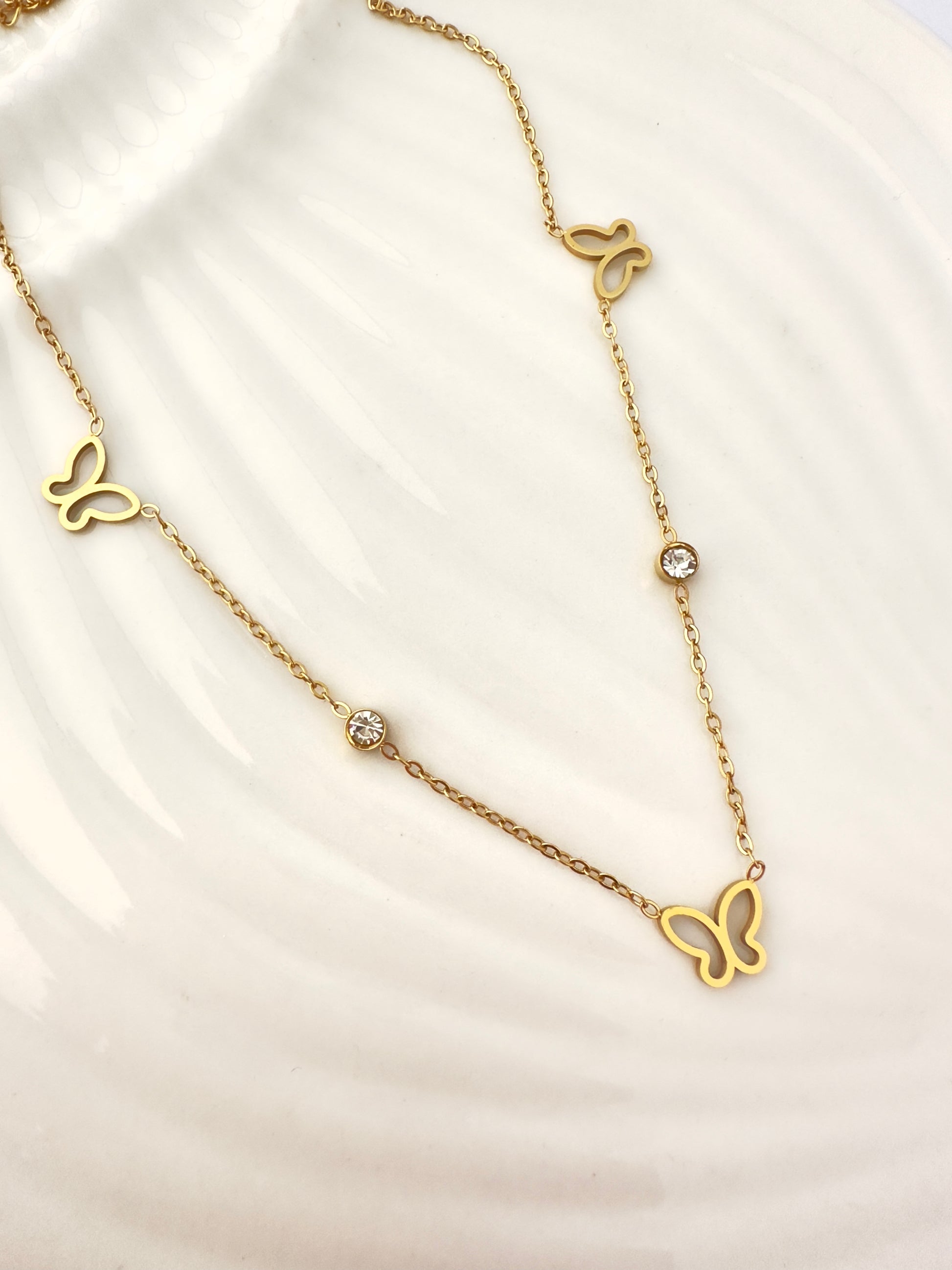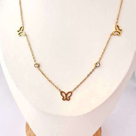 Sutil, delicado y simbólico. Este collar combina mariposas caladas con circones blancos que aportan brillo sin perder la ligereza. Un diseño pensado para quienes valoran la libertad, la renovación y la belleza natural.