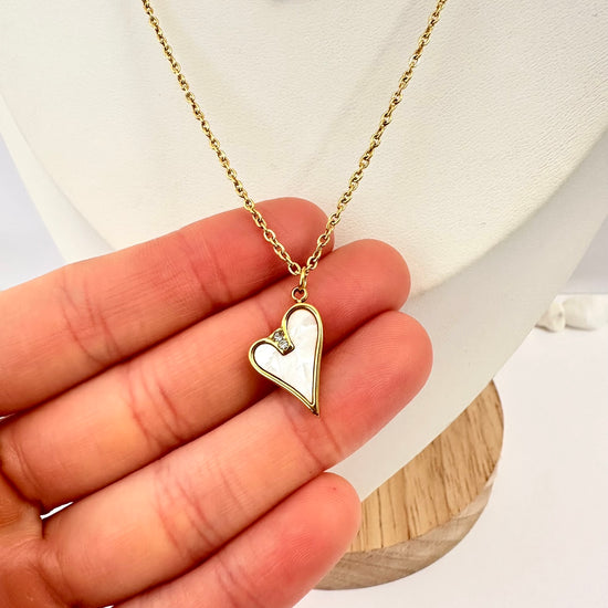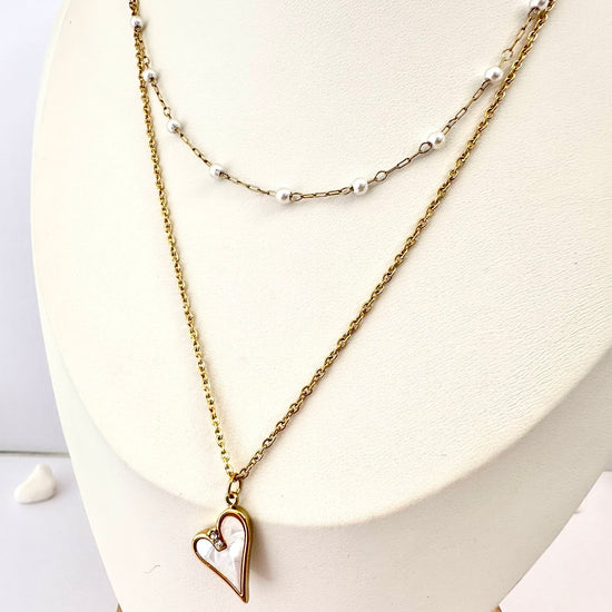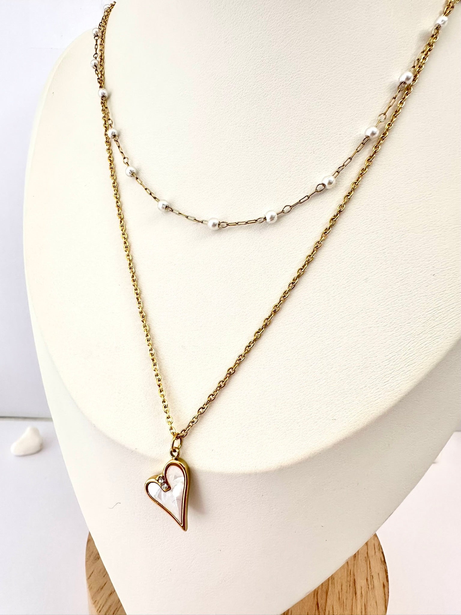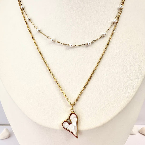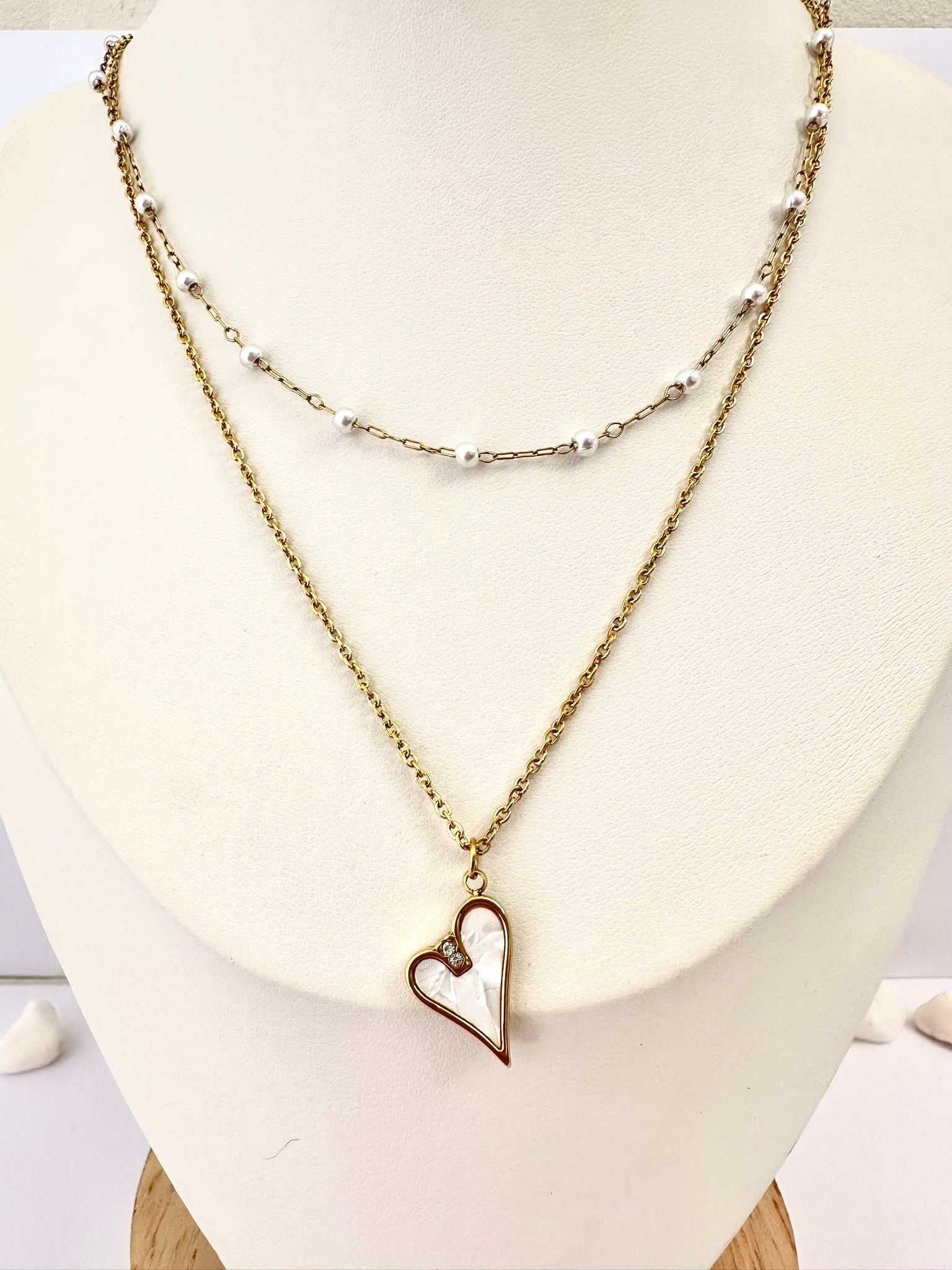 Este collar doble combina la delicadeza de pequeñas perlas con el brillo dorado y un dije en forma de corazón nácar. Su diseño equilibrado y romántico lo convierte en una pieza versátil, ideal para elevar cualquier outfit con un toque elegante y sutil. Representa amor, pureza y conexión.