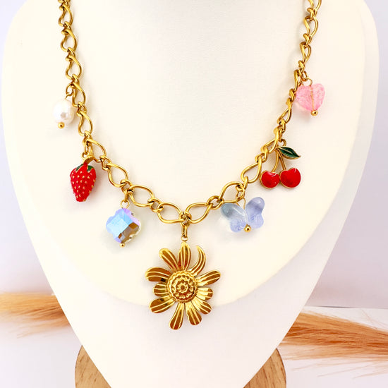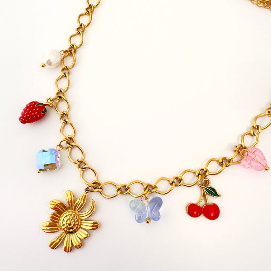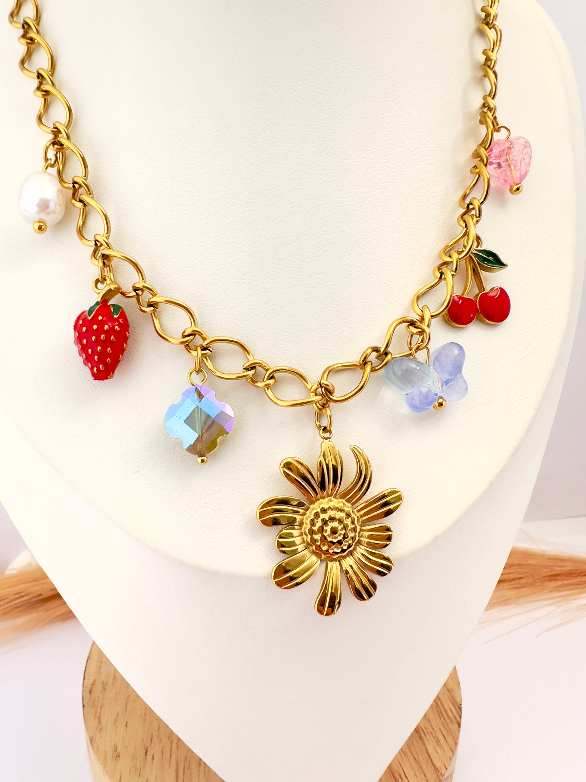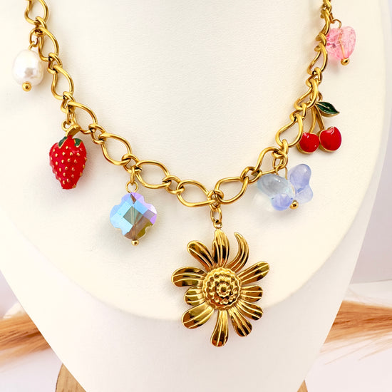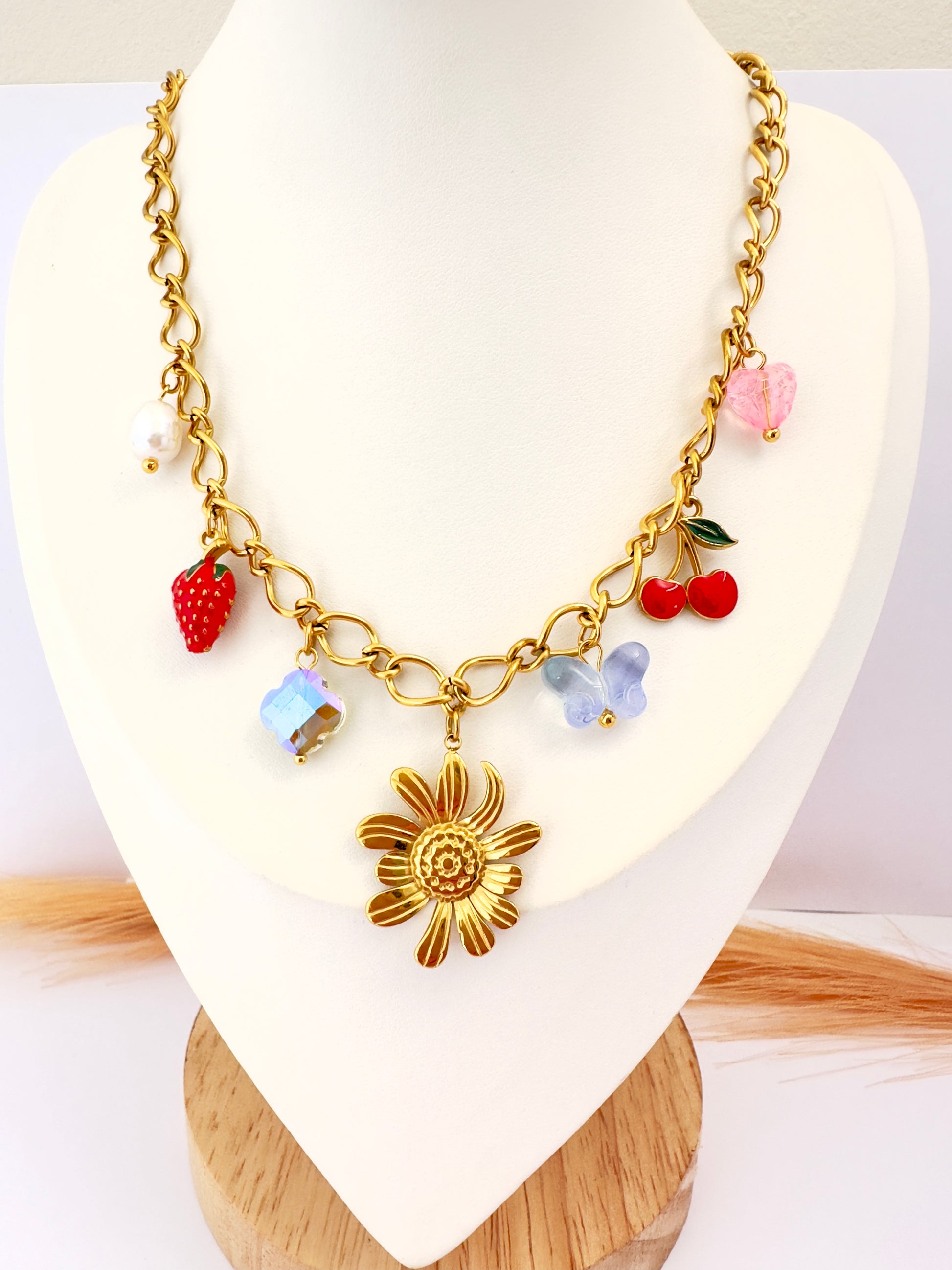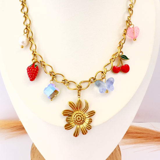Este collar con charms combina frutas, flores, mariposas y perlas sintéticas en una cadena dorada de eslabones, creando una pieza llamativa, alegre y con estilo.