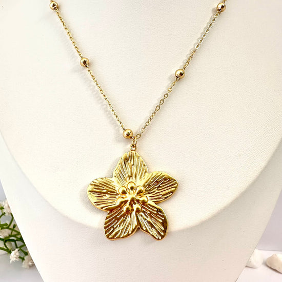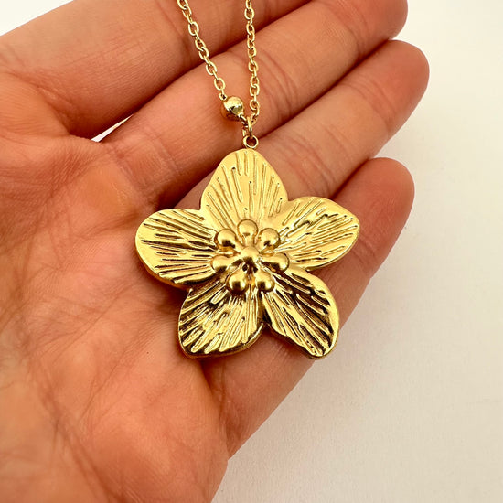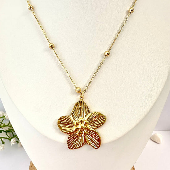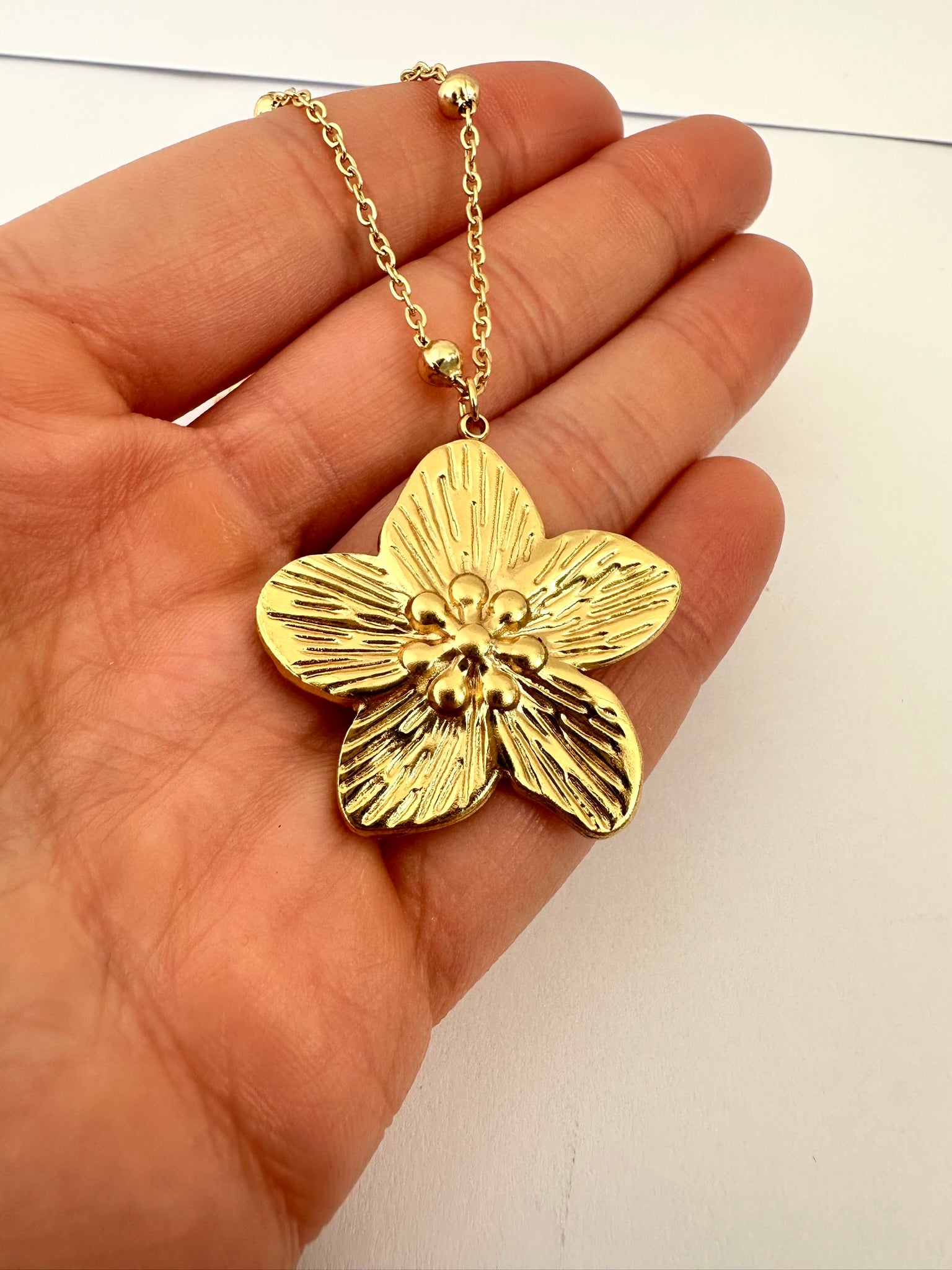 Este collar con dije en forma de flor dorada captura la esencia de la feminidad y la elegancia natural. Su textura detallada y su acabado brillante aportan un toque artístico y sofisticado, ideal para realzar cualquier look con una pieza única que simboliza belleza y crecimiento.