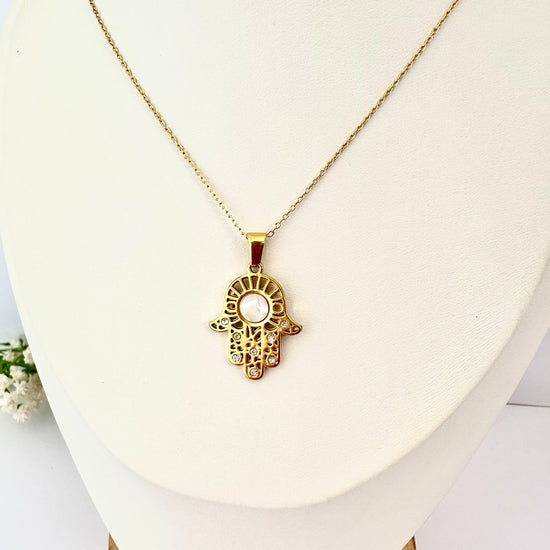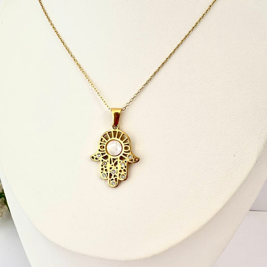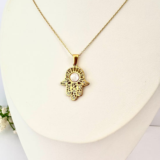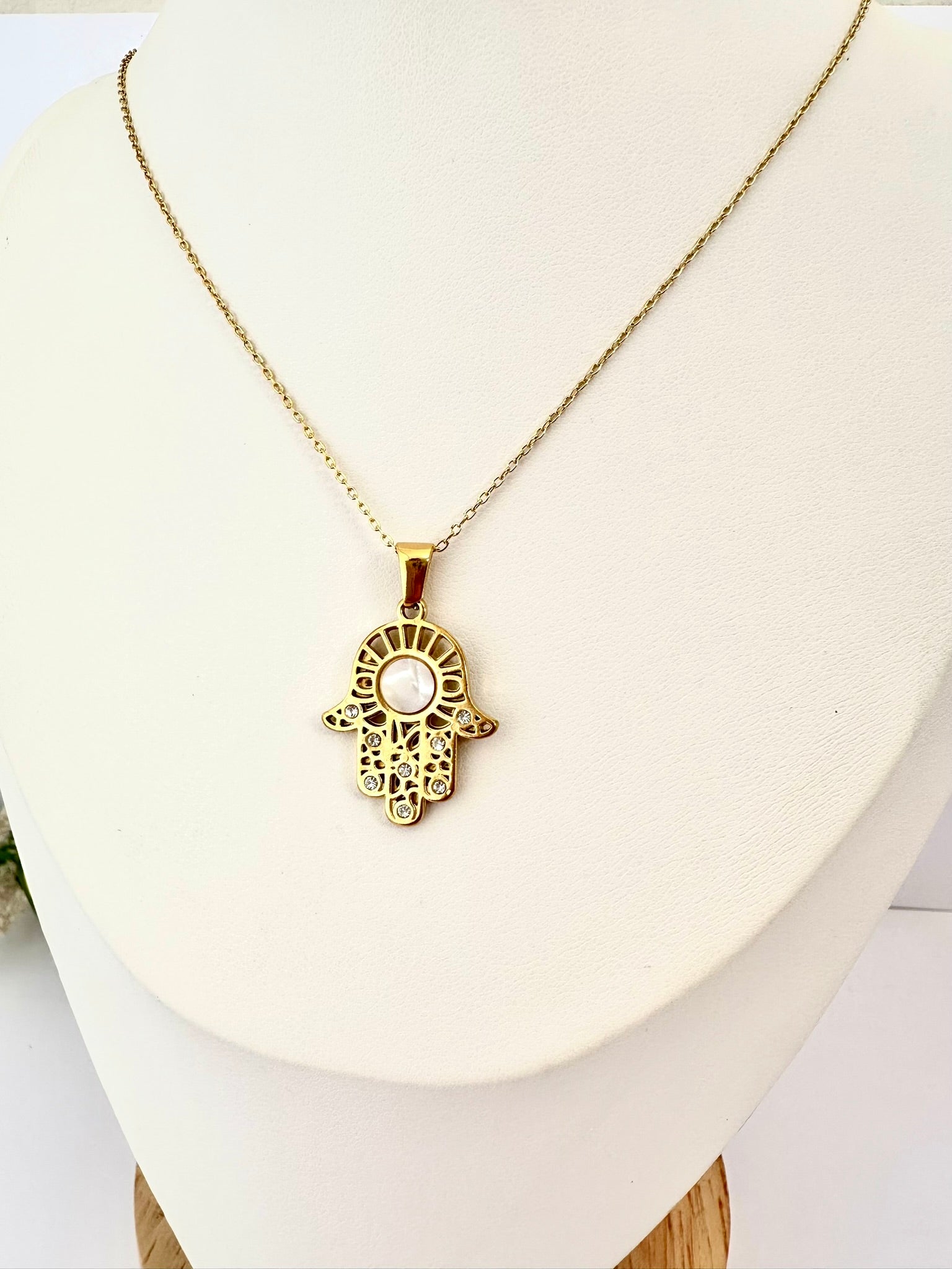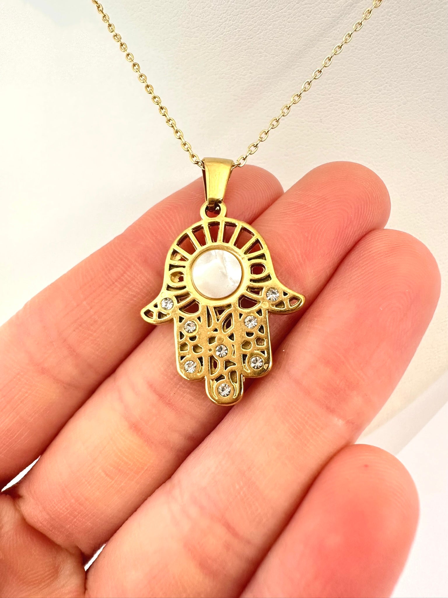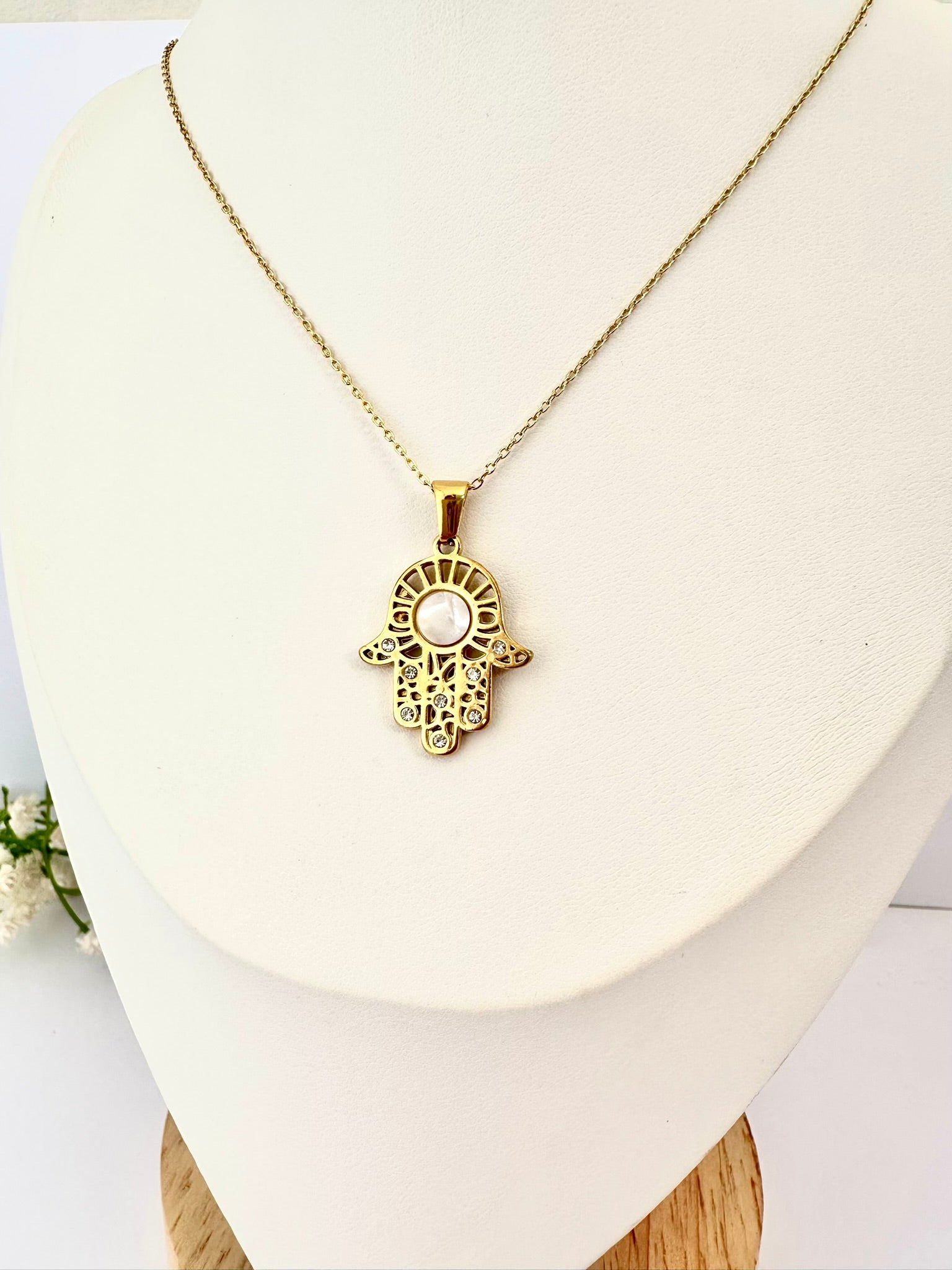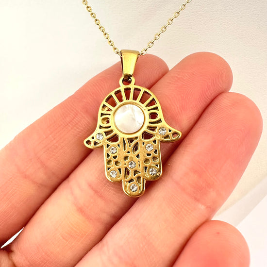 El Collar Mano de Fátima Dorado simboliza protección, energía positiva y buena suerte. Su diseño combina una estructura calada en dorado con un centro nacarado que aporta un brillo suave y elegante. Es una joya cargada de significado, ideal para quienes buscan un accesorio con estilo y propósito.