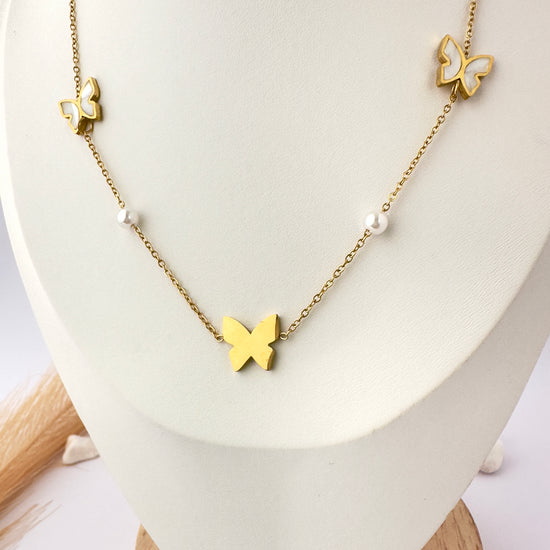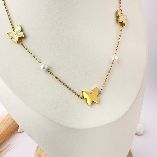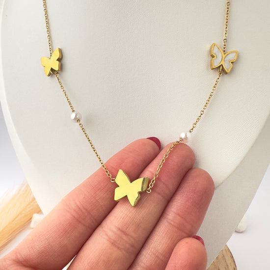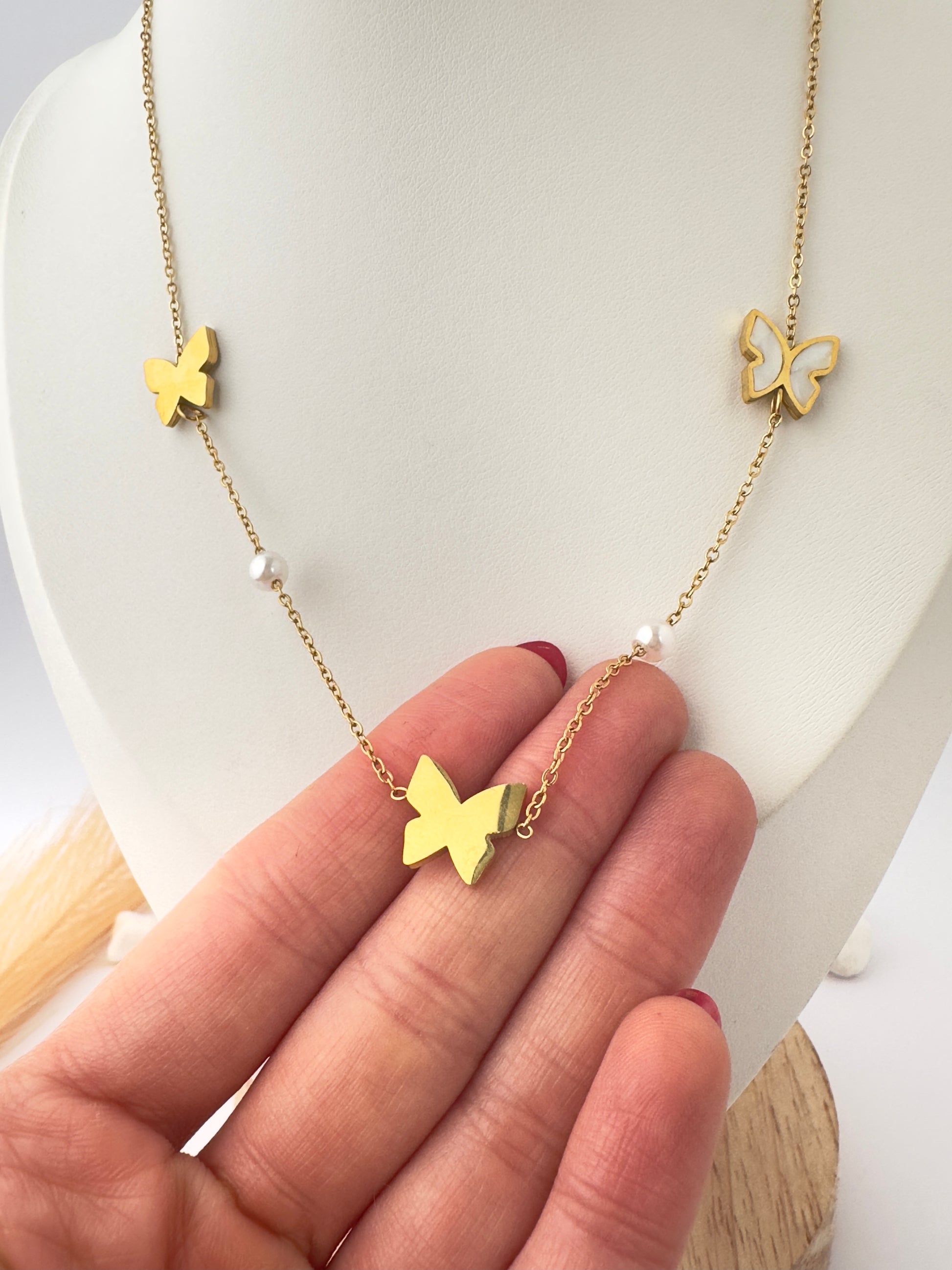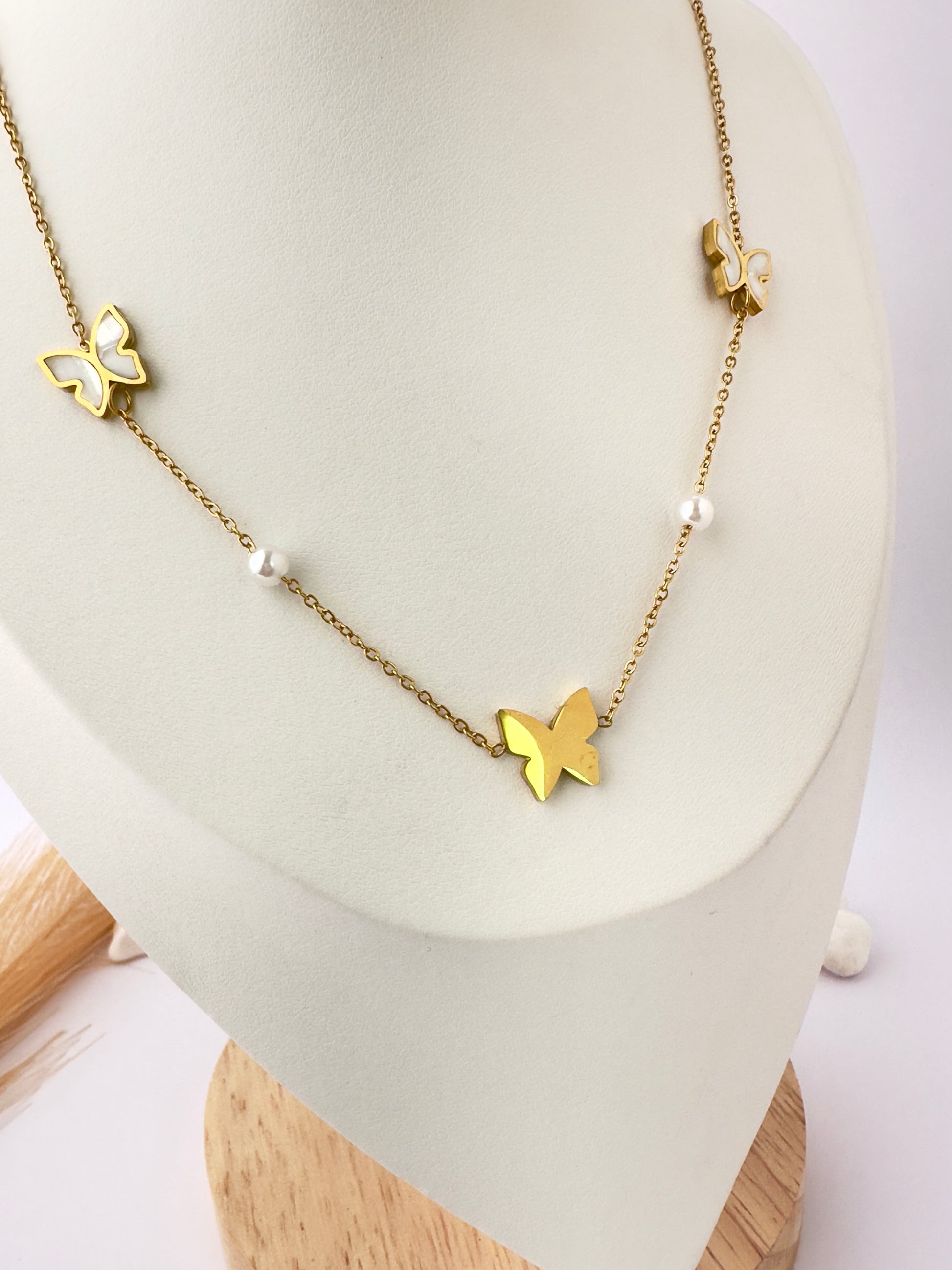 Un diseño femenino y delicado que combina mariposas doradas con pequeñas perlas blancas para crear una joya armoniosa, luminosa y simbólica. Ideal para quienes buscan transmitir ligereza, renovación y belleza natural en su estilo.
