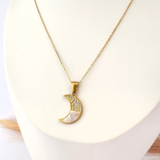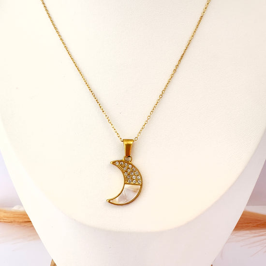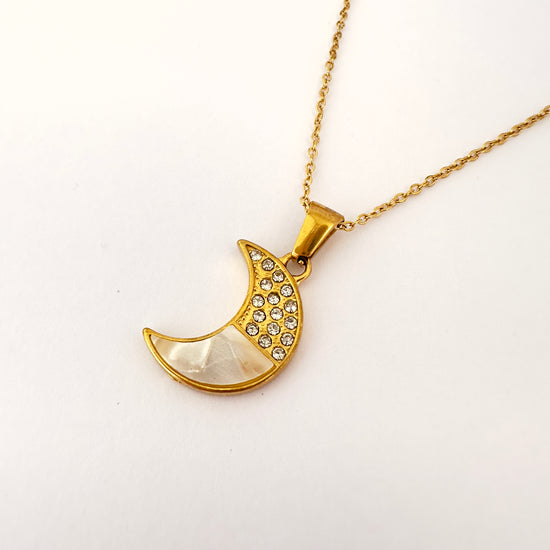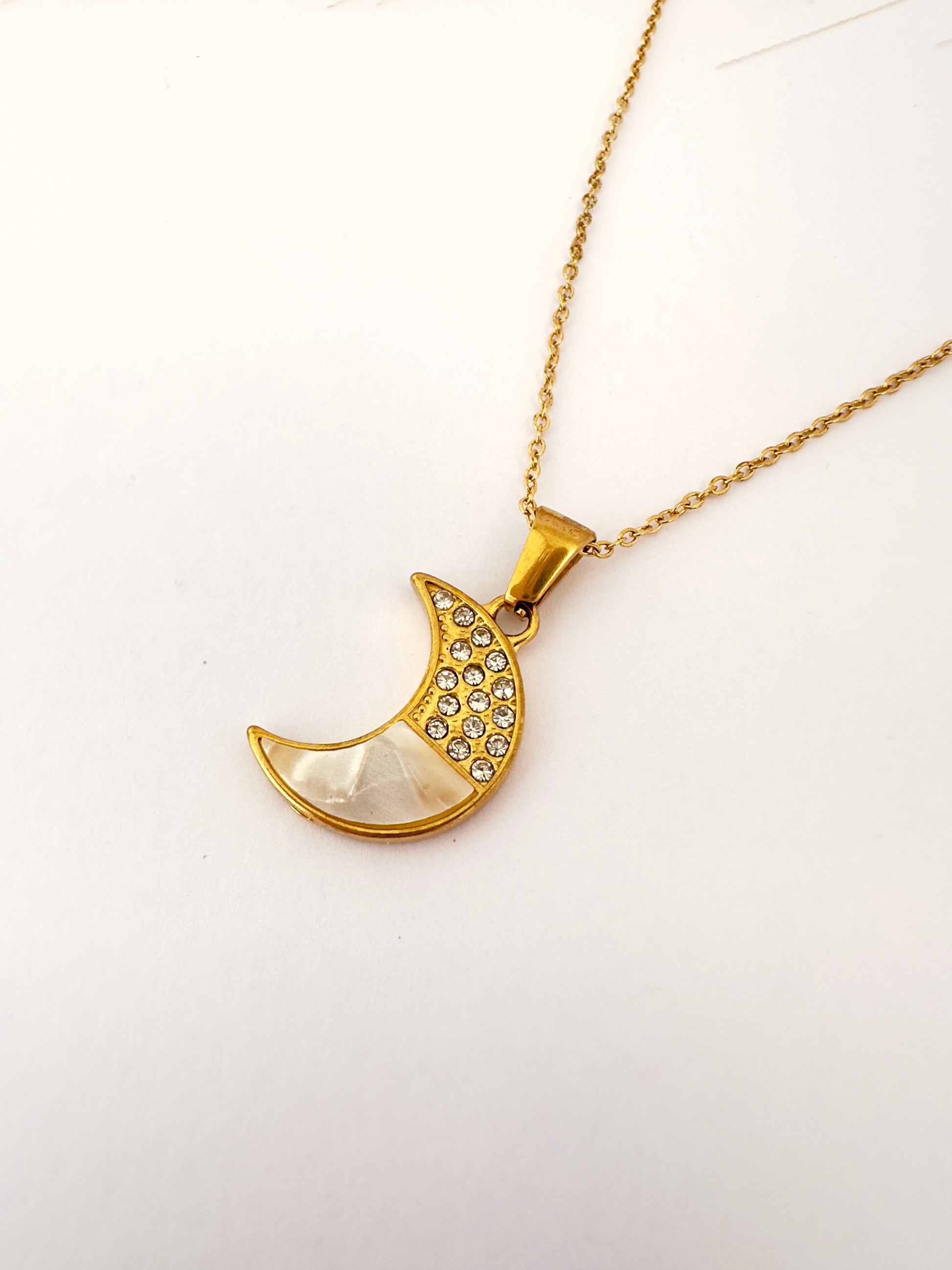 🌙 Dije: Forma de luna creciente con incrustaciones de circonitas y detalles en nácar natural