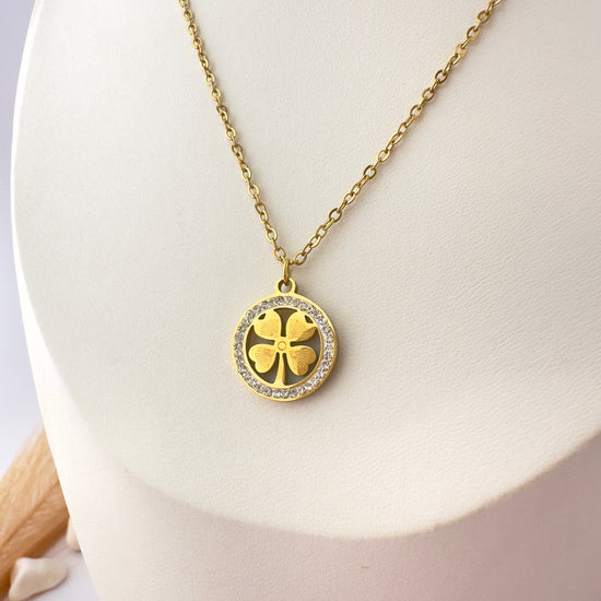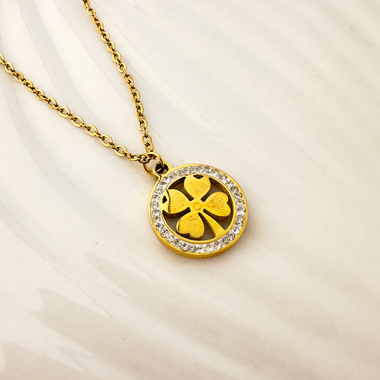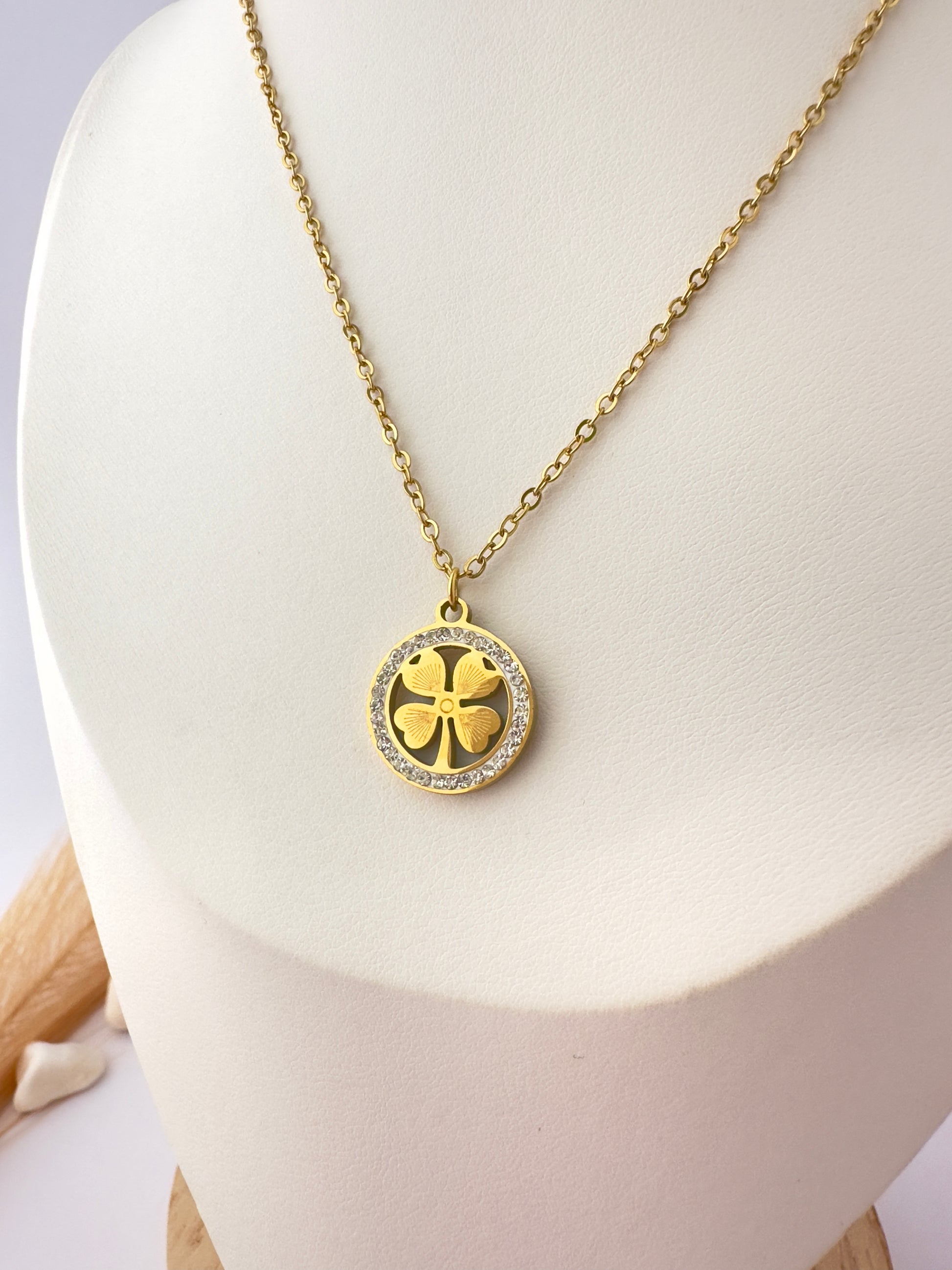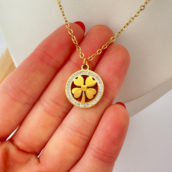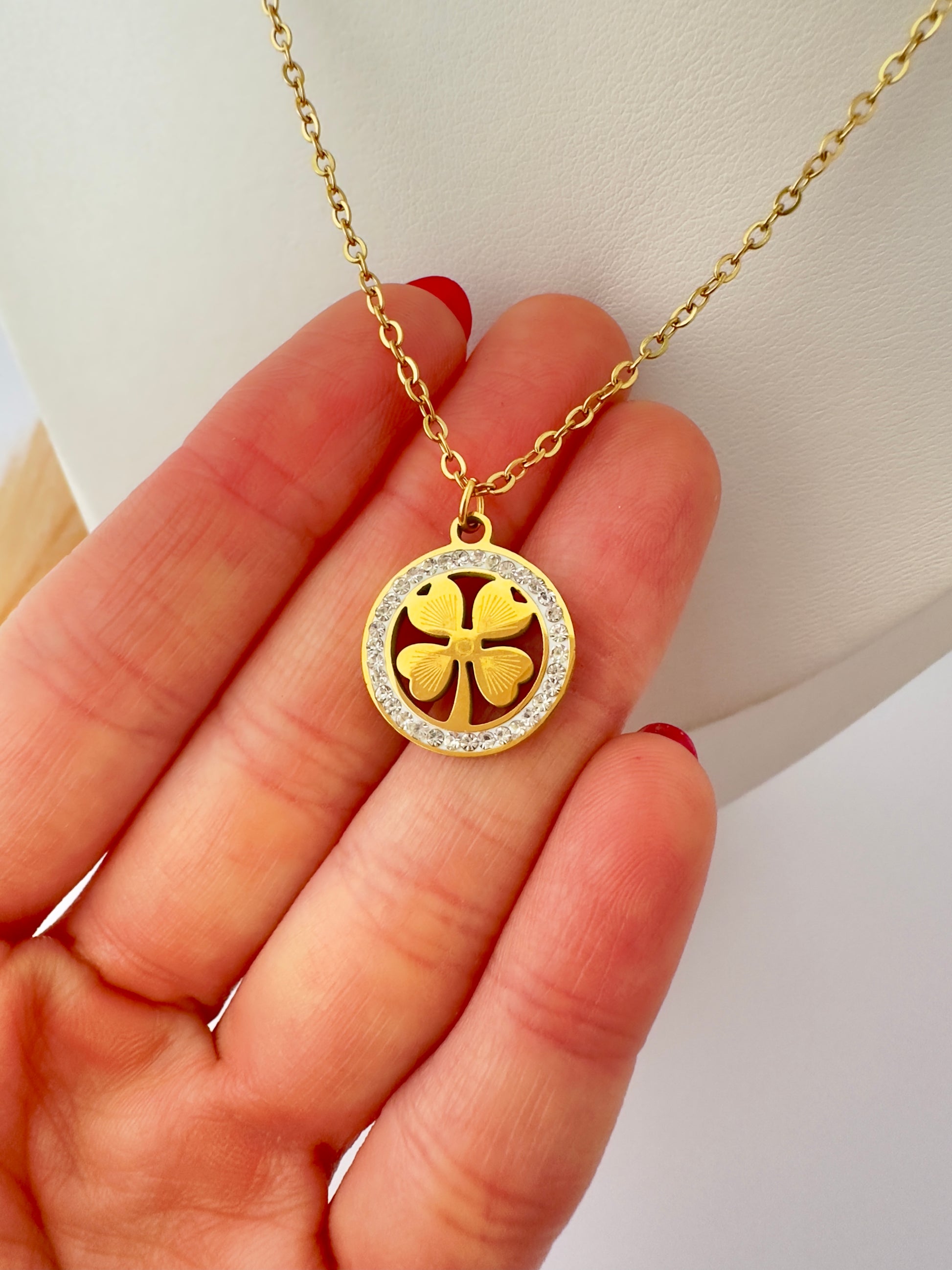 Un amuleto moderno y lleno de energía positiva. Este collar con dije de trébol calado, rodeado de circones brillantes, es ideal para quienes buscan atraer buena fortuna sin perder el estilo. Su diseño circular simboliza plenitud y protección.