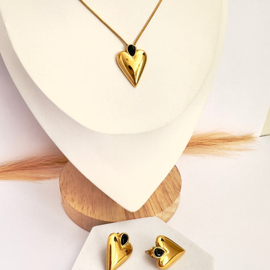 Moderno, audaz y con una personalidad arrolladora. Este conjunto reinventa el clásico símbolo del corazón con un toque de contraste sofisticado, gracias a la profundidad del detalle en color negro.