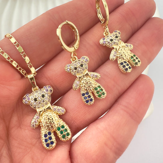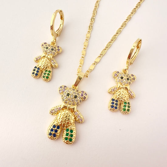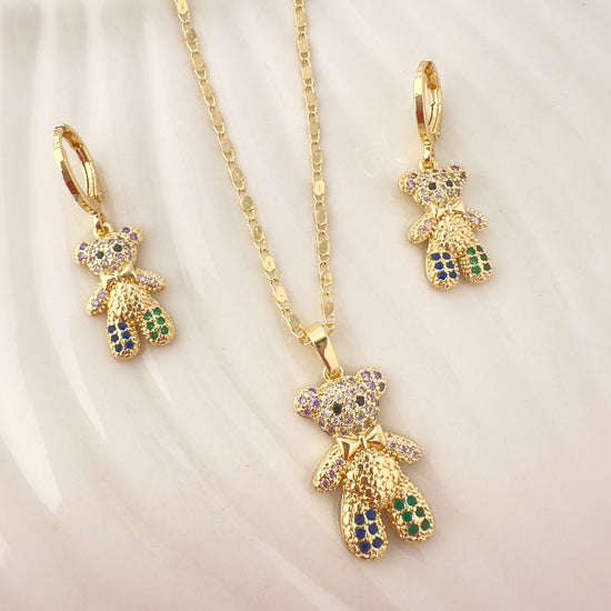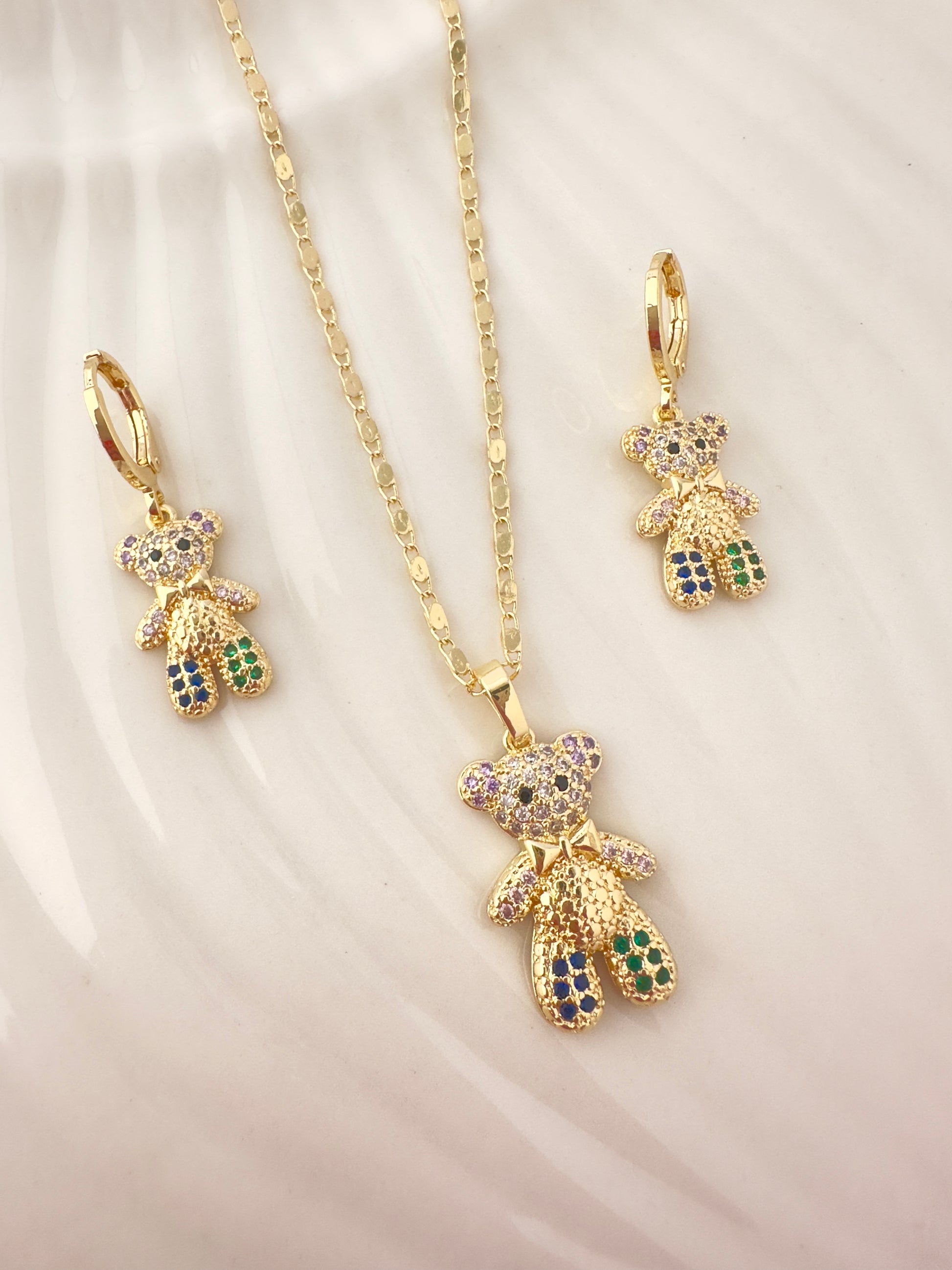Un diseño tierno y llamativo que mezcla el encanto infantil con el brillo sofisticado de las circonitas. Este set incluye un collar y pendientes a juego con ositos enchapados en oro y decorados con cristales multicolor, ideales para dar un toque divertido y elegante a cualquier look.